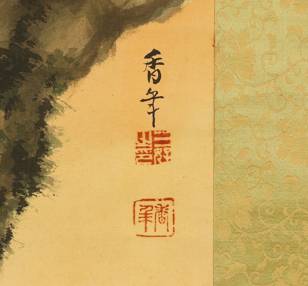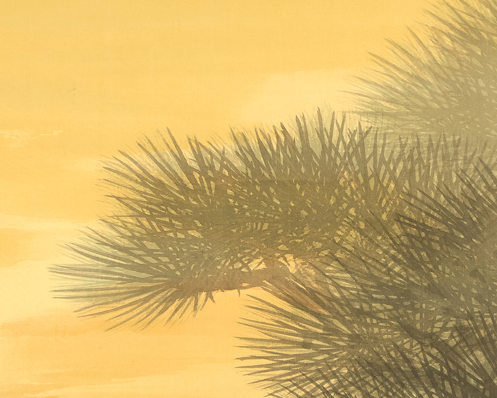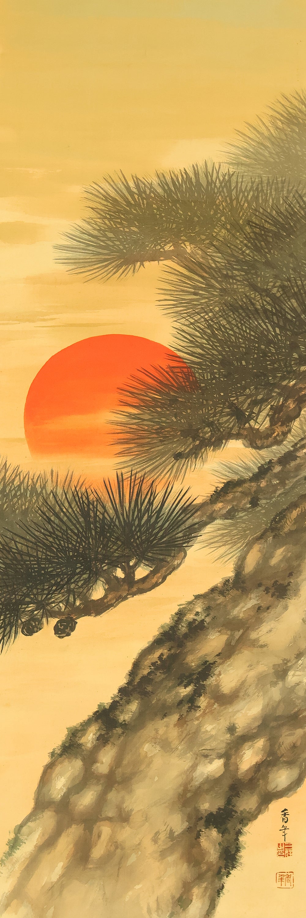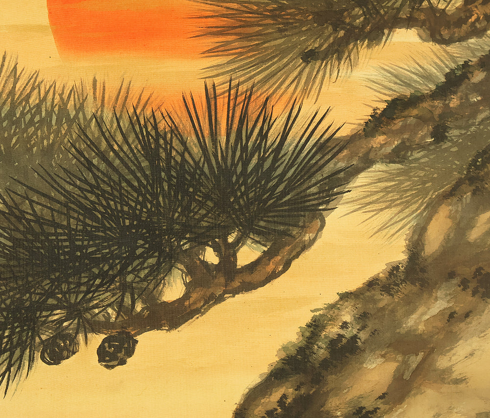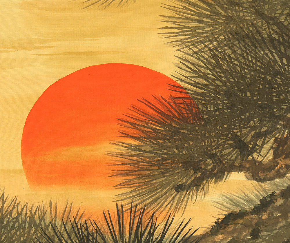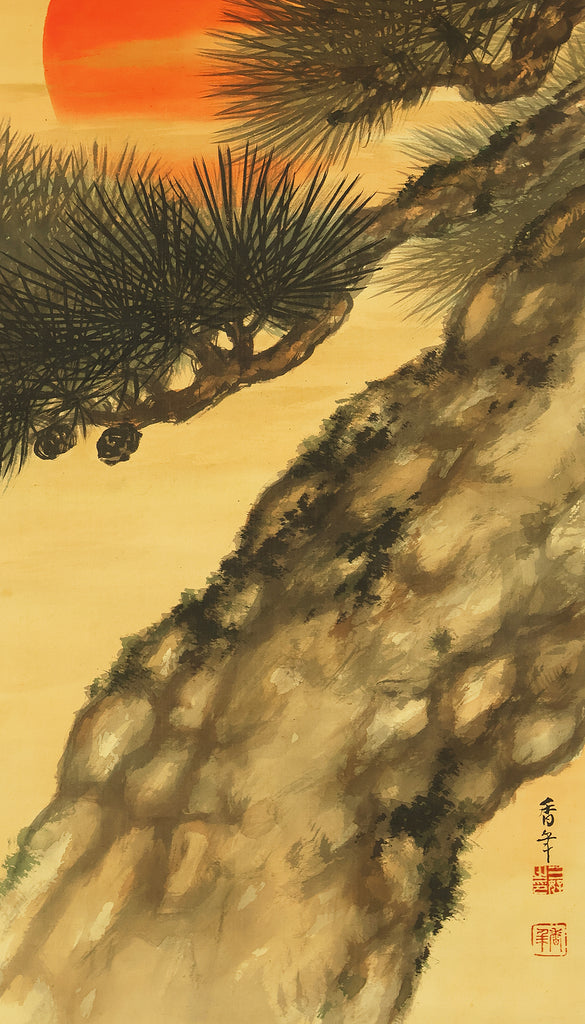 This evocative hanging scroll by Miyoshi Konen captures the tranquil majesty of a rising sun behind a pine tree, a motif rich in symbolism across Japanese art. The vivid red sun emerges through a warm golden sky, casting light over the rugged pine—an emblem of resilience, longevity, and quiet strength. The composition balances bold color with delicate brushwork, creating a serene yet powerful atmosphere that evokes renewal and harmony with nature. Executed in traditional style, the scroll bears the signature “Konen” (香年) and seals “Miyoshi no in” (三好之印) and “Konen” (香年), affirming its authenticity. Mounted as a kakejiku, it offers both seasonal beauty and contemplative depth, making it a compelling piece for collectors and admirers of classical Japanese aesthetics.