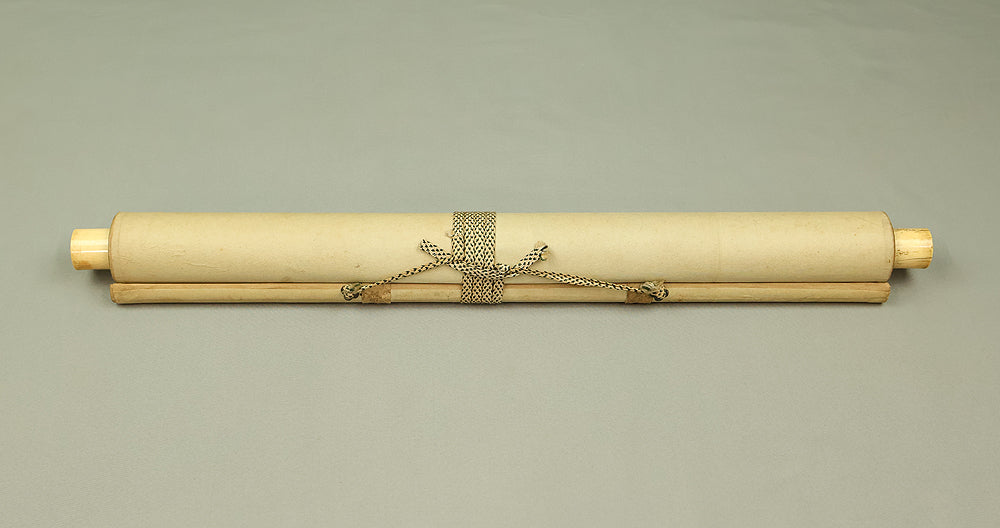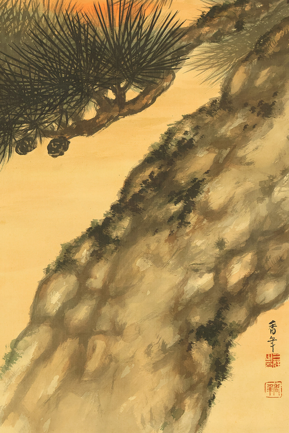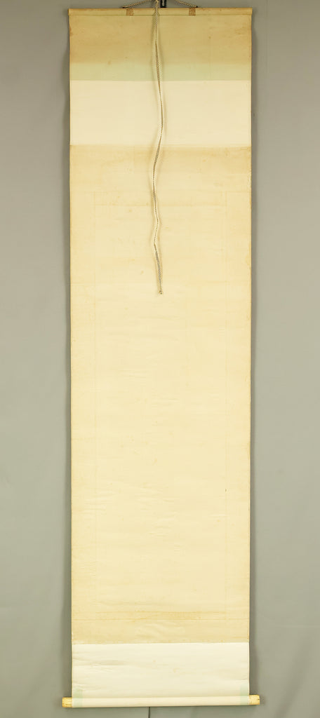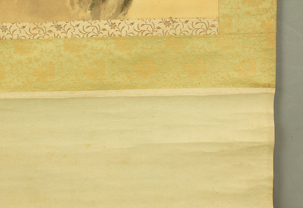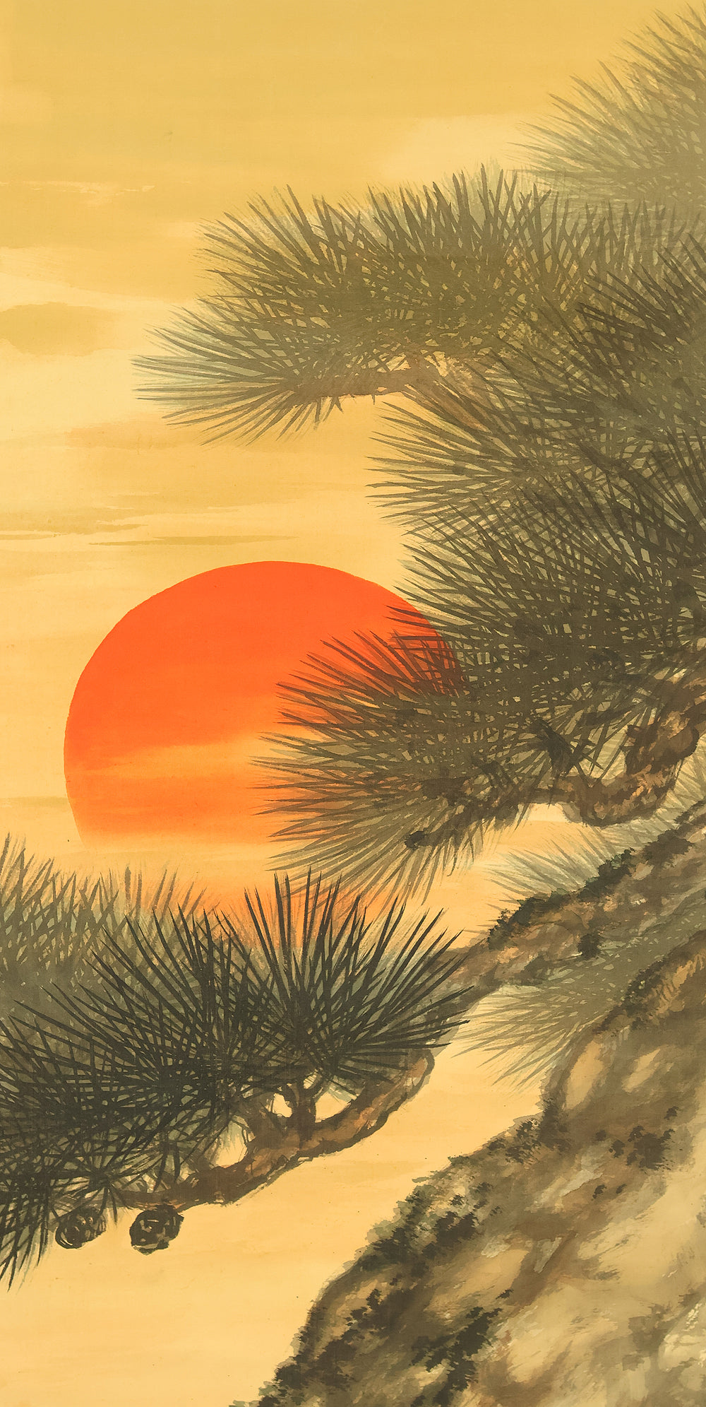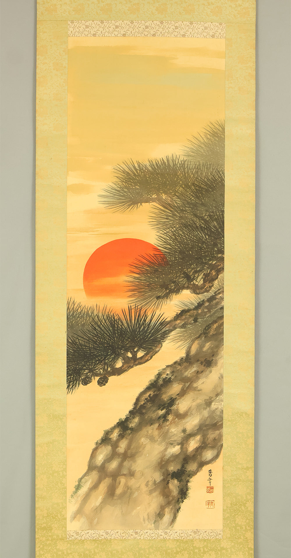 This evocative hanging scroll by Miyoshi Konen captures the tranquil majesty of a rising sun behind a pine tree, a motif rich in symbolism across Japanese art. The vivid red sun emerges through a warm golden sky, casting light over the rugged pine—an emblem of resilience, longevity, and quiet strength. The composition balances bold color with delicate brushwork, creating a serene yet powerful atmosphere that evokes renewal and harmony with nature. Executed in traditional style, the scroll bears the signature “Konen” (香年) and seals “Miyoshi no in” (三好之印) and “Konen” (香年), affirming its authenticity. Mounted as a kakejiku, it offers both seasonal beauty and contemplative depth, making it a compelling piece for collectors and admirers of classical Japanese aesthetics.