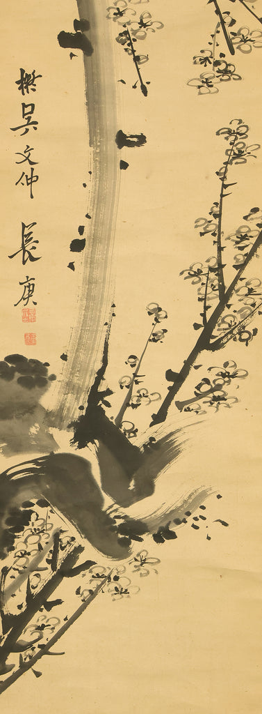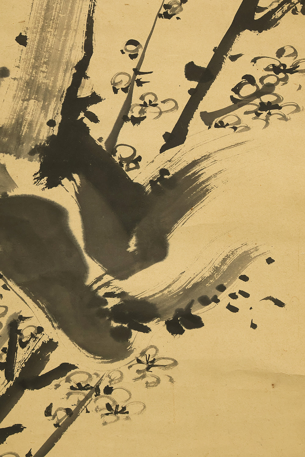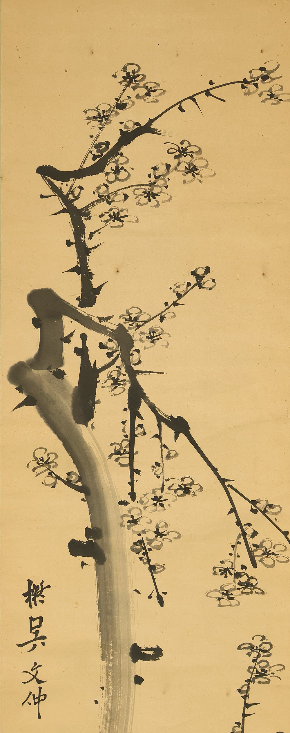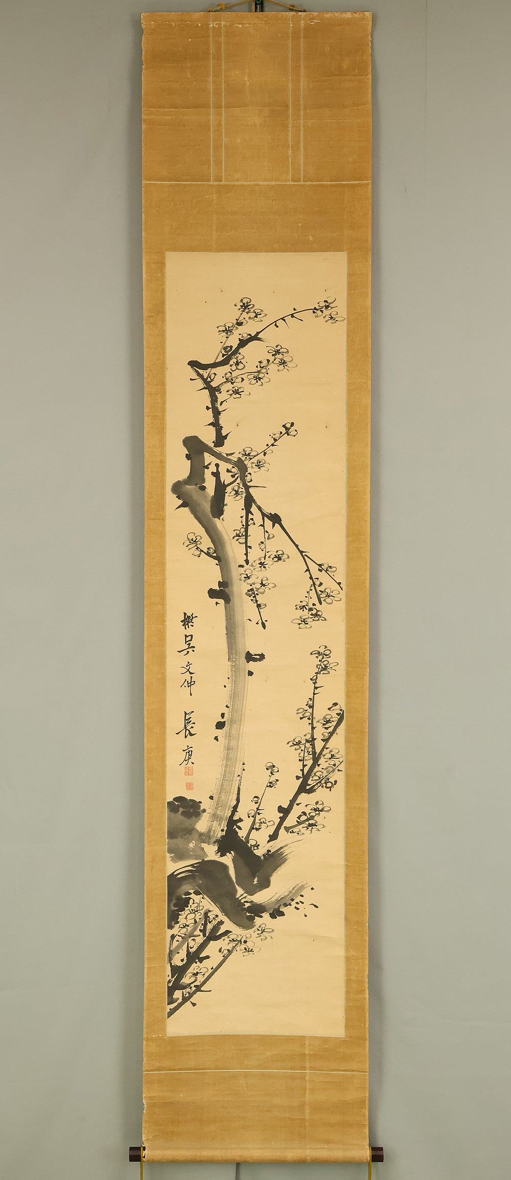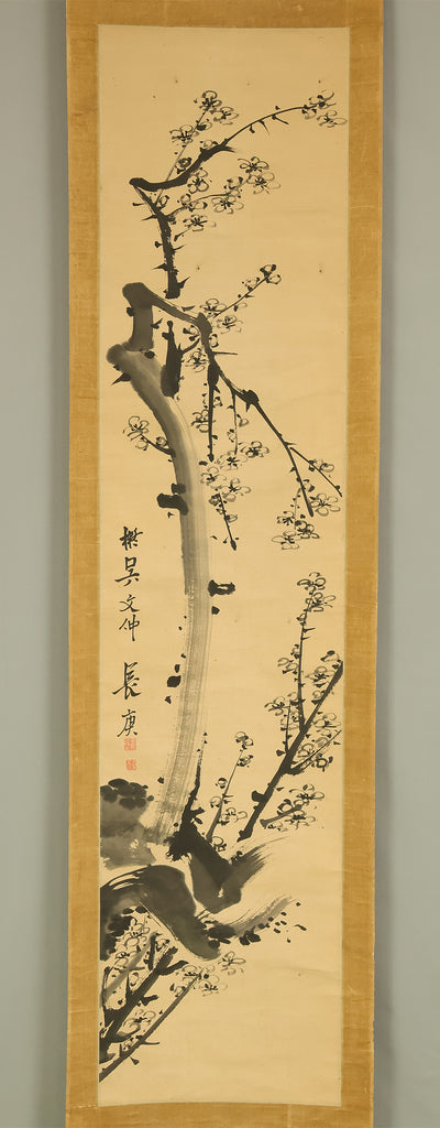 A masterful ink painting of a blossoming plum tree rendered in suiboku style, this hanging scroll by Yosa Buson (1716–1784) exemplifies the poetic depth and literati elegance for which he is celebrated. The gnarled trunk and delicate blossoms are executed with expressive brushwork and tonal subtlety, evoking both the resilience of winter and the quiet anticipation of spring. Above the signature appears the inscription “擬 呉文仲”, indicating Buson’s respectful emulation of the Chinese painter Wu Wen-zhong, whose style he admired and adapted—an homage that reflects Buson’s deep engagement with Chinese literati traditions. Signed “Chōko” (長庚) and sealed “Sanka Koji” (三果居士) and “Tosei” (東成), the scroll bears Buson’s mature artistic identity, blending haikai sensibility with painterly lyricism. As one of the three great haiku masters of the Edo period—alongside Matsuo Bashō and Kobayashi Issa—Buson’s visual art shares the same realism, romance, and seasonal nuance that define his poetry. This work, accompanied by a box, stands as a rare and refined example of mid-Edo literati painting, where brush, verse, and reverence for tradition converge in quiet brilliance.
