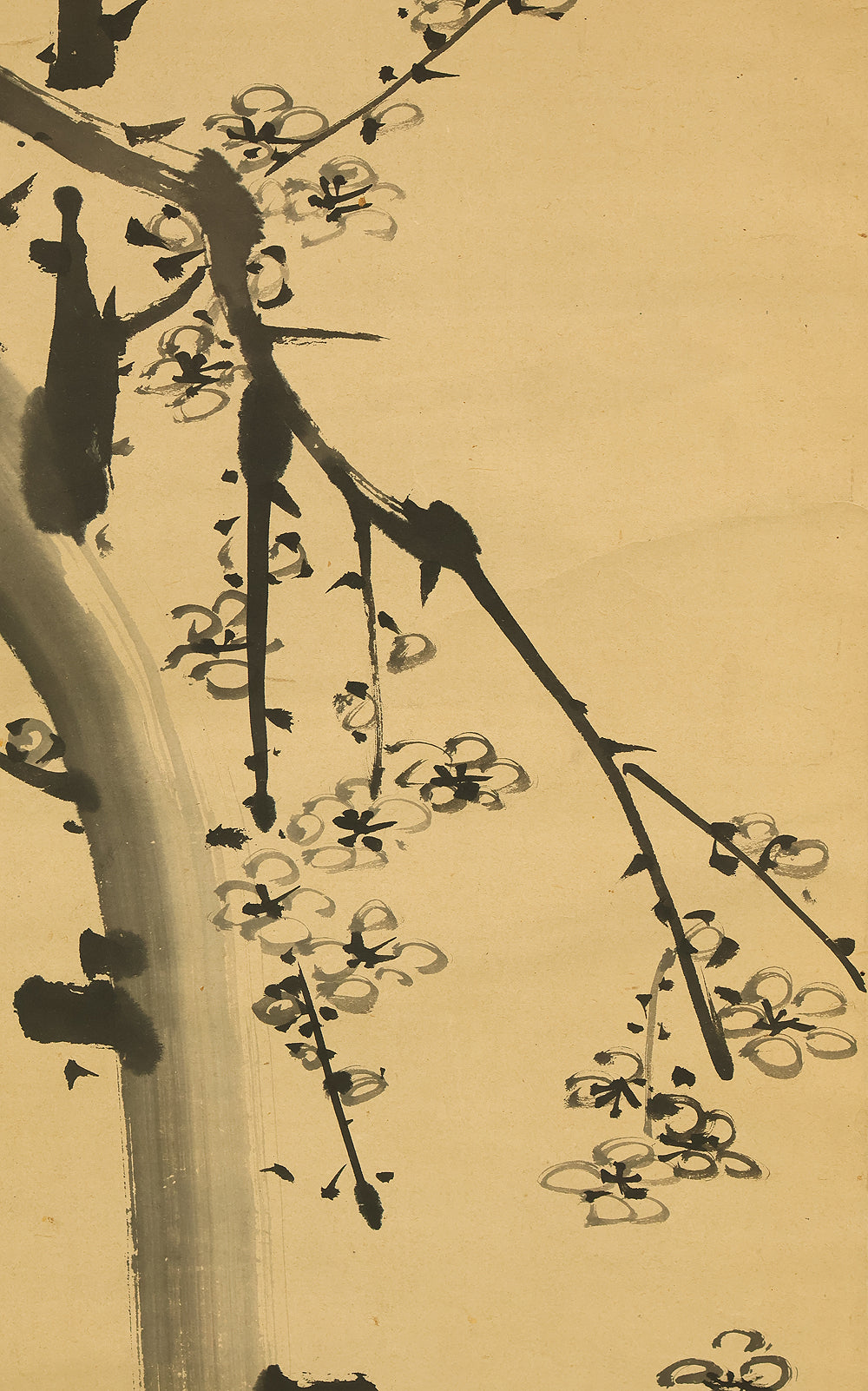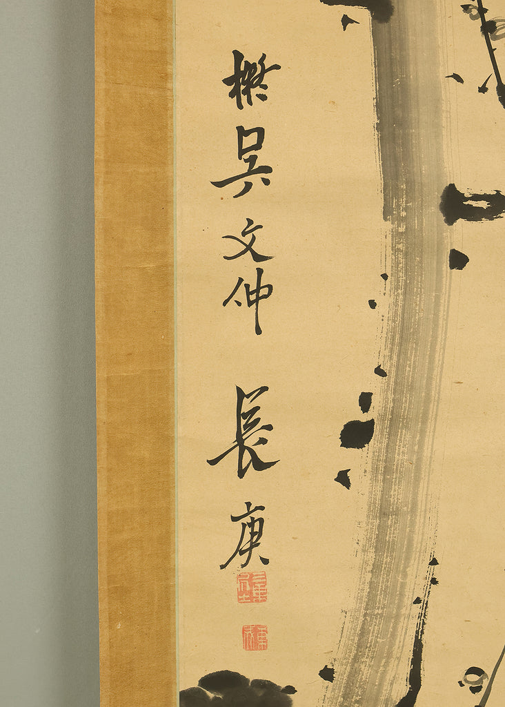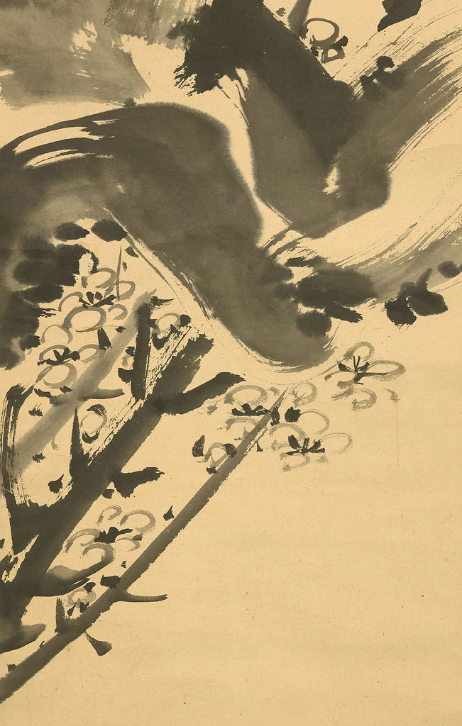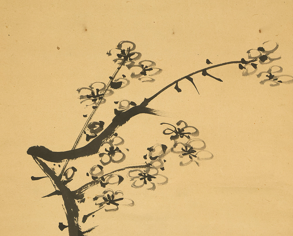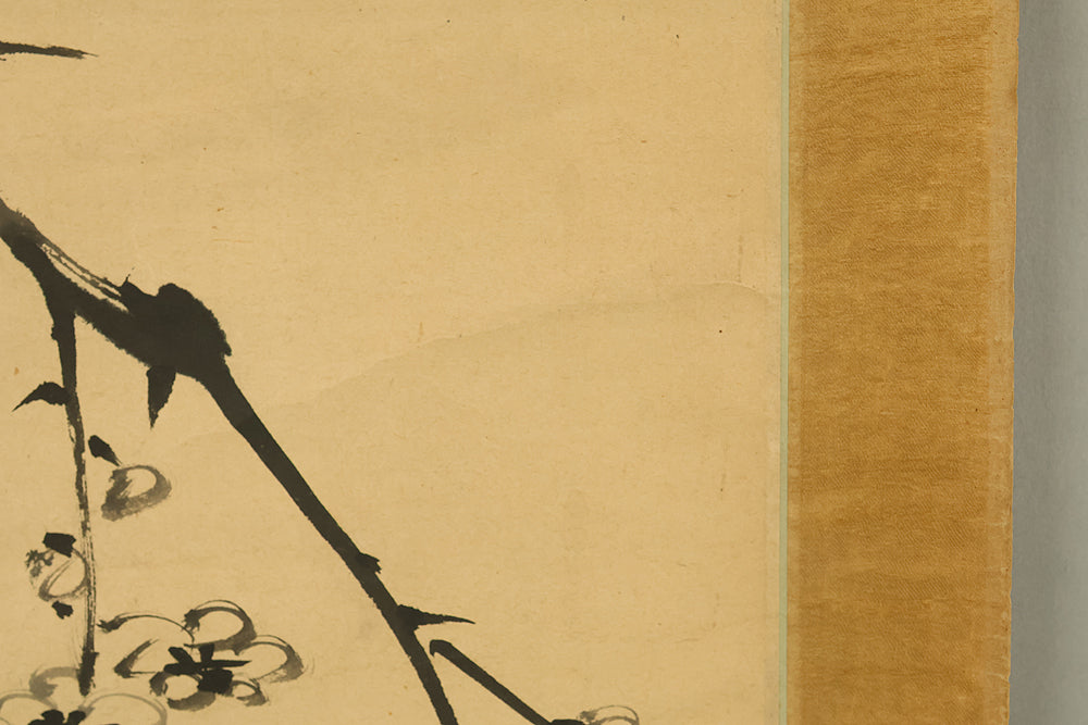 A masterful ink painting of a blossoming plum tree rendered in suiboku style, this hanging scroll by Yosa Buson (1716–1784) exemplifies the poetic depth and literati elegance for which he is celebrated. The gnarled trunk and delicate blossoms are executed with expressive brushwork and tonal subtlety, evoking both the resilience of winter and the quiet anticipation of spring. Above the signature appears the inscription “擬 呉文仲”, indicating Buson’s respectful emulation of the Chinese painter Wu Wen-zhong, whose style he admired and adapted—an homage that reflects Buson’s deep engagement with Chinese literati traditions. Signed “Chōko” (長庚) and sealed “Sanka Koji” (三果居士) and “Tosei” (東成), the scroll bears Buson’s mature artistic identity, blending haikai sensibility with painterly lyricism. As one of the three great haiku masters of the Edo period—alongside Matsuo Bashō and Kobayashi Issa—Buson’s visual art shares the same realism, romance, and seasonal nuance that define his poetry. This work, accompanied by a box, stands as a rare and refined example of mid-Edo literati painting, where brush, verse, and reverence for tradition converge in quiet brilliance.