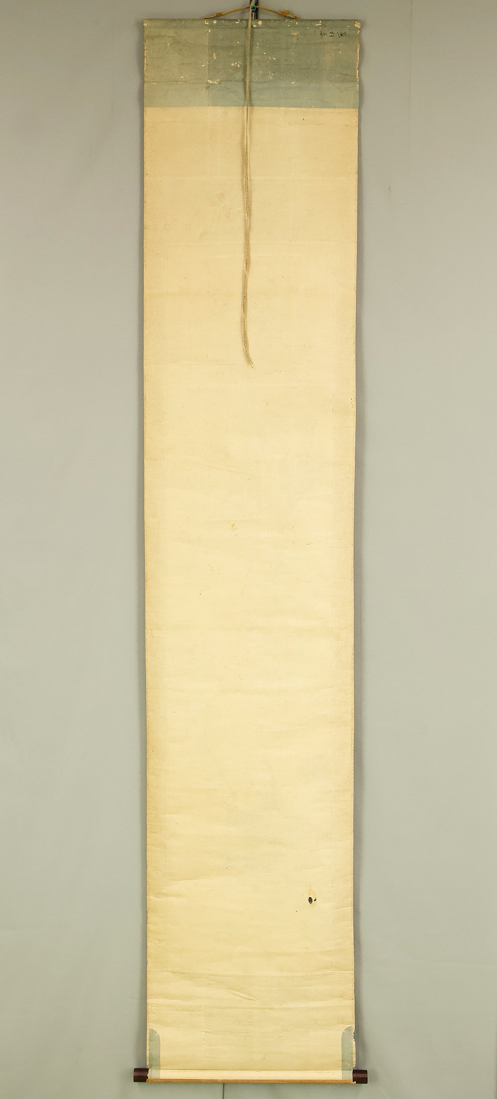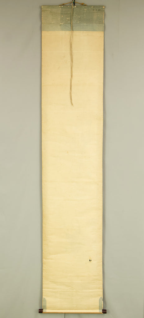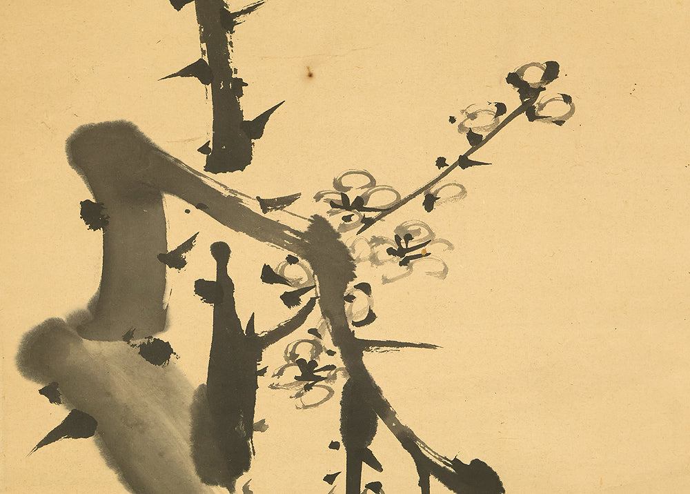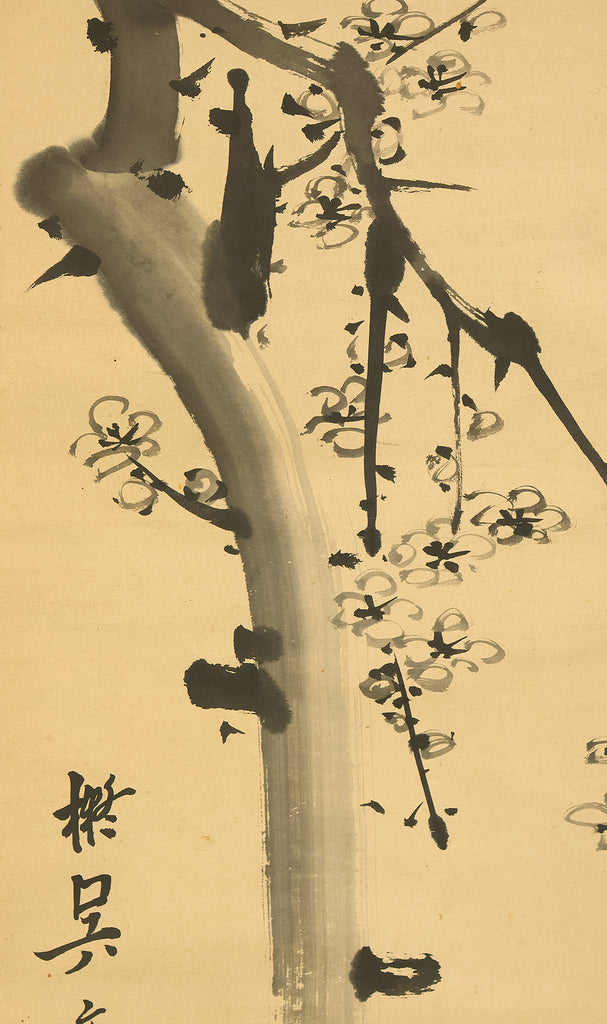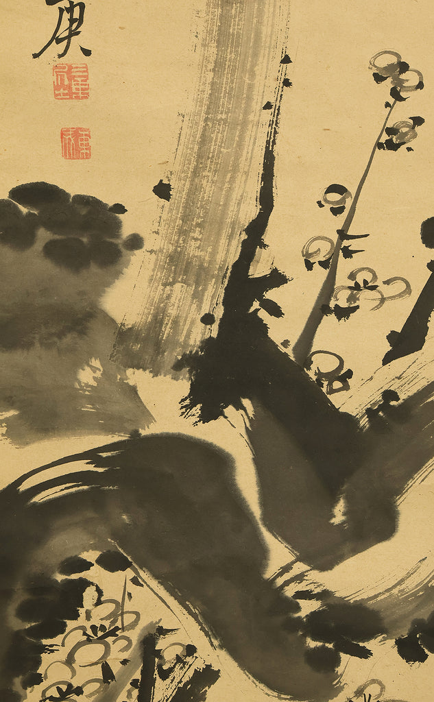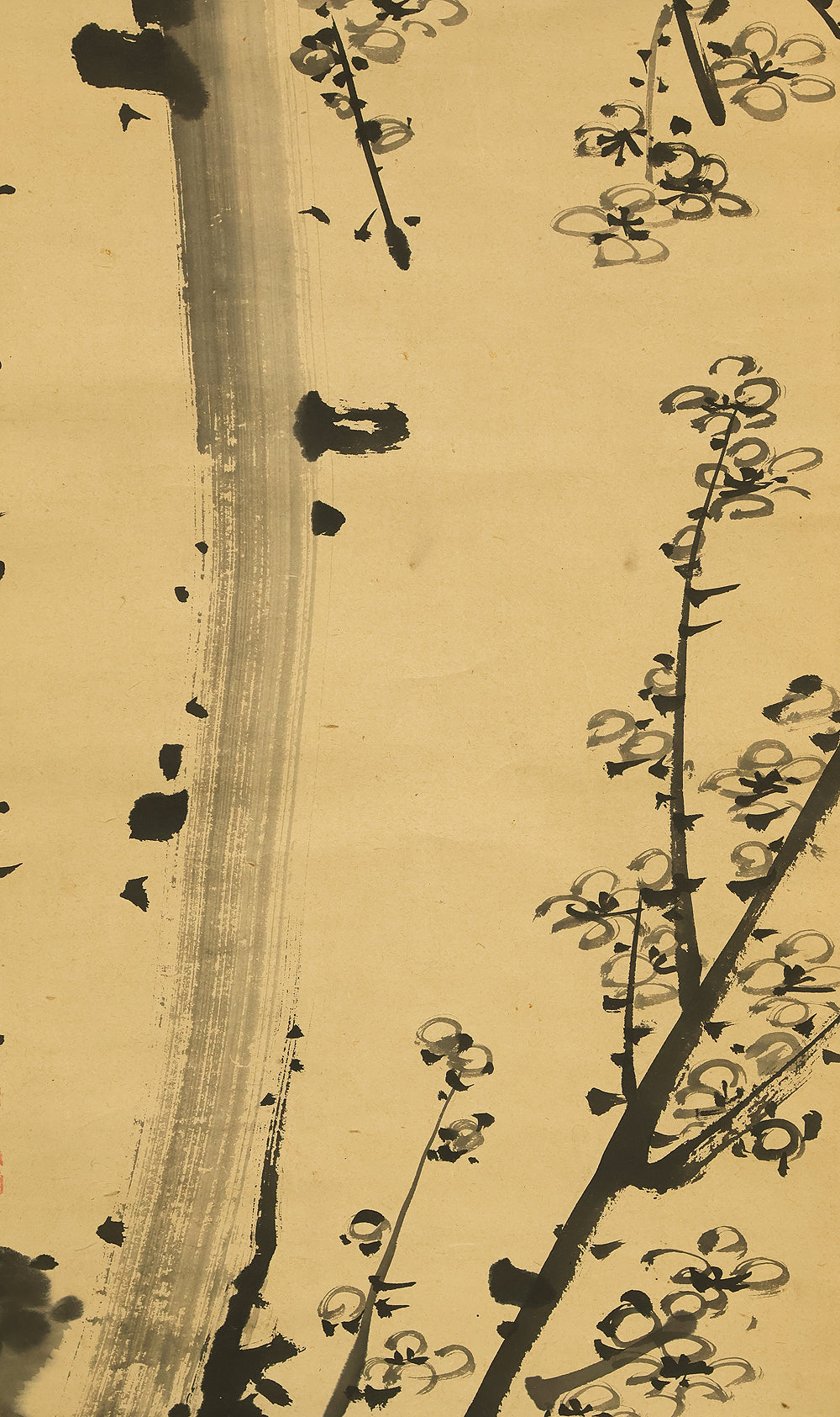 A masterful ink painting of a blossoming plum tree rendered in suiboku style, this hanging scroll by Yosa Buson (1716–1784) exemplifies the poetic depth and literati elegance for which he is celebrated. The gnarled trunk and delicate blossoms are executed with expressive brushwork and tonal subtlety, evoking both the resilience of winter and the quiet anticipation of spring. Above the signature appears the inscription “擬 呉文仲”, indicating Buson’s respectful emulation of the Chinese painter Wu Wen-zhong, whose style he admired and adapted—an homage that reflects Buson’s deep engagement with Chinese literati traditions. Signed “Chōko” (長庚) and sealed “Sanka Koji” (三果居士) and “Tosei” (東成), the scroll bears Buson’s mature artistic identity, blending haikai sensibility with painterly lyricism. As one of the three great haiku masters of the Edo period—alongside Matsuo Bashō and Kobayashi Issa—Buson’s visual art shares the same realism, romance, and seasonal nuance that define his poetry. This work, accompanied by a box, stands as a rare and refined example of mid-Edo literati painting, where brush, verse, and reverence for tradition converge in quiet brilliance.