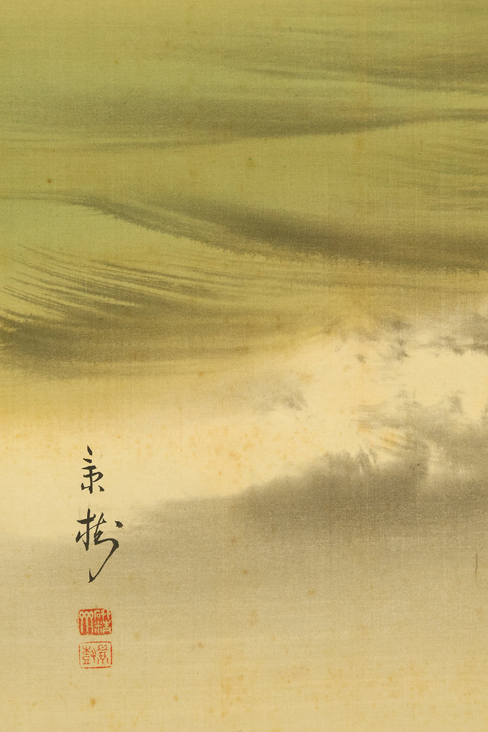 A vivid red sun rising above softly layered waves forms the heart of this striking scroll by Imai Keiju (1891–1967), a Maruyama‑school painter active through the Taishō and Shōwa eras. Keiju’s training under Imao Keinen is evident in the clarity of his brushwork—the firm, assured lines of the waves and the luminous gradation of the sun create a composition that feels both bold and quietly balanced. Known primarily for his flower‑and‑bird paintings, he brings the same sensitivity for atmosphere and rhythm to this more symbolic scene. The work bears the signature “Keiju” (景樹) and the seals “Kenseisai” (研精斎) and “Keiju”, affirming its authenticity. The presence of the box ensures the piece has been carefully kept, and the scroll’s bright, rising‑sun motif naturally adds a sense of clarity and forward‑looking energy to the space where it is displayed, giving the room a subtle lift without overwhelming it.