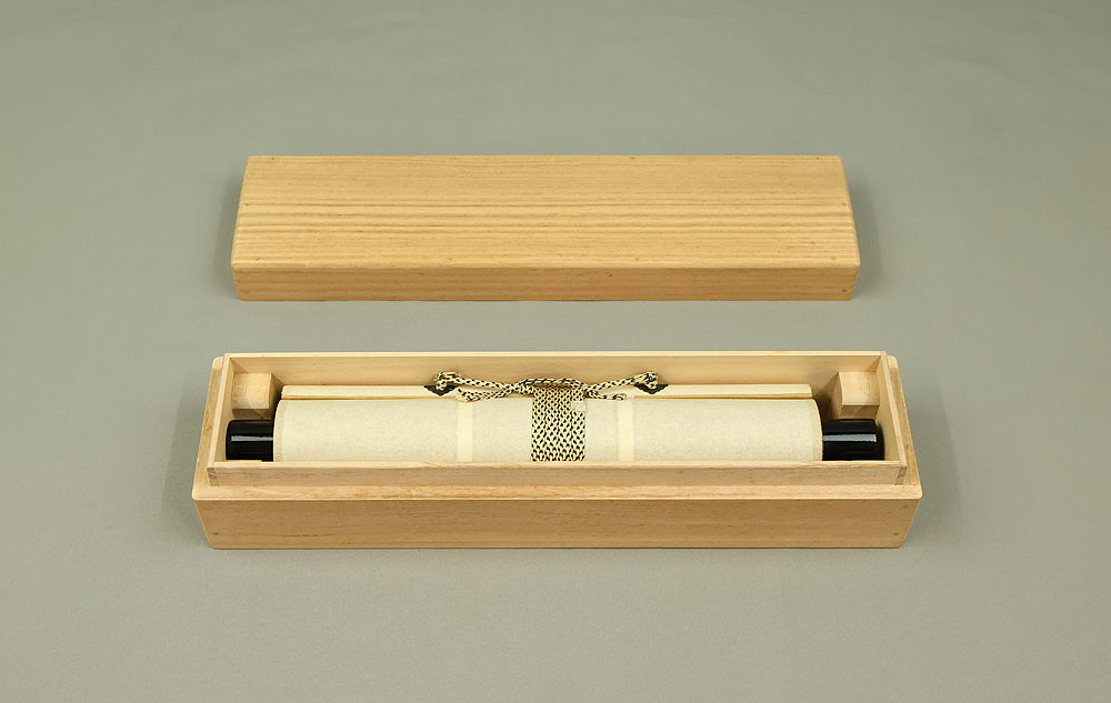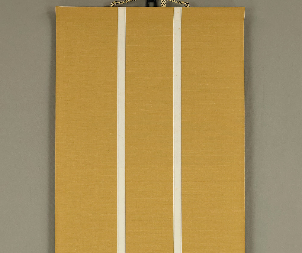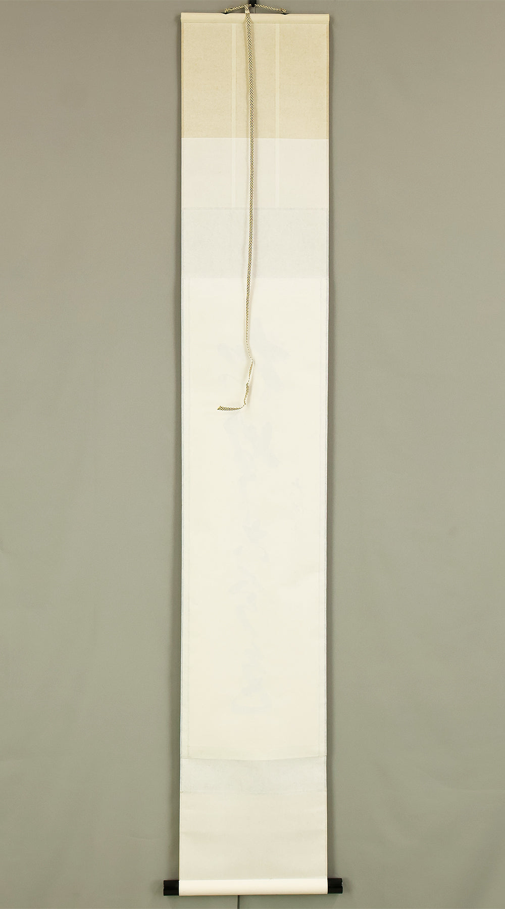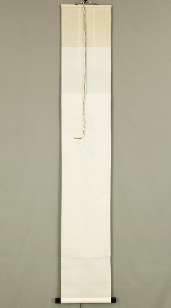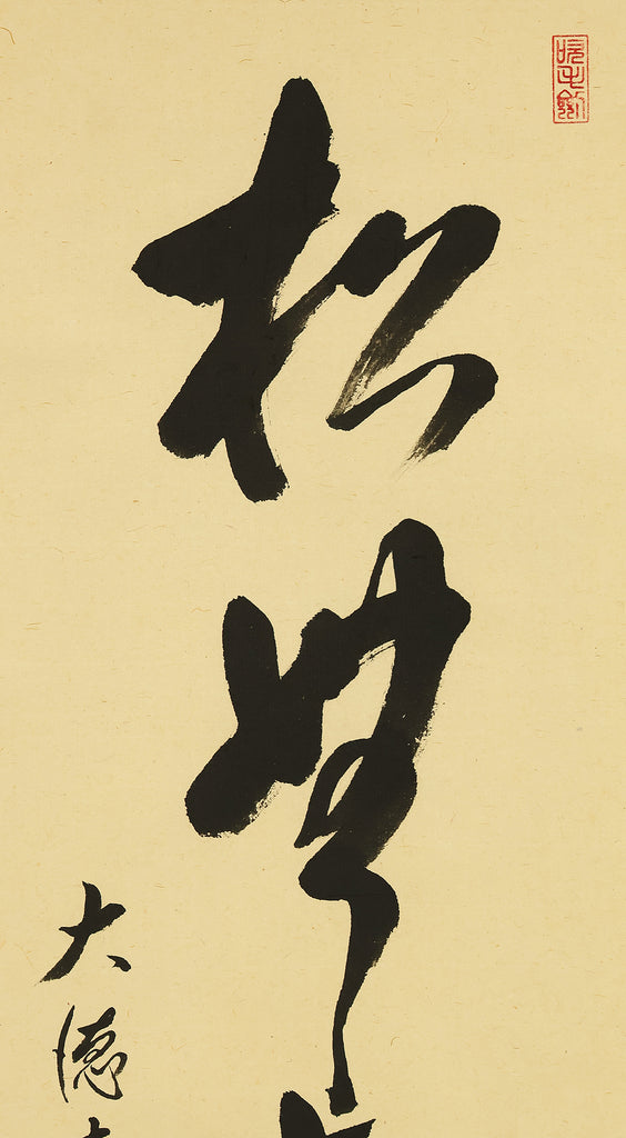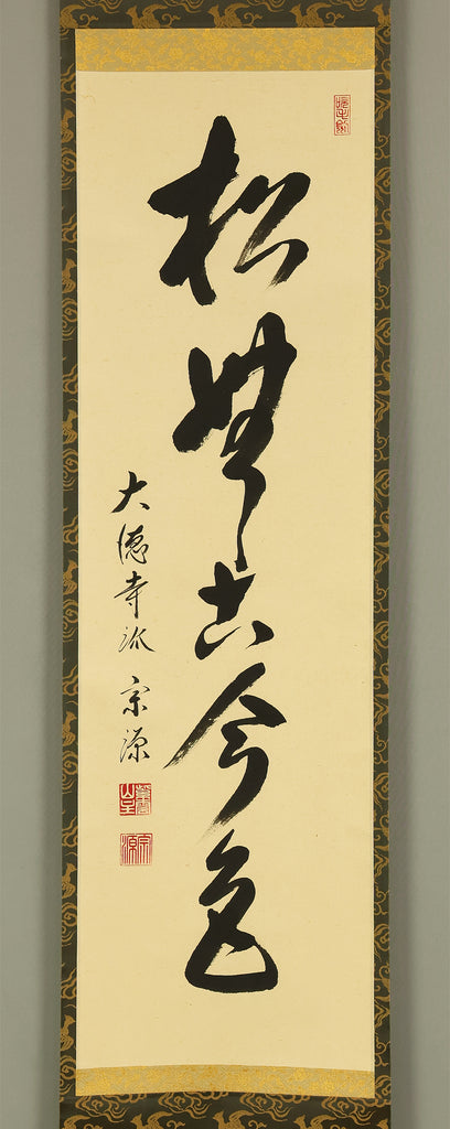 This Zen hanging scroll by Maeda Sogen (b.1932), chief priest of Zuiko-in at Daitoku-ji, features the profound phrase 松無古今色 (Matsuni Kokonno Ironashi)—“The pine has no color of past or present.” In Zen thought, this expression reflects the timeless constancy of nature: the pine tree, ever green, symbolizes a state beyond temporal change. It serves as a metaphor for the unchanging essence of truth, transcending distinctions between old and new, past and present. Often displayed in tea ceremony settings, such calligraphy invites quiet reflection and spiritual clarity. The scroll bears the signature “Daitoku-ji ha Sogen” (大徳寺派宗源) and seals “Shiun sanshu” (紫雲山主) and “Sogen” (宗源), affirming its authenticity. Housed in its original box (tomobako), this work embodies the refined simplicity and philosophical depth central to Zen aesthetics.