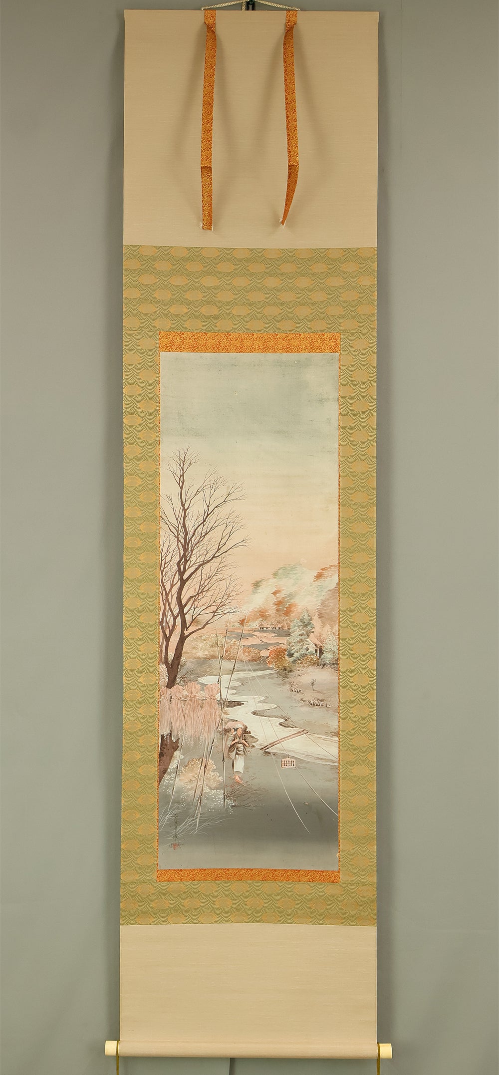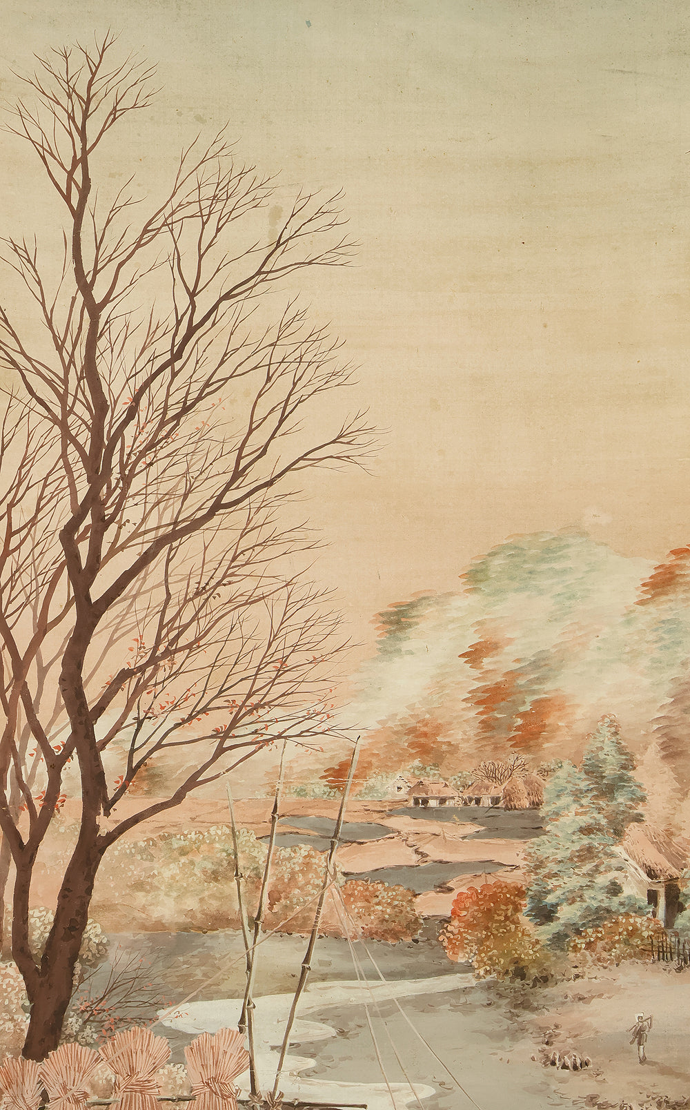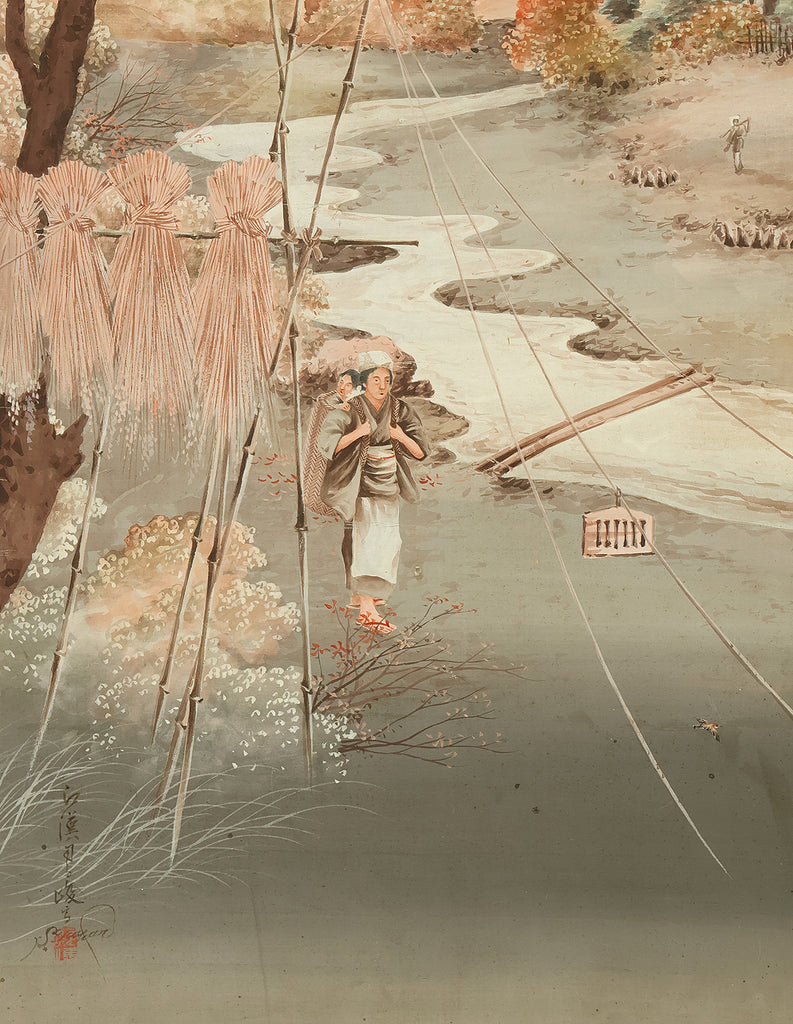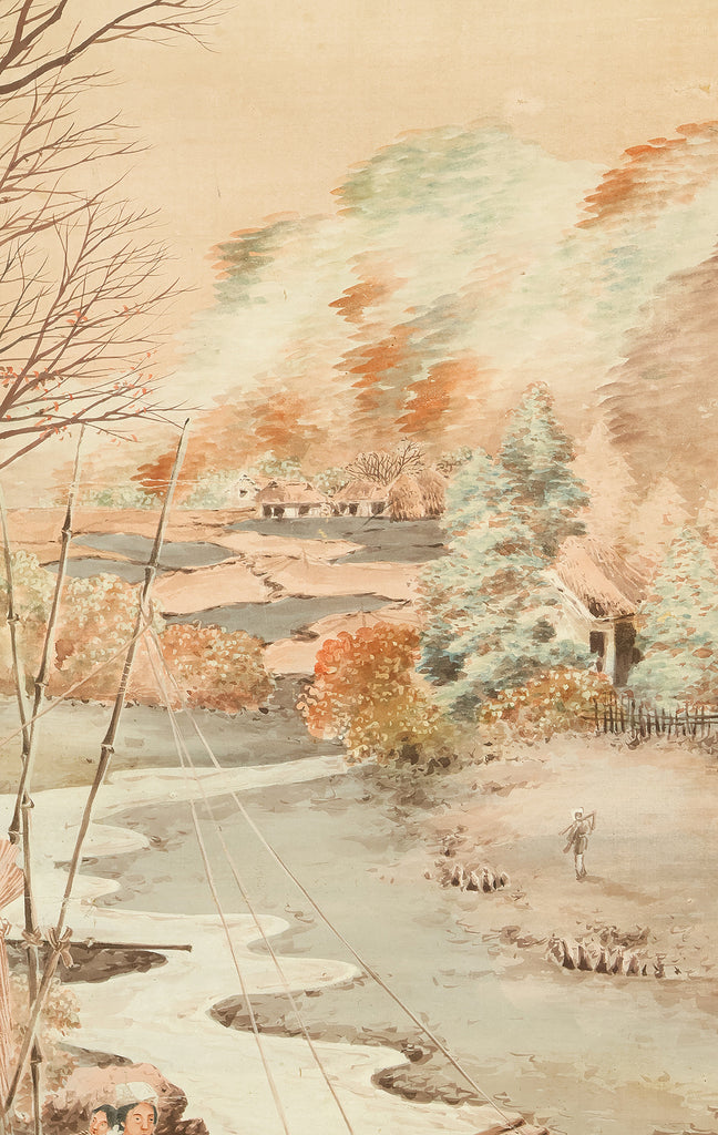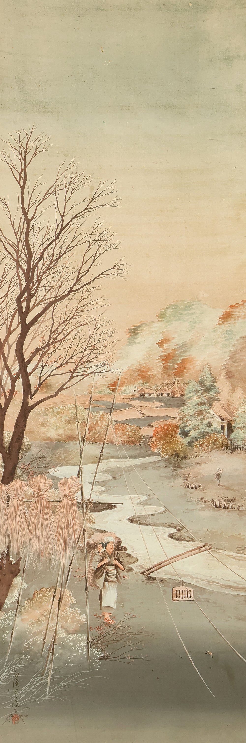 This hanging scroll attributed to Shiba Kokan (1747–1818) depicts a tranquil autumn scene in a mountain village, rendered with delicate brushwork and a keen sense of seasonal atmosphere. In the foreground, a figure dressed in traditional attire carries a child on their back—an intimate moment of caregiving that evokes the quiet rhythms of rural life. The ground is grassy, not bare, and the figure wears footwear, suggesting a practical journey rather than hardship. Bundles of straw hang from tall bamboo poles, indicating agricultural activity typical of upland communities. A simple wooden bridge spans the stream, and a suspended basket hints at local craft or utility. The warm tones of the foliage and the bare trees frame the composition in a gentle embrace of early autumn. The scroll bears the signature “S.kokan”, a Romanized form of “Kokan Shiba Shun sha” (江漢司馬峻 写), reflecting the artist’s engagement with Western techniques and his role in introducing copperplate etching and oil painting to Japan. It is housed in a double box, with the outer box inscribed in 1981 by Sumisakagosha Mikito (墨坂郷舎 美鬼洞), as noted on the lid. This inscription adds a layer of documentation and care to the work’s preservation, complementing its historical and aesthetic significance.
