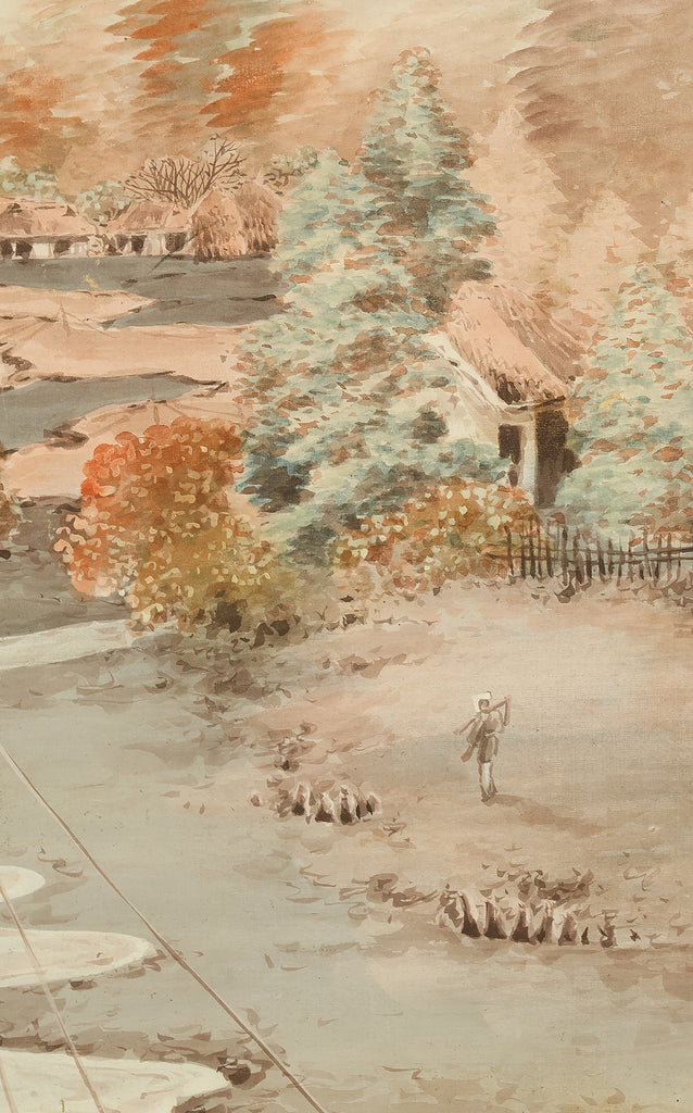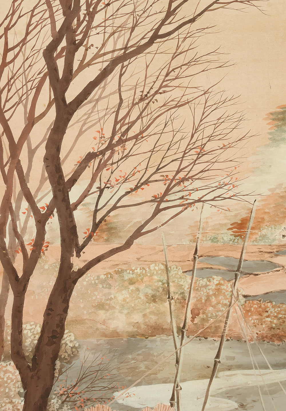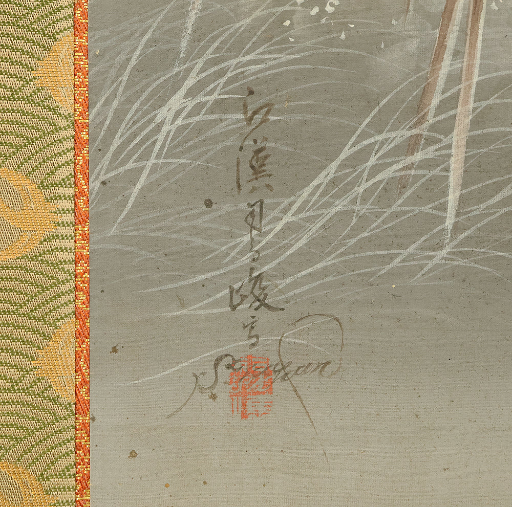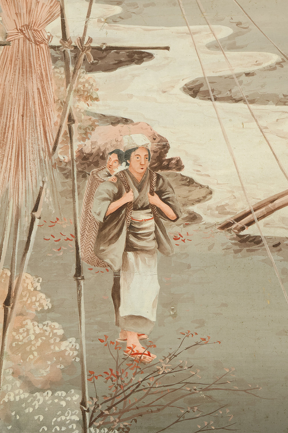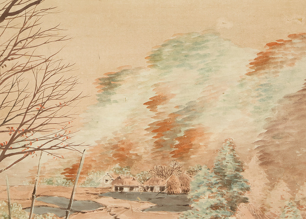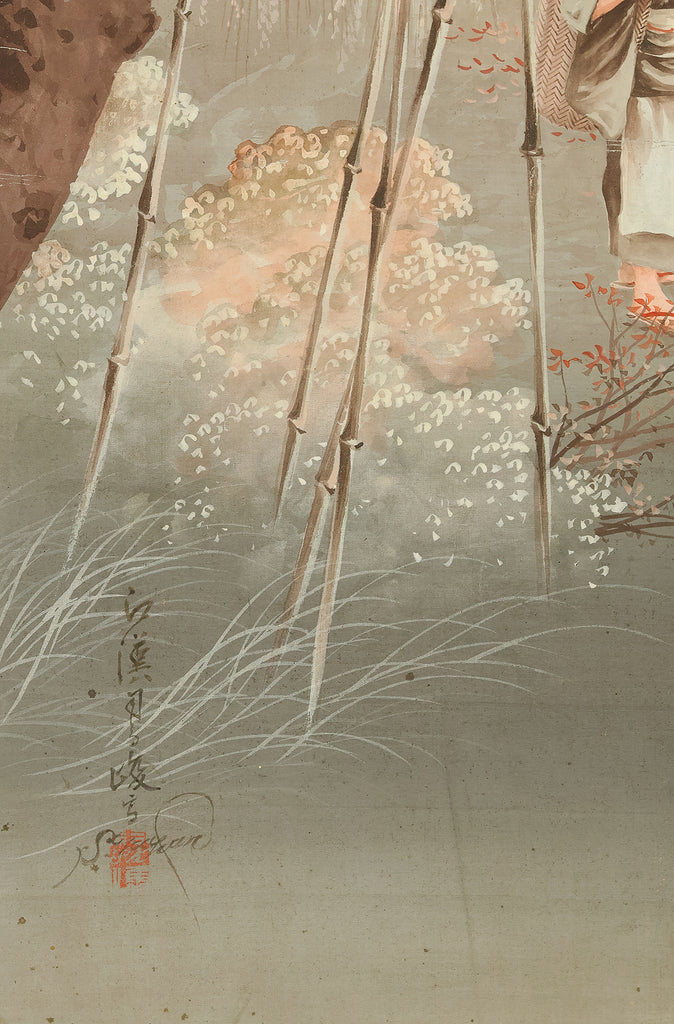 This hanging scroll attributed to Shiba Kokan (1747–1818) depicts a tranquil autumn scene in a mountain village, rendered with delicate brushwork and a keen sense of seasonal atmosphere. In the foreground, a figure dressed in traditional attire carries a child on their back—an intimate moment of caregiving that evokes the quiet rhythms of rural life. The ground is grassy, not bare, and the figure wears footwear, suggesting a practical journey rather than hardship. Bundles of straw hang from tall bamboo poles, indicating agricultural activity typical of upland communities. A simple wooden bridge spans the stream, and a suspended basket hints at local craft or utility. The warm tones of the foliage and the bare trees frame the composition in a gentle embrace of early autumn. The scroll bears the signature “S.kokan”, a Romanized form of “Kokan Shiba Shun sha” (江漢司馬峻 写), reflecting the artist’s engagement with Western techniques and his role in introducing copperplate etching and oil painting to Japan. It is housed in a double box, with the outer box inscribed in 1981 by Sumisakagosha Mikito (墨坂郷舎 美鬼洞), as noted on the lid. This inscription adds a layer of documentation and care to the work’s preservation, complementing its historical and aesthetic significance.