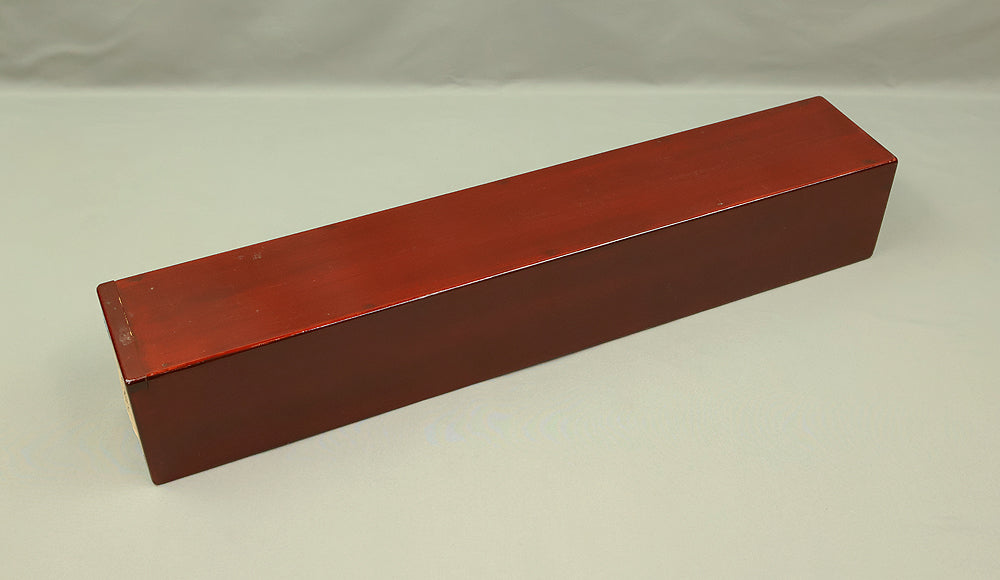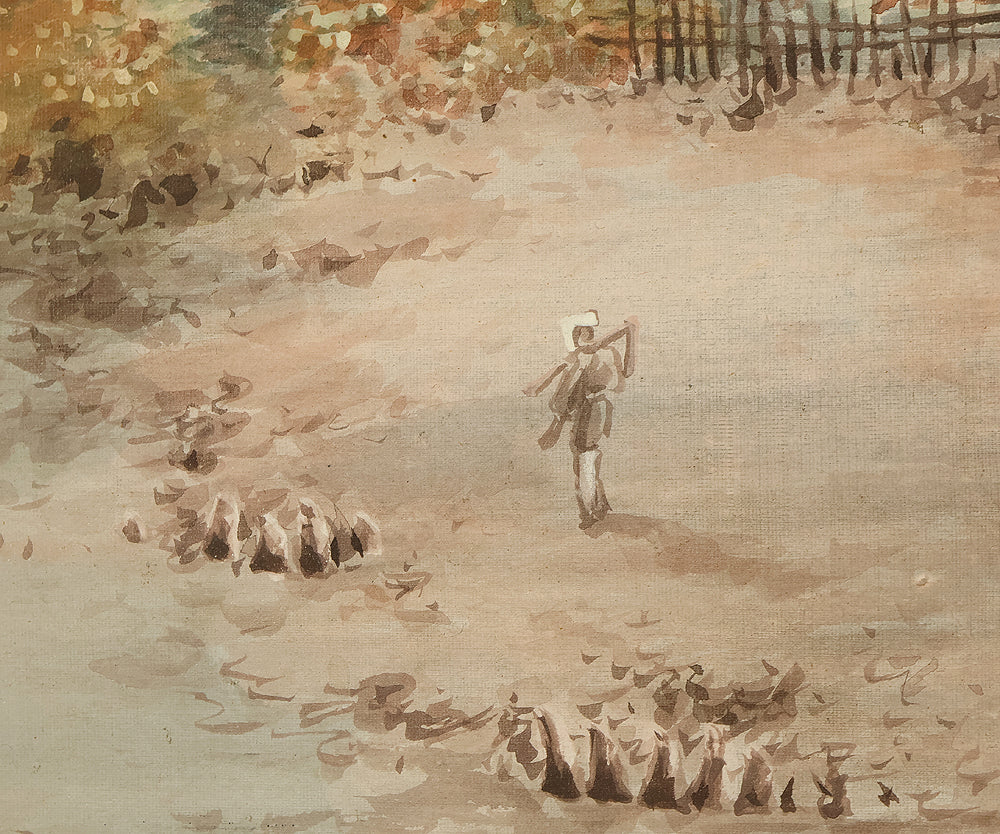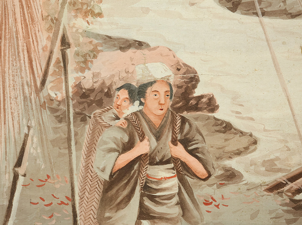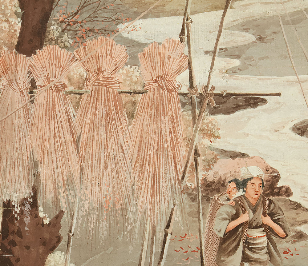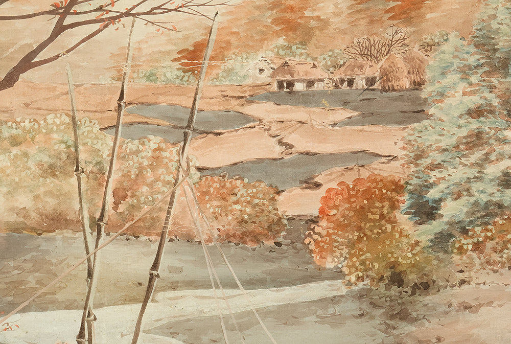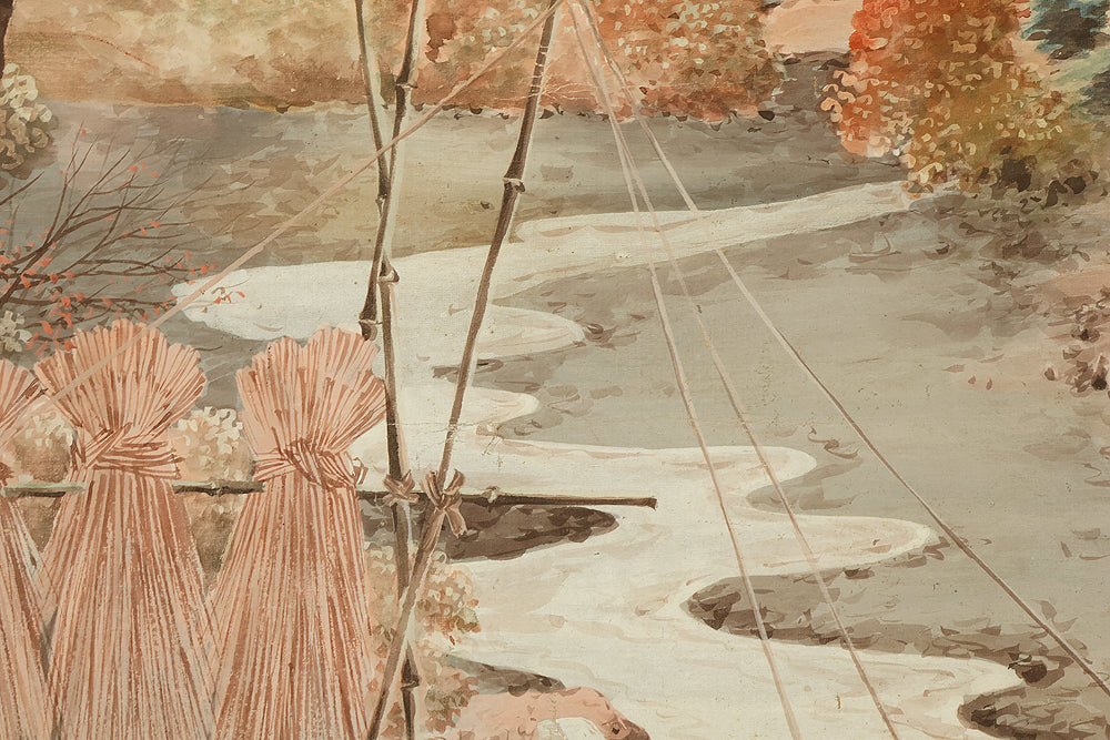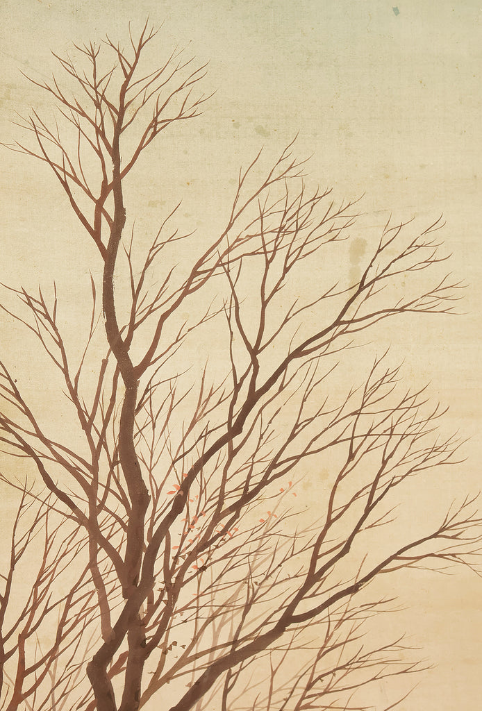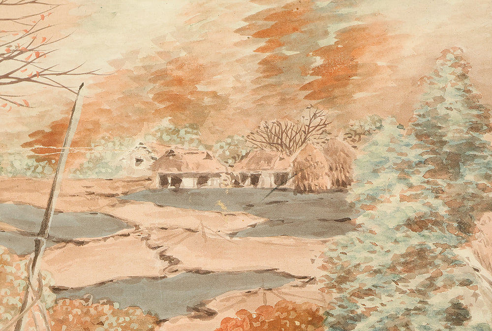 This hanging scroll attributed to Shiba Kokan (1747–1818) depicts a tranquil autumn scene in a mountain village, rendered with delicate brushwork and a keen sense of seasonal atmosphere. In the foreground, a figure dressed in traditional attire carries a child on their back—an intimate moment of caregiving that evokes the quiet rhythms of rural life. The ground is grassy, not bare, and the figure wears footwear, suggesting a practical journey rather than hardship. Bundles of straw hang from tall bamboo poles, indicating agricultural activity typical of upland communities. A simple wooden bridge spans the stream, and a suspended basket hints at local craft or utility. The warm tones of the foliage and the bare trees frame the composition in a gentle embrace of early autumn. The scroll bears the signature “S.kokan”, a Romanized form of “Kokan Shiba Shun sha” (江漢司馬峻 写), reflecting the artist’s engagement with Western techniques and his role in introducing copperplate etching and oil painting to Japan. It is housed in a double box, with the outer box inscribed in 1981 by Sumisakagosha Mikito (墨坂郷舎 美鬼洞), as noted on the lid. This inscription adds a layer of documentation and care to the work’s preservation, complementing its historical and aesthetic significance.