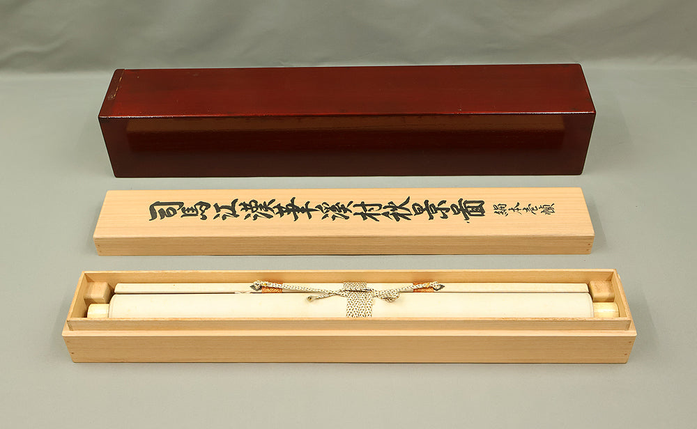 司馬江漢 Shiba Kokan (1747-1818) Japanese antique art kakejiku kakemono wall hanging scroll / Autumn Village Scenery by Stream with Appraised Double Box RE204