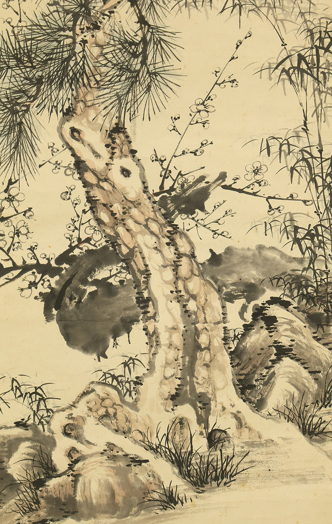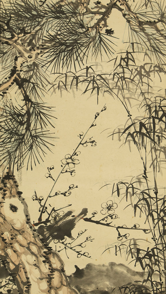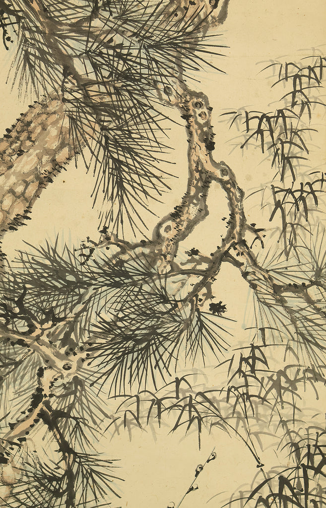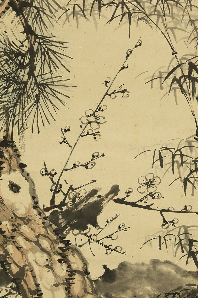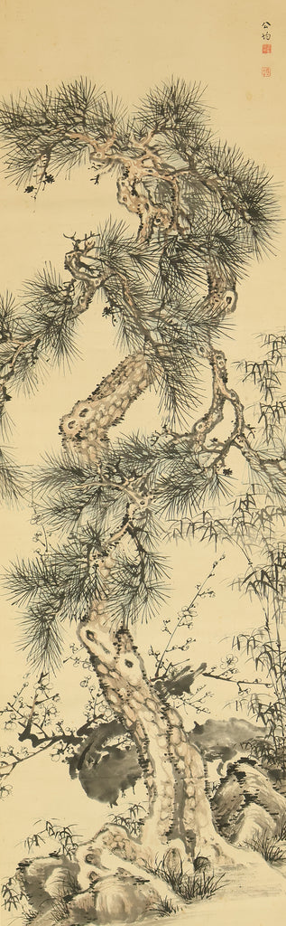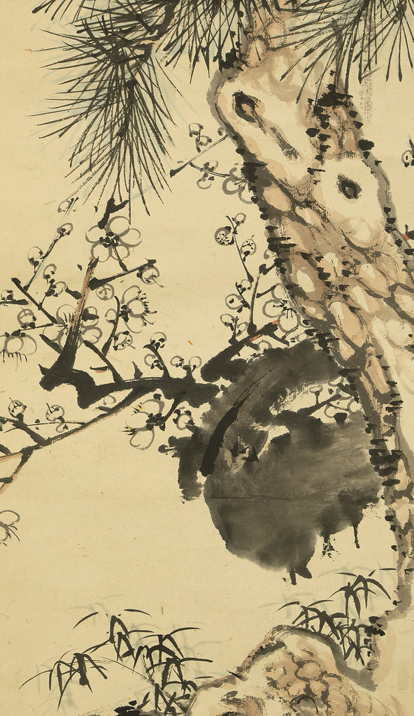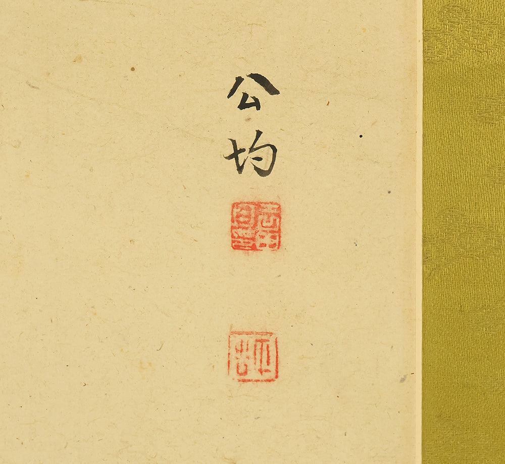 This Japanese hanging scroll features a refined composition of pine, bamboo, and plum—known collectively as the “Three Friends of Winter”—symbolizing resilience, integrity, and renewal. Rendered in elegant brushwork and subtle ink tones, the painting reflects the classical aesthetics of the Shijō school. Signed “Kokin” (公均) and sealed “Heikichi” (平吉), the work is attributed to Yoshida Kokin (1804–1876), a painter from Toyama Prefecture who studied under Matsumura Keibun and specialized in flower-and-bird and landscape subjects. The scroll is housed in an appraisal box by Hayakawa Segai (1880–1960), further attesting to its cultural and artistic value.