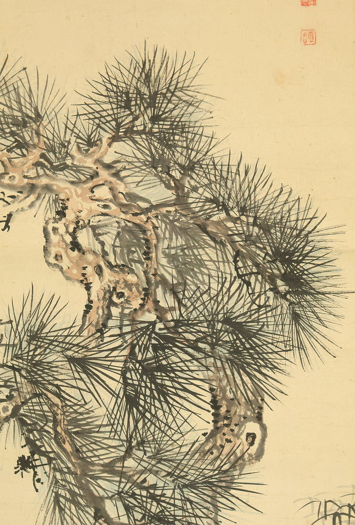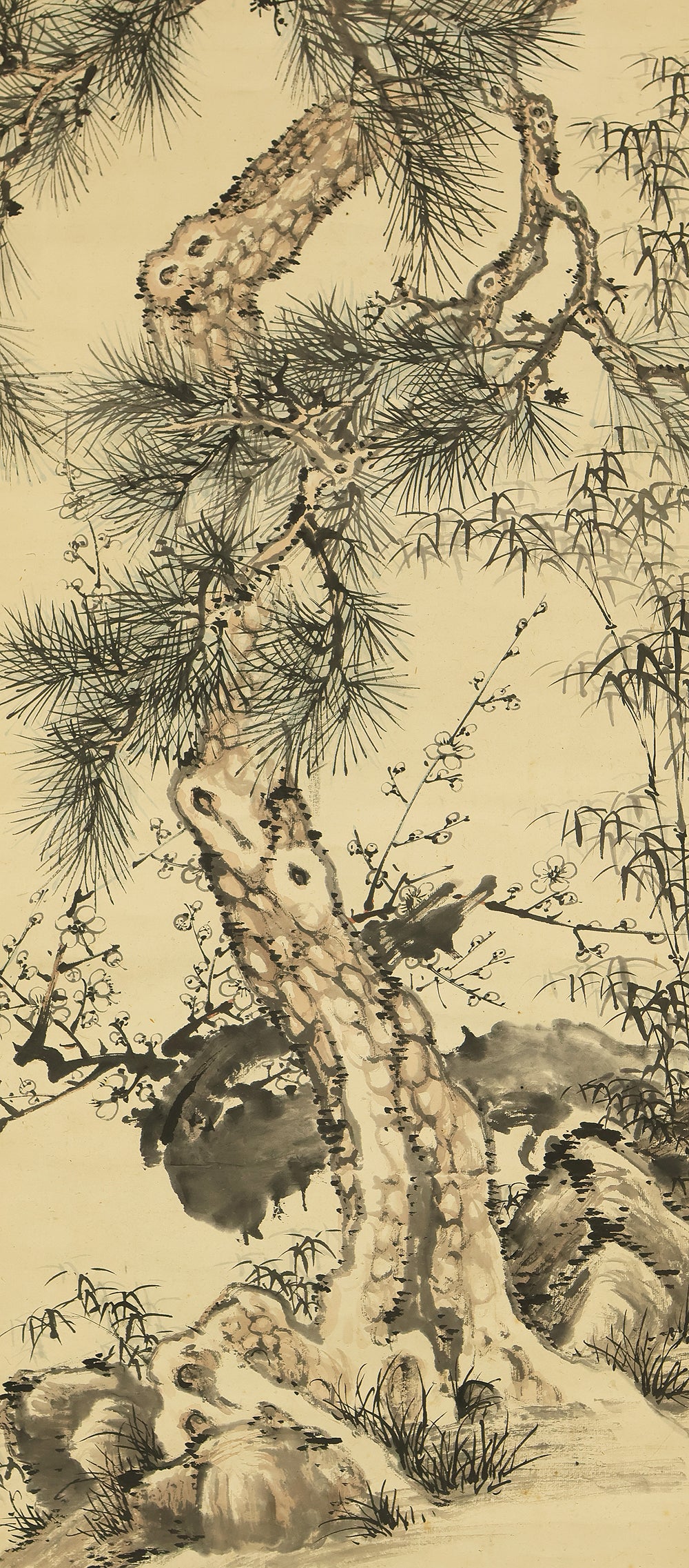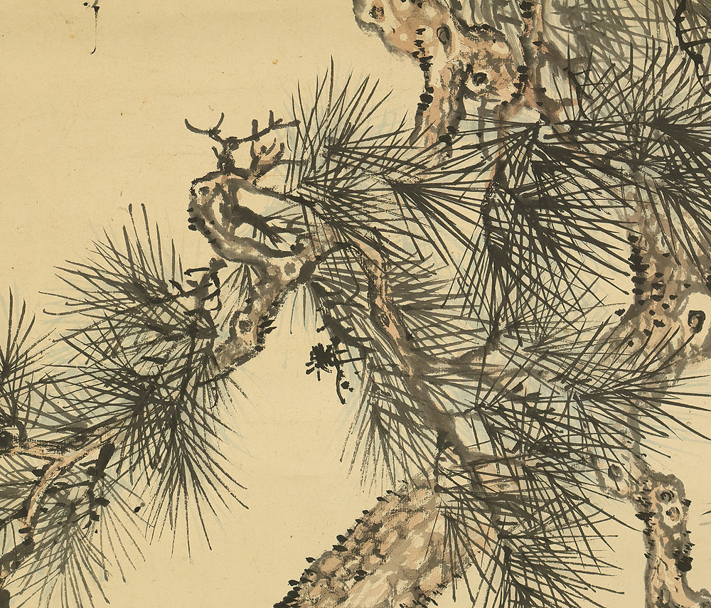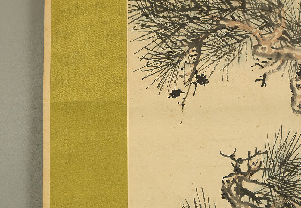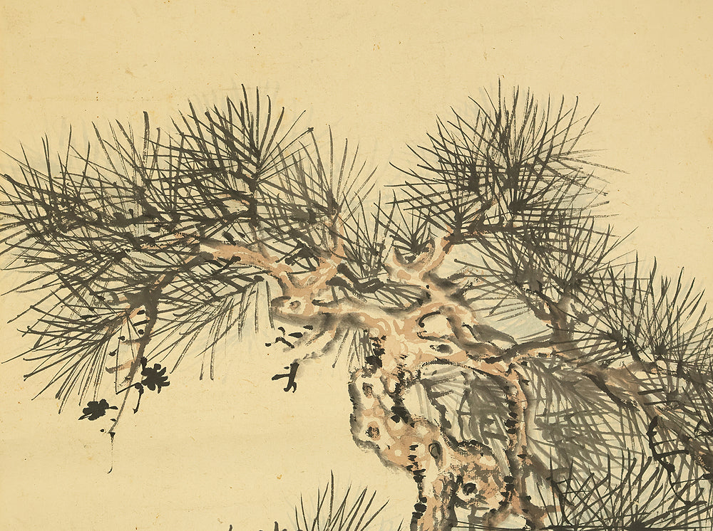 This Japanese hanging scroll features a refined composition of pine, bamboo, and plum—known collectively as the “Three Friends of Winter”—symbolizing resilience, integrity, and renewal. Rendered in elegant brushwork and subtle ink tones, the painting reflects the classical aesthetics of the Shijō school. Signed “Kokin” (公均) and sealed “Heikichi” (平吉), the work is attributed to Yoshida Kokin (1804–1876), a painter from Toyama Prefecture who studied under Matsumura Keibun and specialized in flower-and-bird and landscape subjects. The scroll is housed in an appraisal box by Hayakawa Segai (1880–1960), further attesting to its cultural and artistic value.