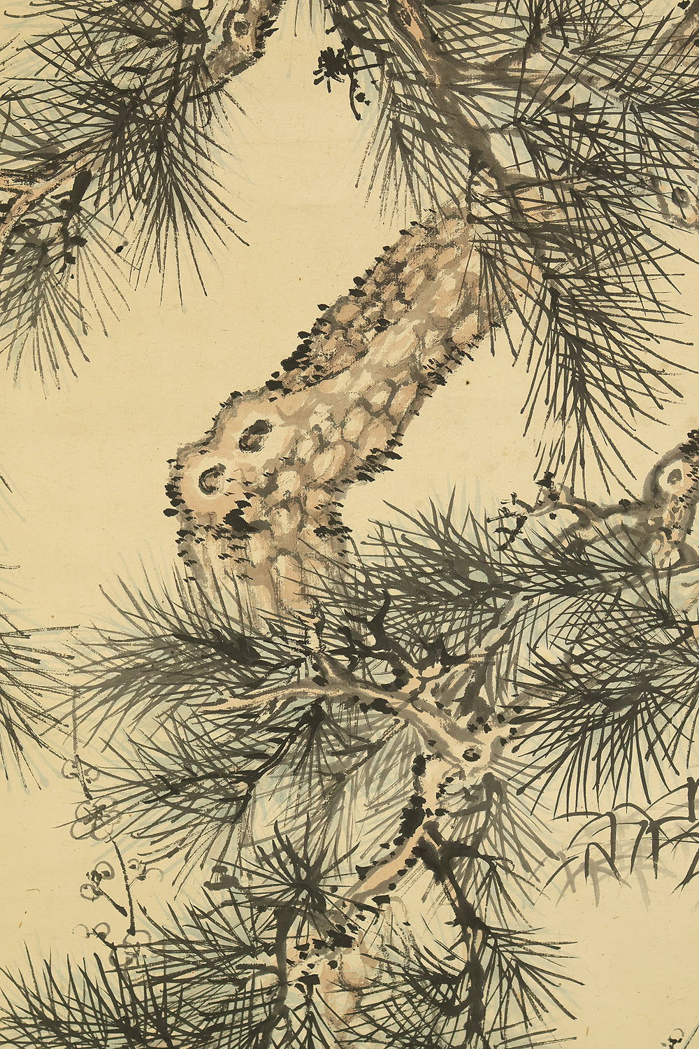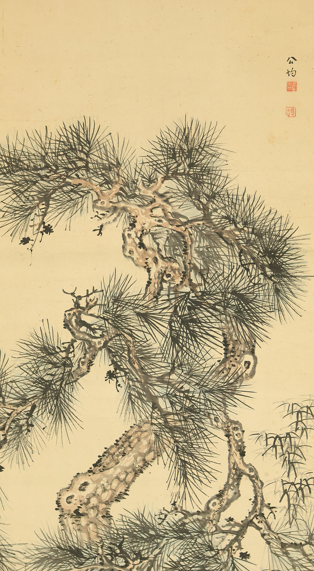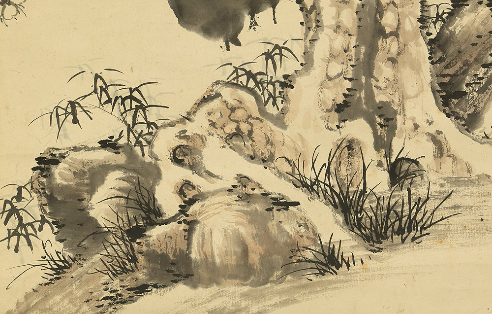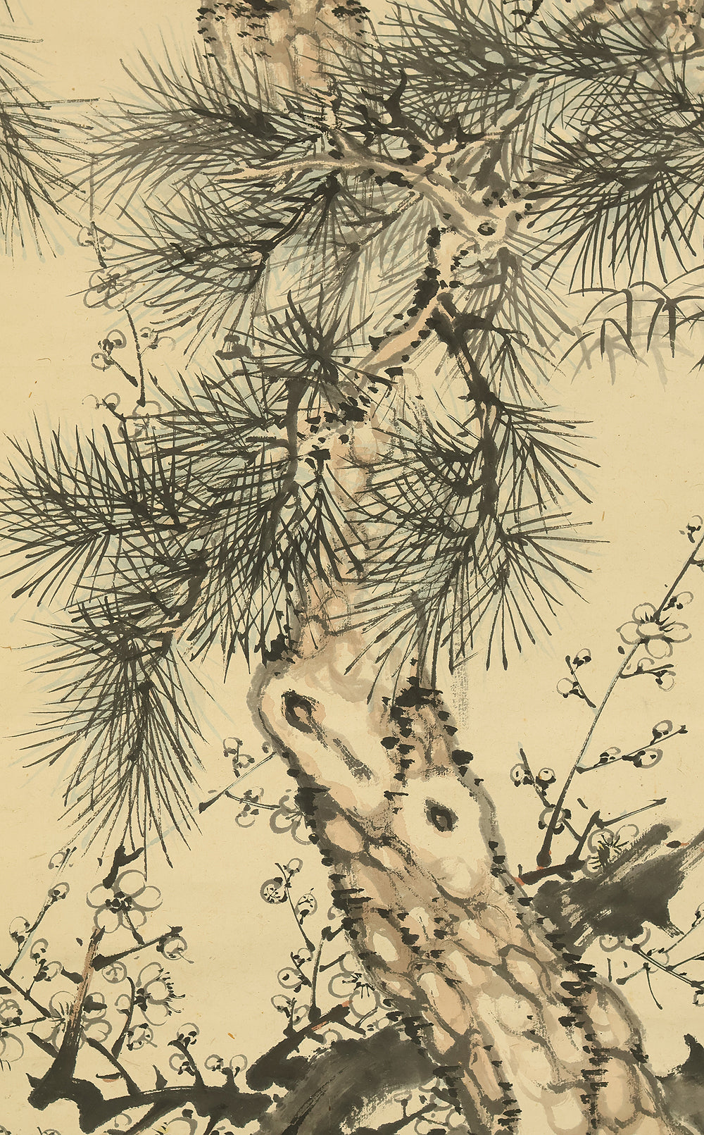 This Japanese hanging scroll features a refined composition of pine, bamboo, and plum—known collectively as the “Three Friends of Winter”—symbolizing resilience, integrity, and renewal. Rendered in elegant brushwork and subtle ink tones, the painting reflects the classical aesthetics of the Shijō school. Signed “Kokin” (公均) and sealed “Heikichi” (平吉), the work is attributed to Yoshida Kokin (1804–1876), a painter from Toyama Prefecture who studied under Matsumura Keibun and specialized in flower-and-bird and landscape subjects. The scroll is housed in an appraisal box by Hayakawa Segai (1880–1960), further attesting to its cultural and artistic value.