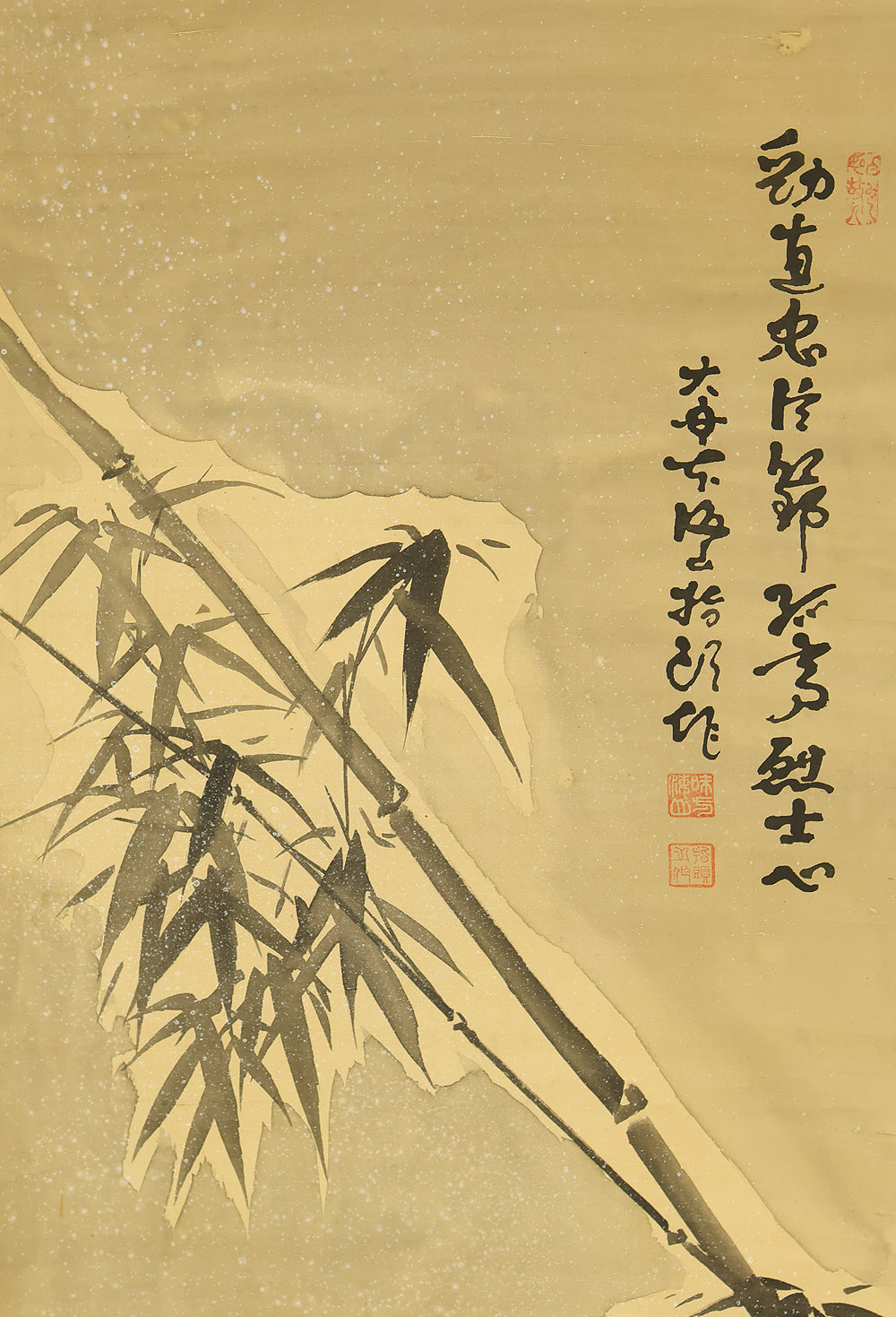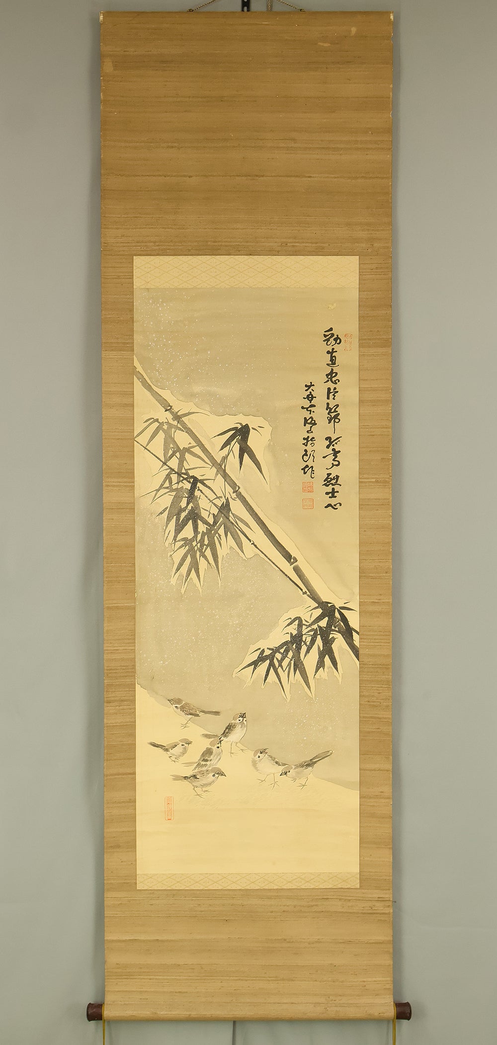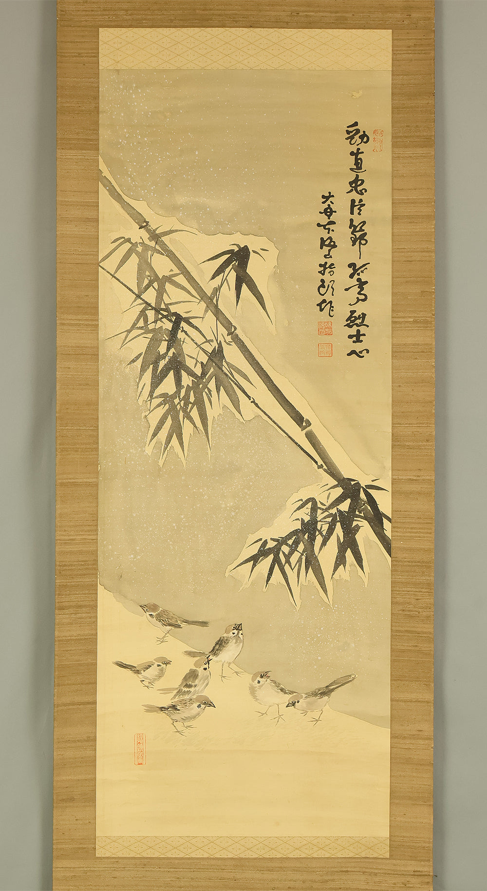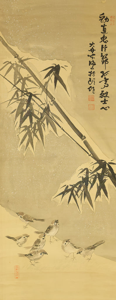 味方海山 Ajikata Kaizan (1863-1942) Japanese art kakejiku kakemono wall hanging scroll / Bamboo and Seven Sparrows in Snow RE293