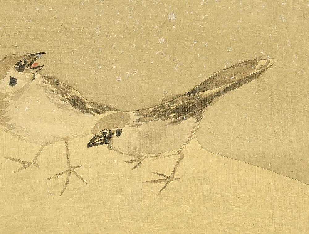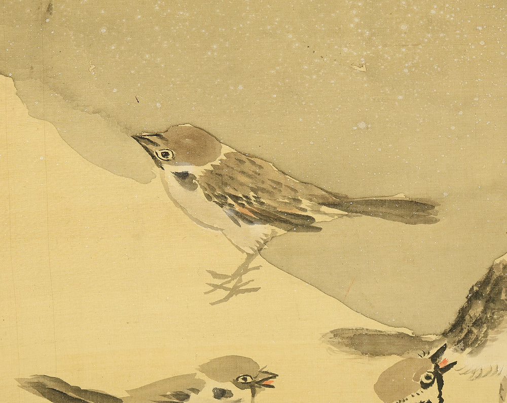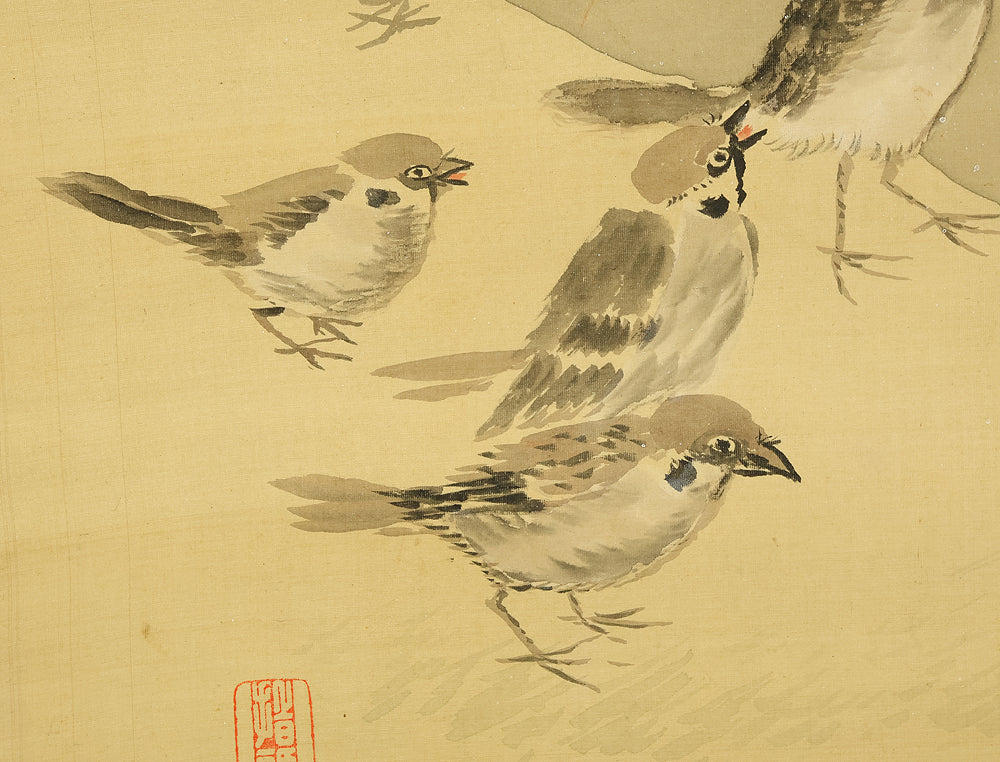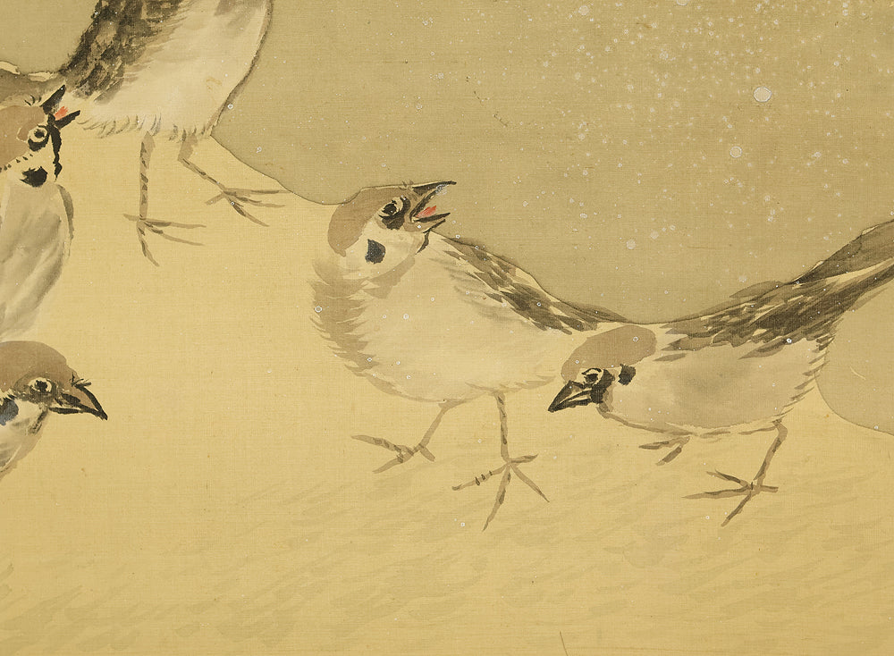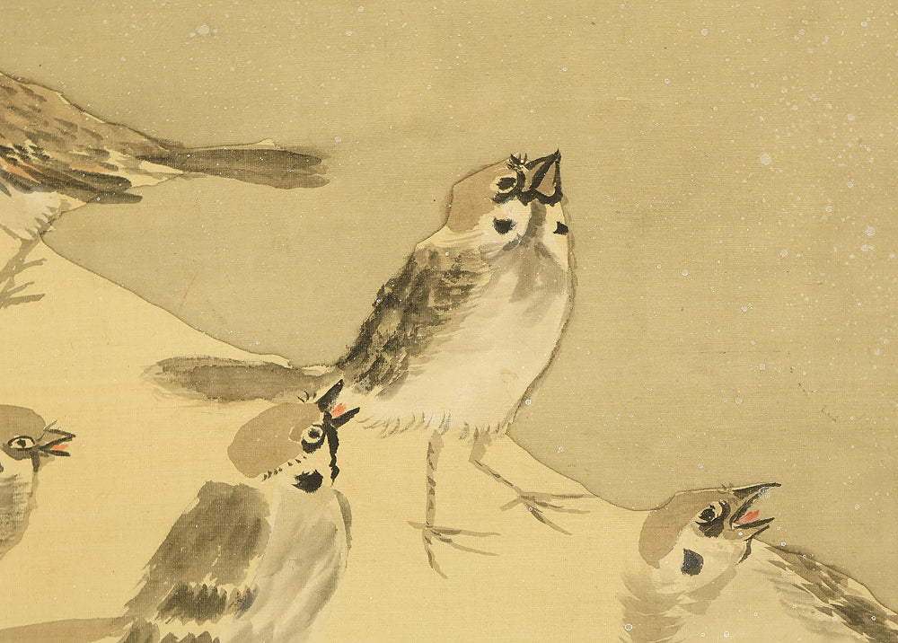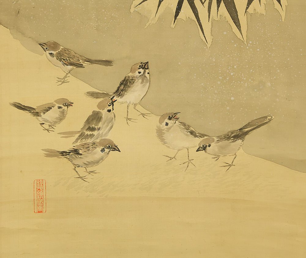 This evocative hanging scroll by Ajikata Kaizan (1863–1942) depicts a tranquil winter scene: a diagonal sweep of bamboo above a cluster of seven sparrows gathered on snowy ground. The composition is rendered in soft ink tones, with delicate gradations suggesting snowfall and quietude. What sets this work apart is Kaizan’s remarkable technique—painted entirely with his fingertips, not a brush—imbuing the forms with a tactile immediacy and rhythmic spontaneity. Signed “Kaizan Shito saku” (海山指頭作) and sealed “Ajikata Kaizan” (味方海山), the scroll reflects Kaizan’s deep roots in Nanga (literati painting), inherited from his mentor Tanomura Chokunyu, yet transformed through his personal, unconventional method. The sparrows, symbols of resilience and companionship, paired with the bamboo’s quiet strength, evoke a mood of gentle endurance—an elegant fusion of technique, symbolism, and seasonal poetry.