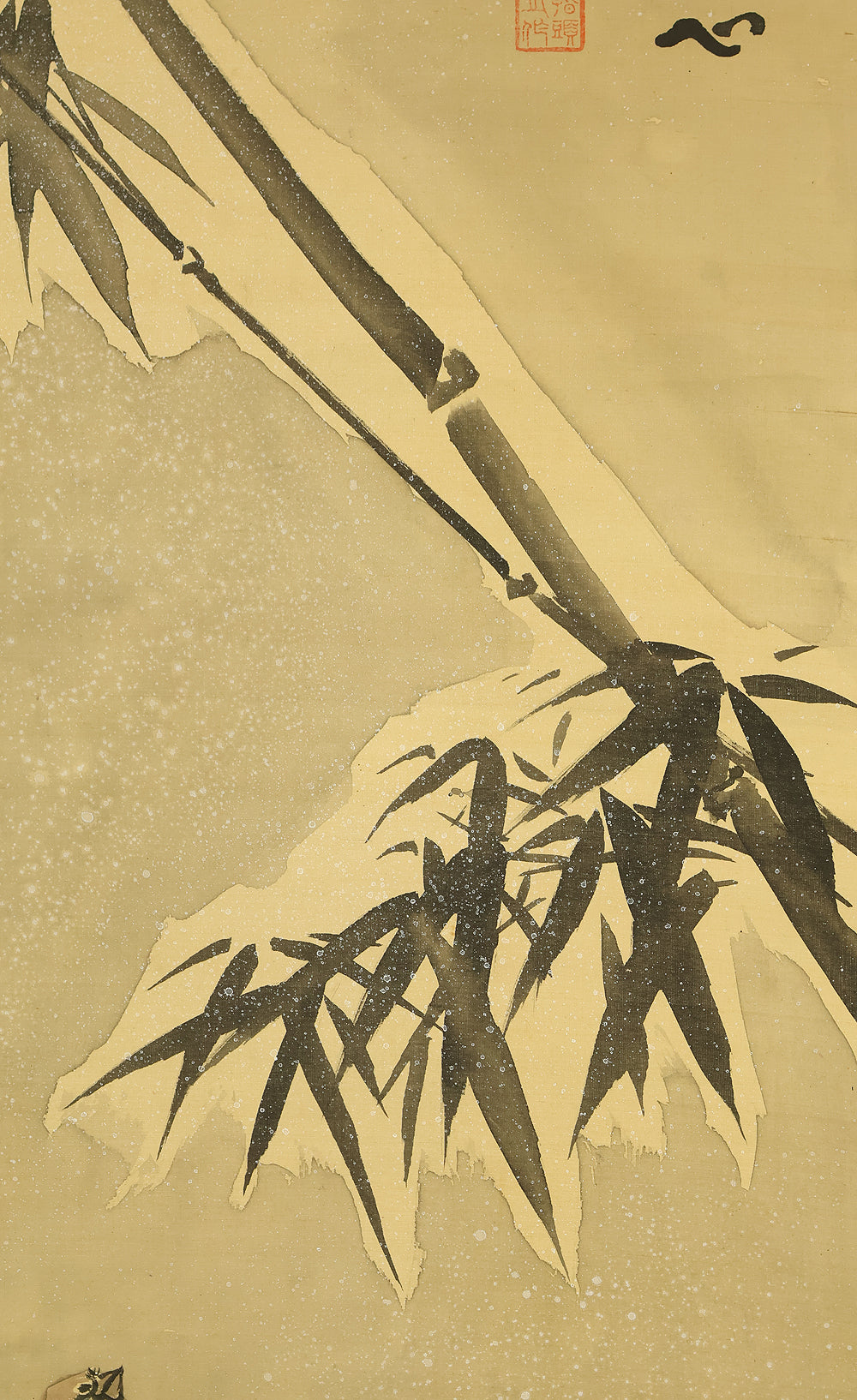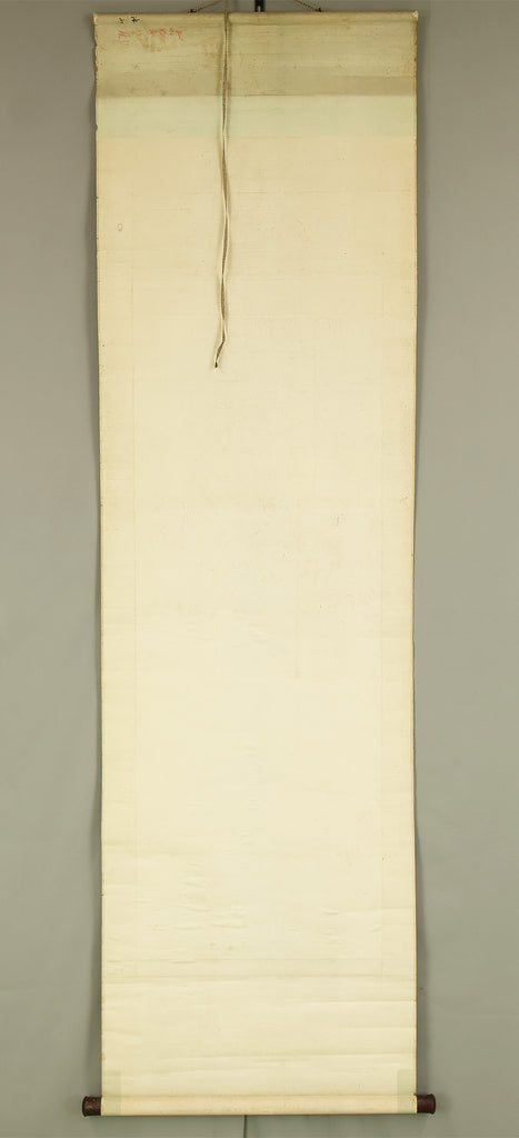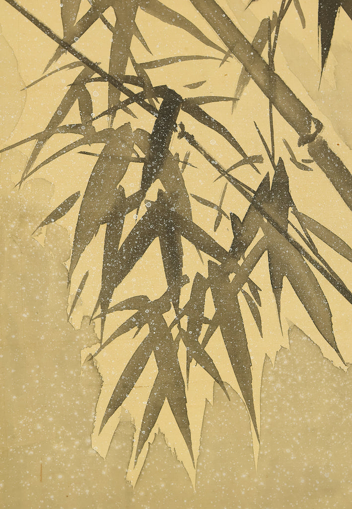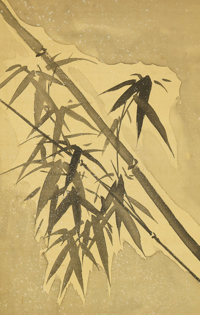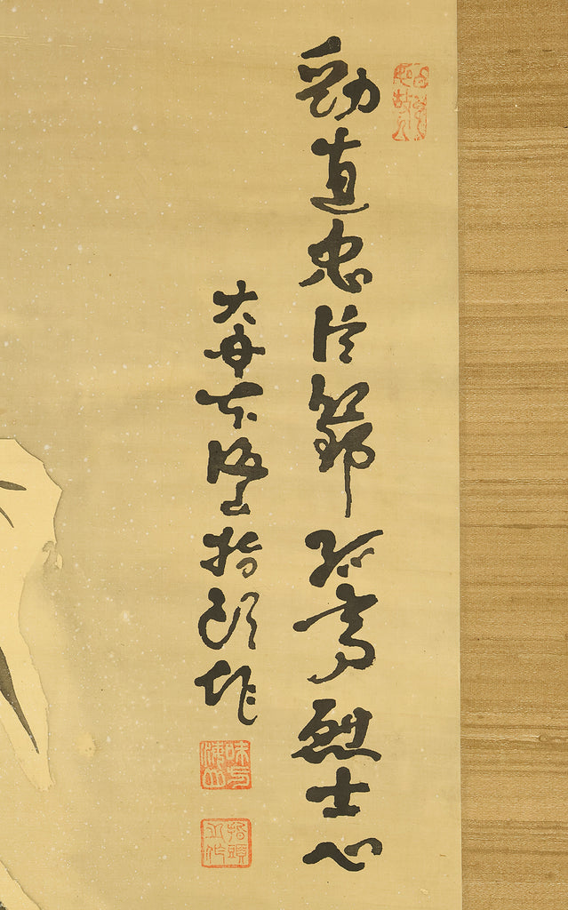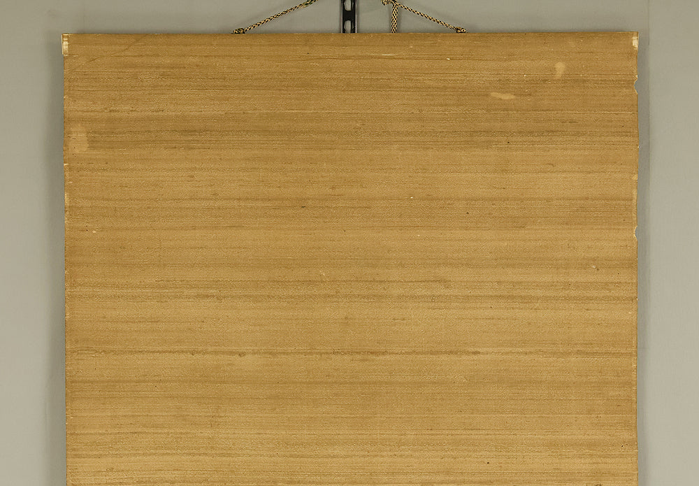 This evocative hanging scroll by Ajikata Kaizan (1863–1942) depicts a tranquil winter scene: a diagonal sweep of bamboo above a cluster of seven sparrows gathered on snowy ground. The composition is rendered in soft ink tones, with delicate gradations suggesting snowfall and quietude. What sets this work apart is Kaizan’s remarkable technique—painted entirely with his fingertips, not a brush—imbuing the forms with a tactile immediacy and rhythmic spontaneity. Signed “Kaizan Shito saku” (海山指頭作) and sealed “Ajikata Kaizan” (味方海山), the scroll reflects Kaizan’s deep roots in Nanga (literati painting), inherited from his mentor Tanomura Chokunyu, yet transformed through his personal, unconventional method. The sparrows, symbols of resilience and companionship, paired with the bamboo’s quiet strength, evoke a mood of gentle endurance—an elegant fusion of technique, symbolism, and seasonal poetry.
