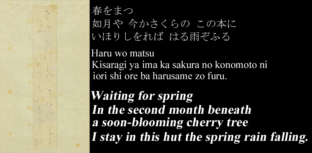 如月や 今かさくらの この本に いほりしをれば はる雨ぞふる