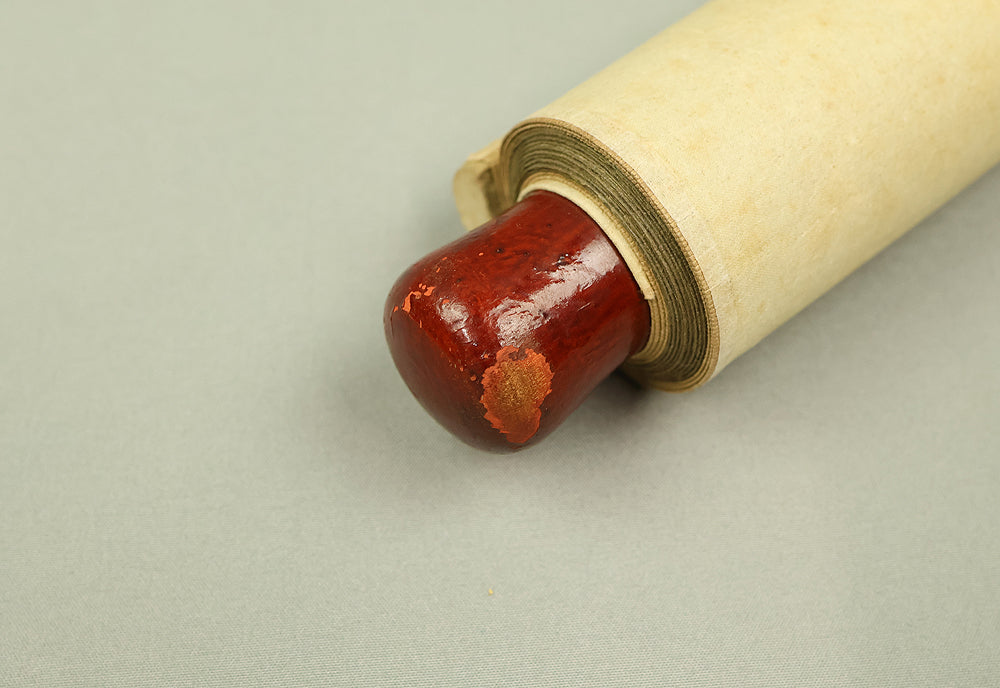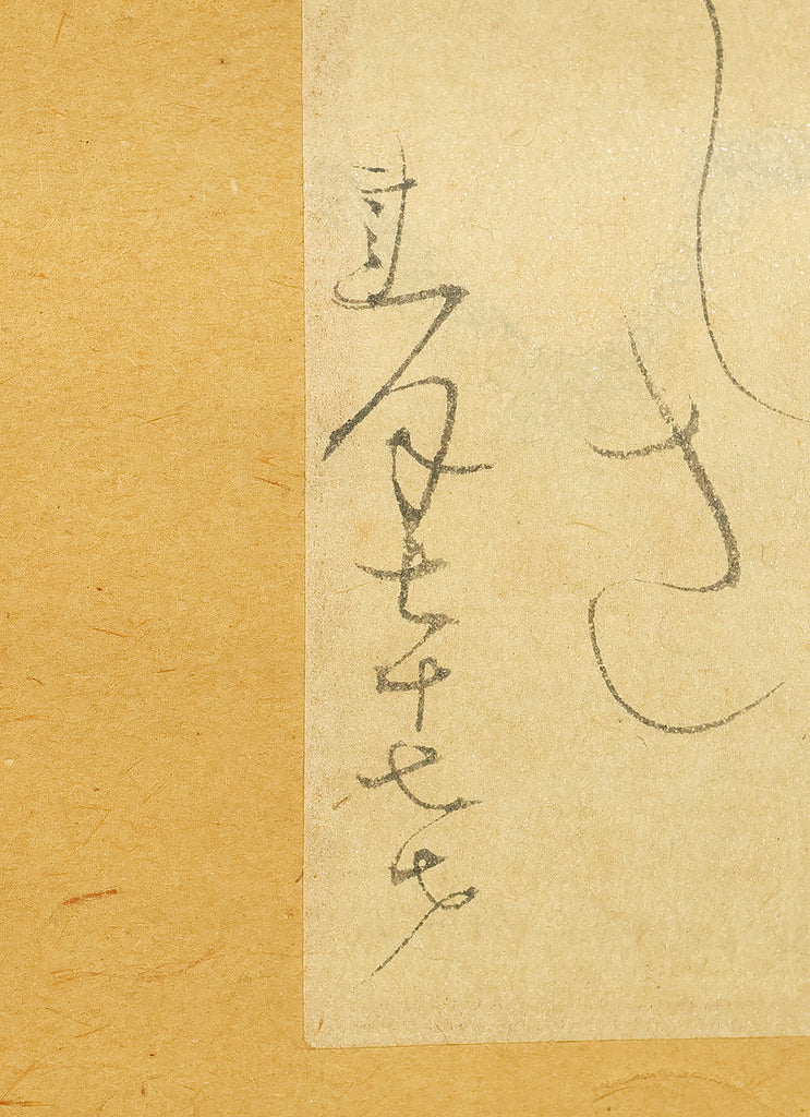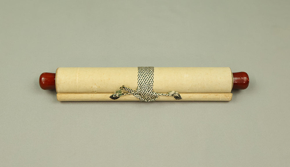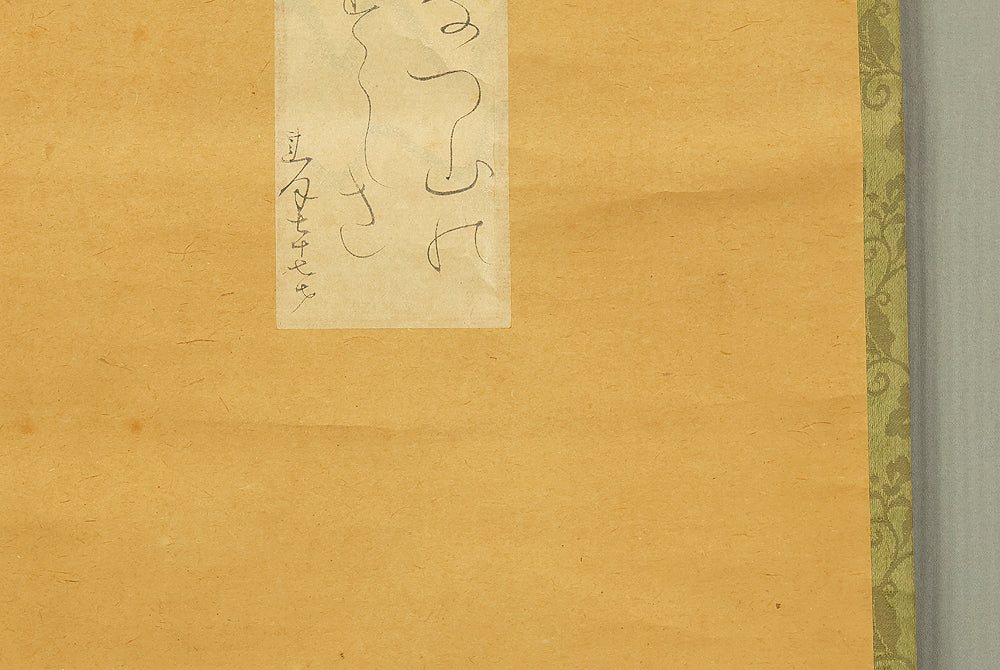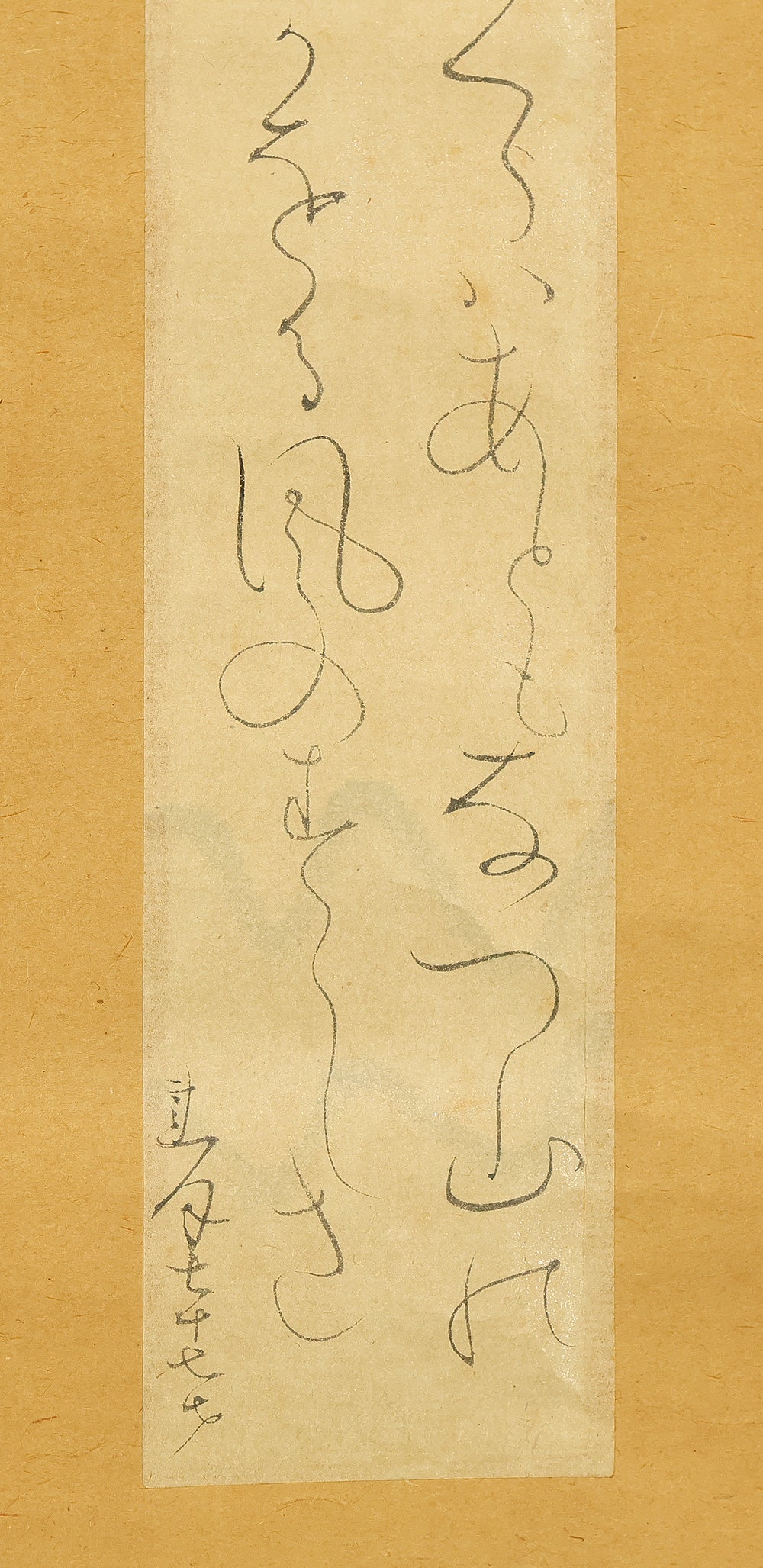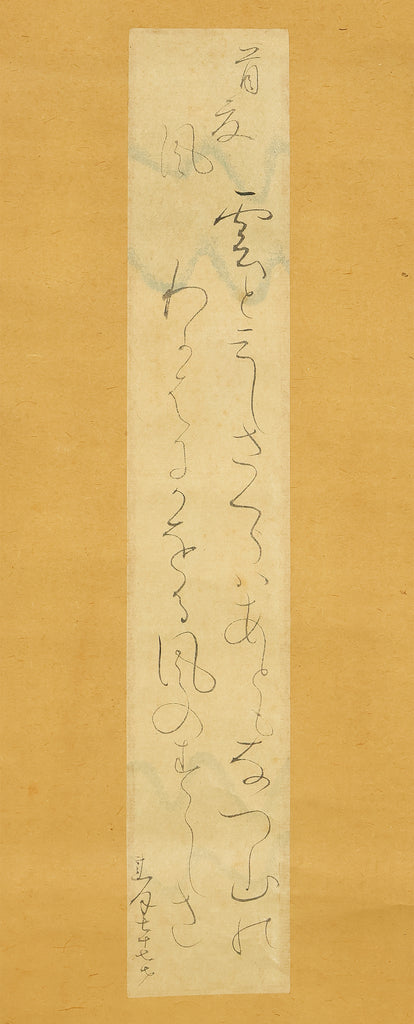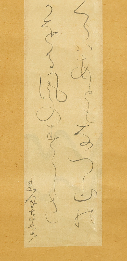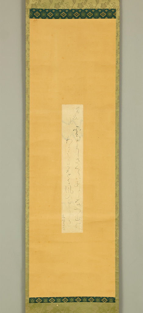 This antique tanzaku-style hanging scroll presents a refined waka by Otagaki Rengetsu, written in her flowing, unmistakable hand and signed “Rengetsu, 77 years old” (蓮月七十七才). In this poem, she reflects on the fleeting transformation from spring to summer—cherry blossoms disappearing like clouds, replaced by the cool wind moving through fresh green leaves in the mountain air. The verse is rendered with the quiet clarity and emotional depth characteristic of Rengetsu’s mature work. The calligraphy carries the gentle restraint of a poet-monk who shaped her art through a life of hardship, wandering, and deep spiritual practice. Her brushstrokes, soft yet deliberate, embody the same sensitivity found in her celebrated pottery and handwritten waka, offering a glimpse into the contemplative world she cultivated. This scroll stands as a graceful testament to Rengetsu’s legacy, combining literary elegance with the intimate warmth of her calligraphic style—an evocative piece that brings both seasonal atmosphere and historical presence into the space where it is displayed.