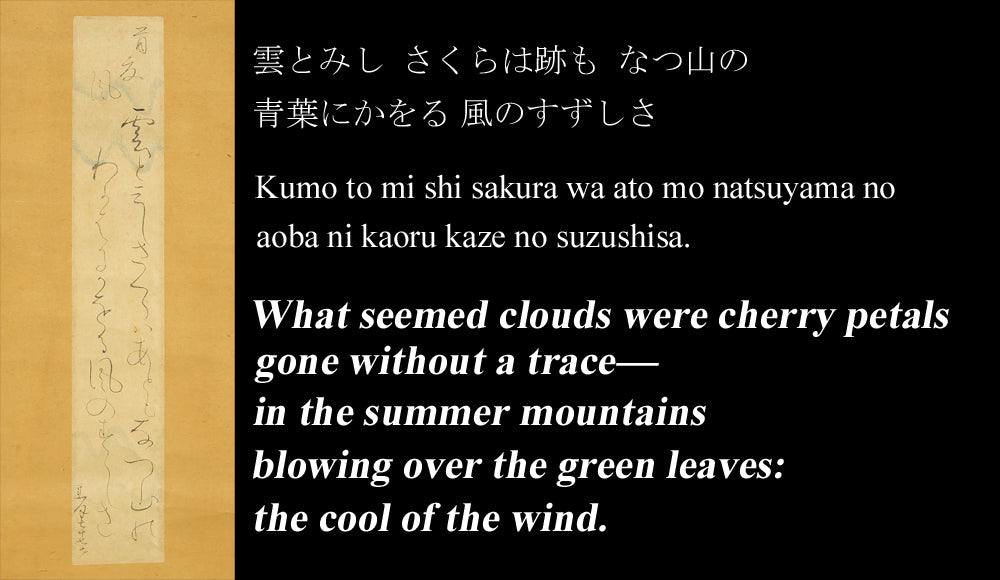 Kumo to mi shi sakura wa ato mo natsuyama no aoba ni kaoru kaze no suzushisa.
