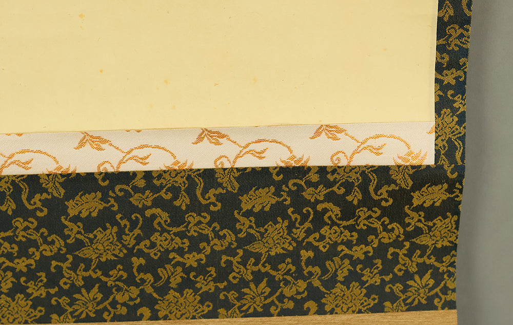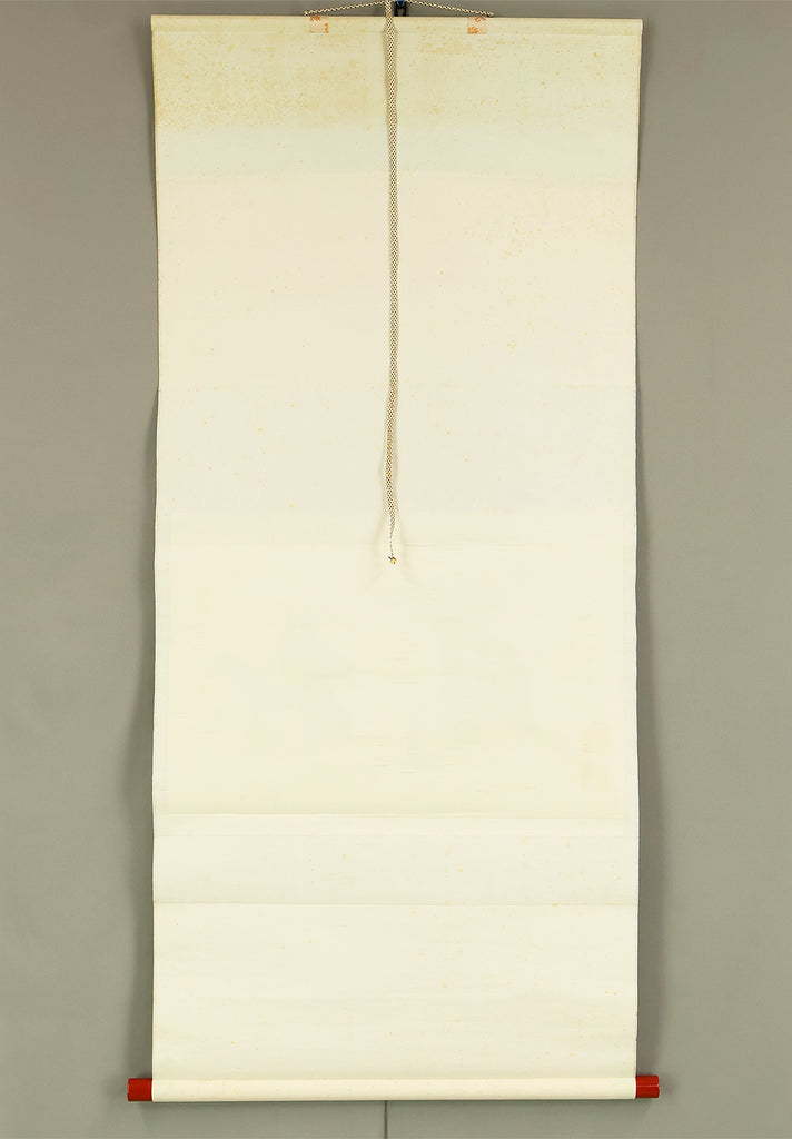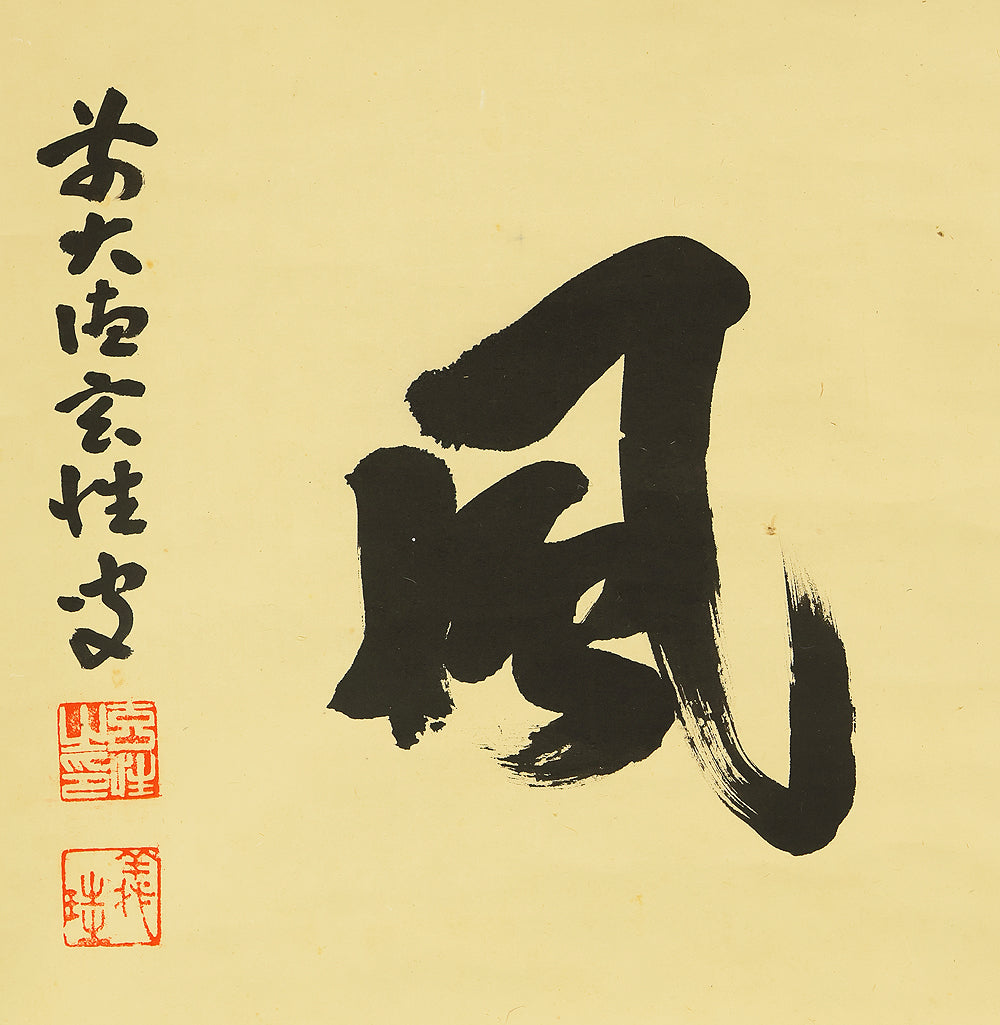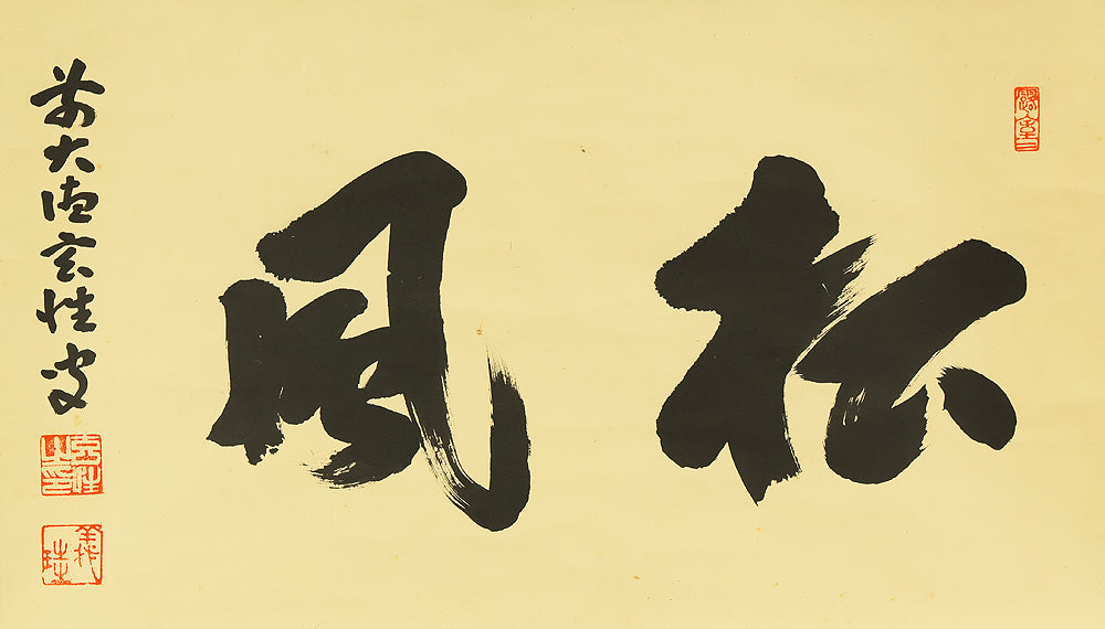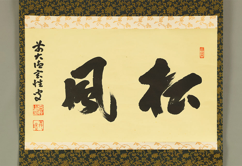 This Zen hanging scroll by Miyanishi Genjo (宮西玄性, 1904–1982)—former abbot of Obai-in, Daitoku-ji—features the bold calligraphy “松風” (Shōfū), meaning “pine wind.” In Zen tradition, this term evokes the subtle sound of wind through pine needles, symbolizing focused awareness and undistracted presence. In the tea ceremony, Shōfū refers to the sound of boiling water in the kettle, encouraging practitioners to center their attention solely on that sound, free from worldly distractions. Signed “Zen Daitoku Genjo sō” (前大徳 玄性 叟) and sealed “Genjo noin” (玄性之印) and “Gikei” (義珪), the scroll embodies the spiritual clarity and aesthetic restraint of Rinzai Zen calligraphy. An original box (tomobako) is included, affirming the work’s authenticity and reverent preservation. This piece offers a contemplative focal point for meditation, tea practice, or interior display, rooted in the refined legacy of Daitoku-ji.