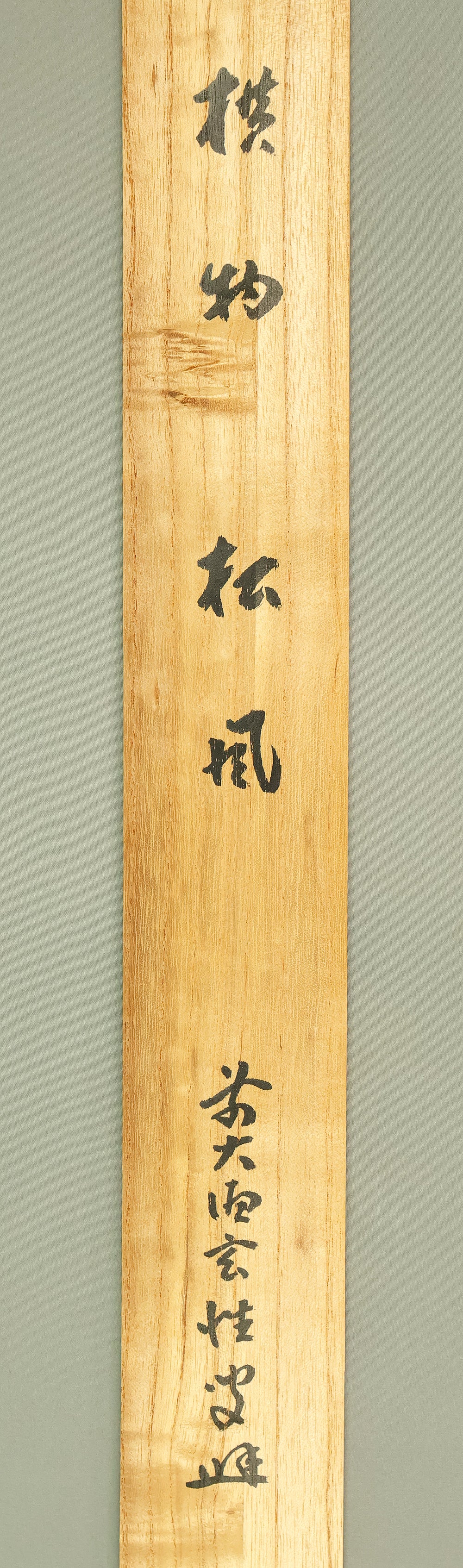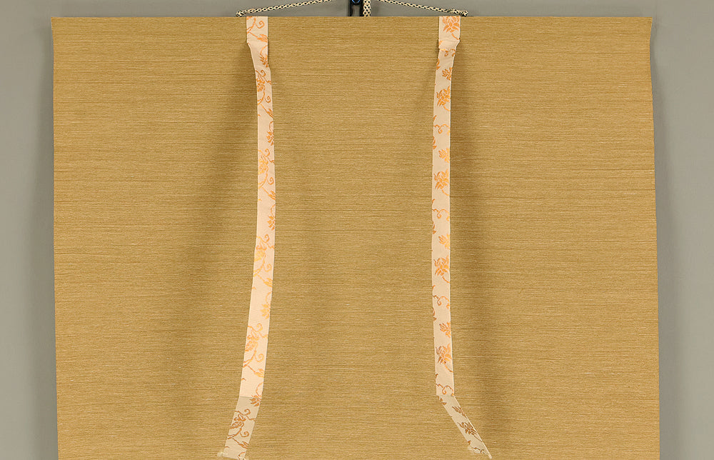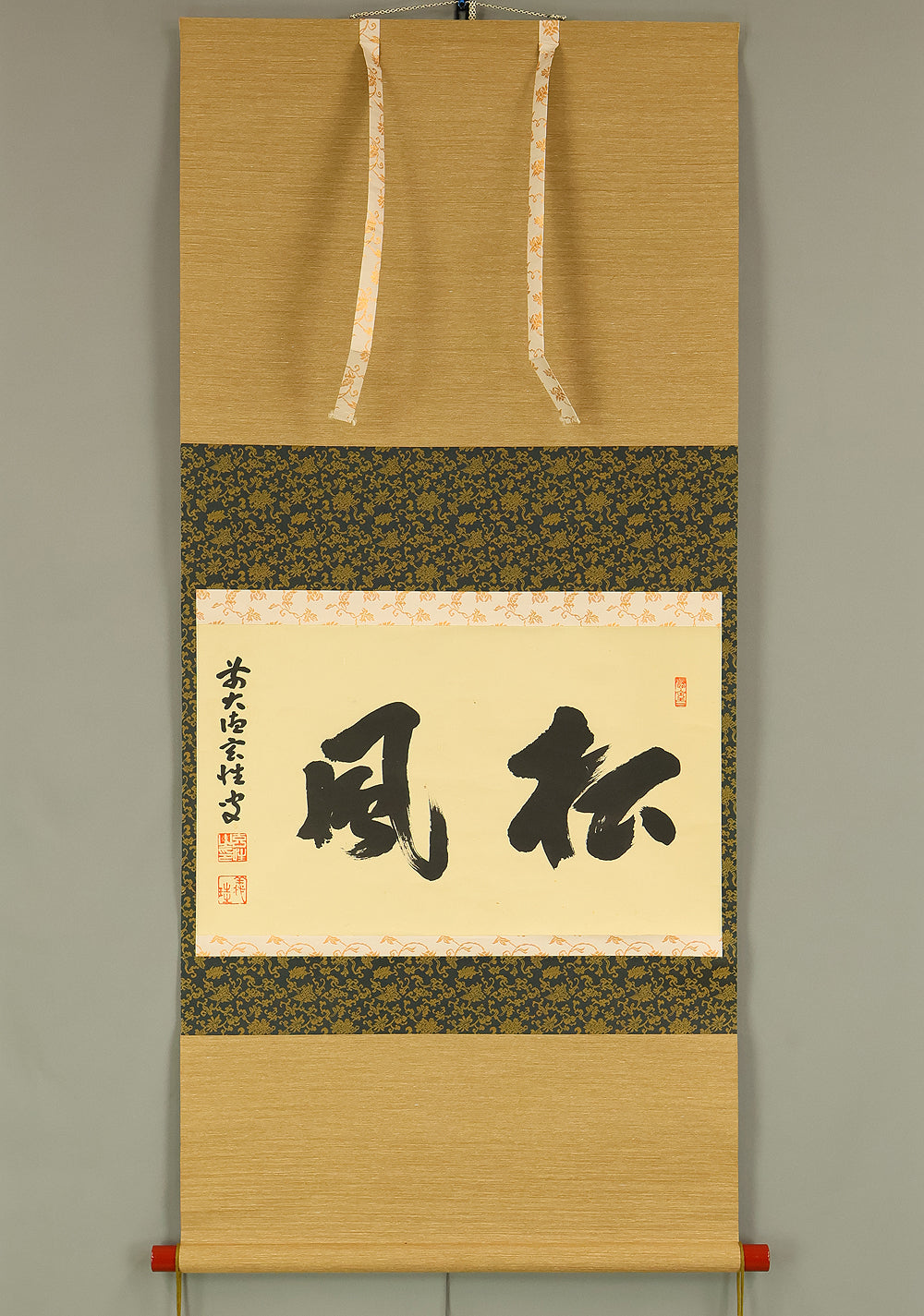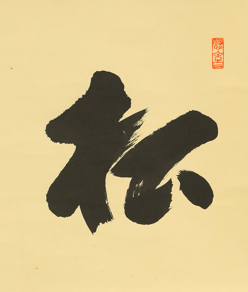 This Zen hanging scroll by Miyanishi Genjo (宮西玄性, 1904–1982)—former abbot of Obai-in, Daitoku-ji—features the bold calligraphy “松風” (Shōfū), meaning “pine wind.” In Zen tradition, this term evokes the subtle sound of wind through pine needles, symbolizing focused awareness and undistracted presence. In the tea ceremony, Shōfū refers to the sound of boiling water in the kettle, encouraging practitioners to center their attention solely on that sound, free from worldly distractions. Signed “Zen Daitoku Genjo sō” (前大徳 玄性 叟) and sealed “Genjo noin” (玄性之印) and “Gikei” (義珪), the scroll embodies the spiritual clarity and aesthetic restraint of Rinzai Zen calligraphy. An original box (tomobako) is included, affirming the work’s authenticity and reverent preservation. This piece offers a contemplative focal point for meditation, tea practice, or interior display, rooted in the refined legacy of Daitoku-ji.