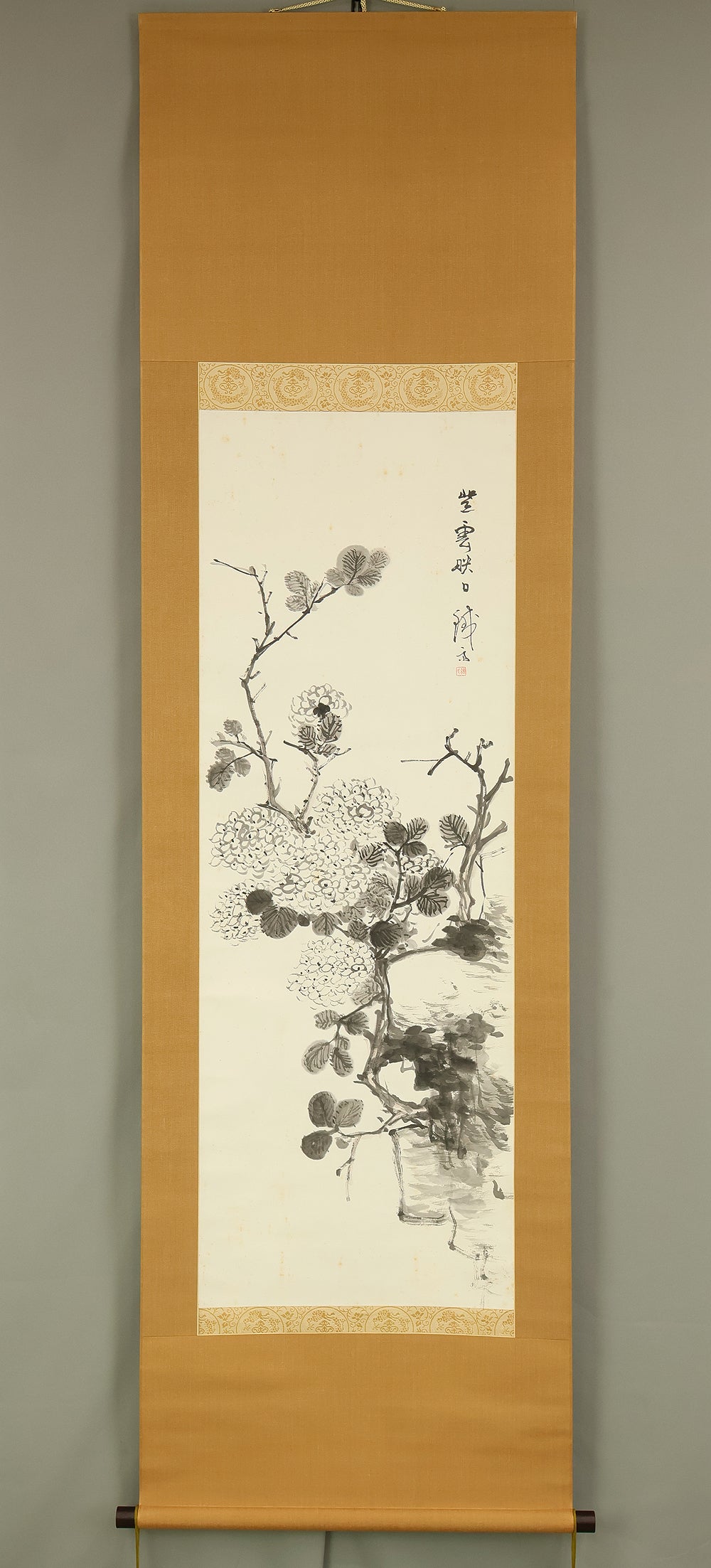 This hanging scroll by Tomioka Tessai (1837–1924) features a bold ink painting of hydrangea, executed in expressive brushwork that reflects the vitality and freedom characteristic of his mature style. Signed “Tessai” (鐵斎) and sealed “Tetsumin” (鐵民), the work exemplifies his unique fusion of Ming and Qing Chinese influences with Yamato-e traditions, developed largely through self-directed study. Tessai was active in Kyoto from the late Edo through Taishō periods and is celebrated as a literati painter who infused classical themes with personal energy and poetic depth. He studied a wide range of disciplines including Confucianism, Kokugaku, Buddhist texts, and poetry, and maintained close associations with figures such as Otagaki Rengetsu, Fujimoto Tesseki, and Yamanaka Shinteno. The scroll is housed in an appraisal box attributed to someone named Mishima (三嶋), suggesting it has been preserved with care and recognized for its cultural value.