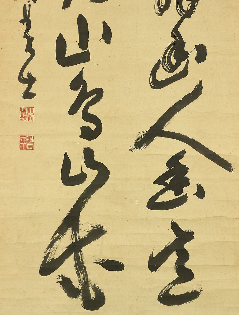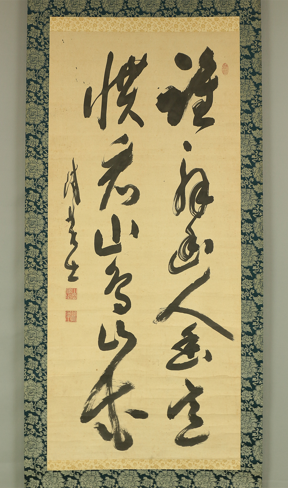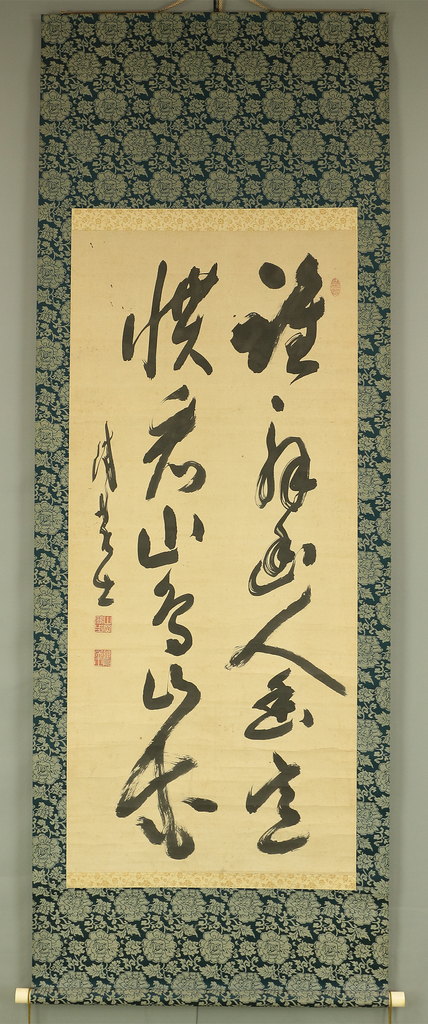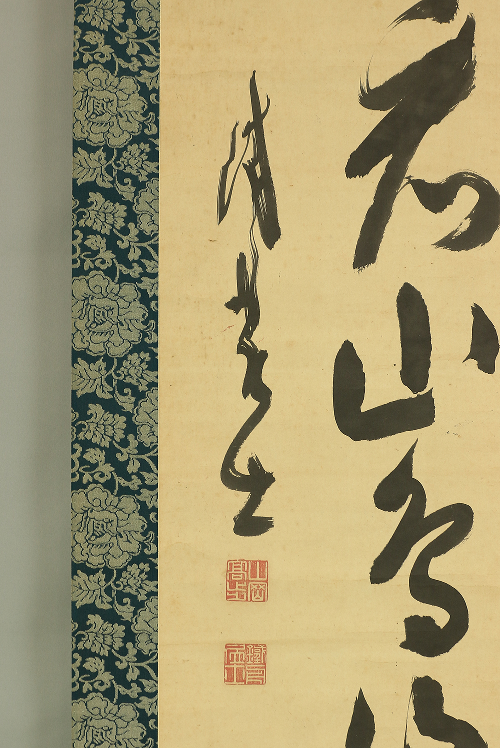 —offers a poetic glimpse into the quiet solitude and spiritual detachment of the recluse, a theme deeply resonant with Tesshu’s own practice of swordsmanship, Zen, and calligraphy. The brushwork is bold yet fluid, reflecting his mastery of Mushin (no-mind), where form arises from pure presence rather than conscious control. Signed “Tesshu” (鉄舟) and sealed “Yamaoka Takayuki” (山岡高歩) and “Tesshu Koji” (鉄舟居士), the scroll stands as both a literary and visual testament to his lifelong pursuit of unity between action and awareness. It is not merely a decorative piece, but a distilled expression of Tesshu’s philosophical depth and the aesthetic rigor of late Edo-period calligraphy.