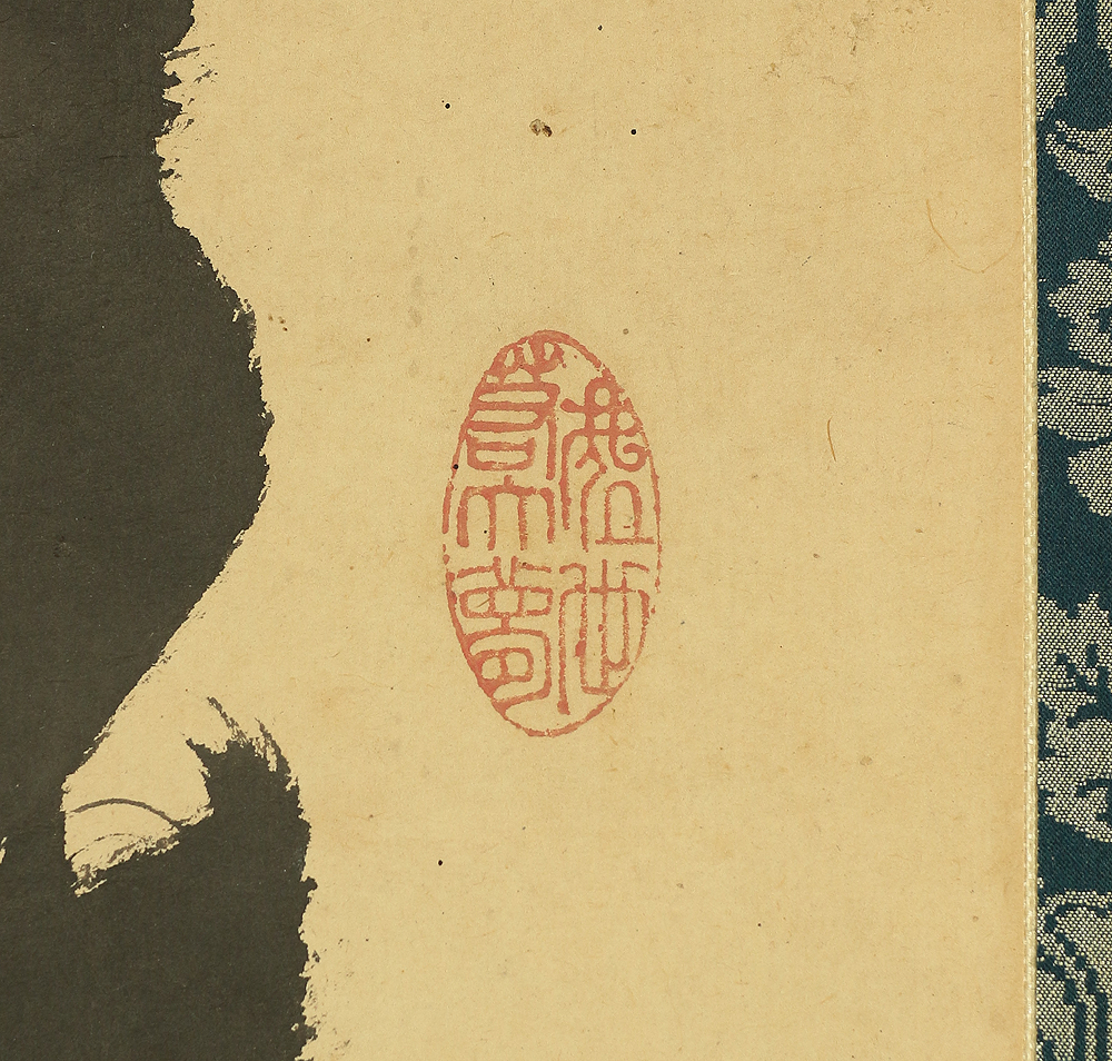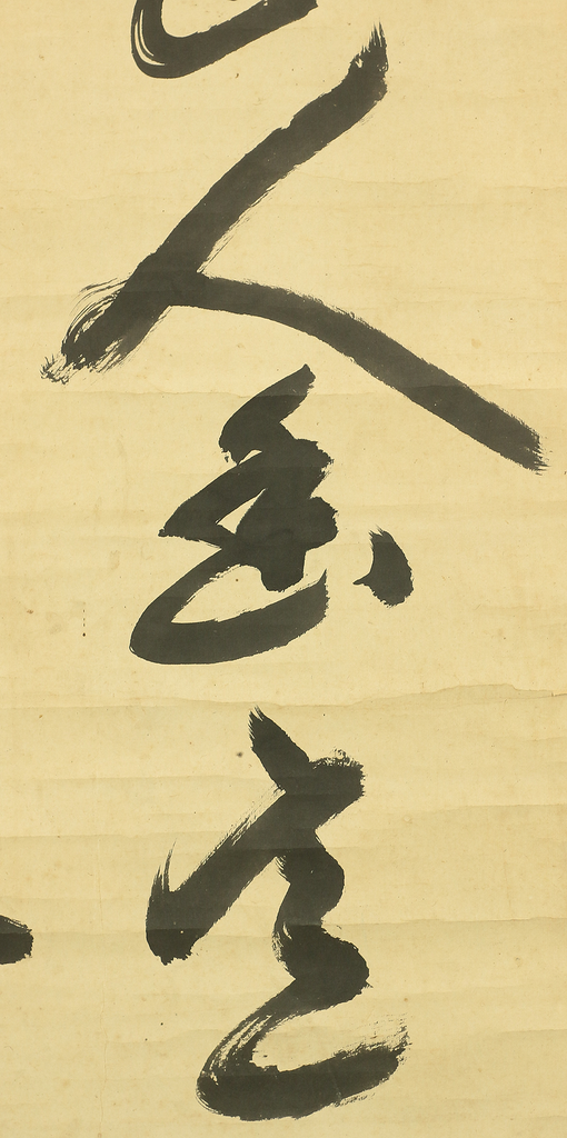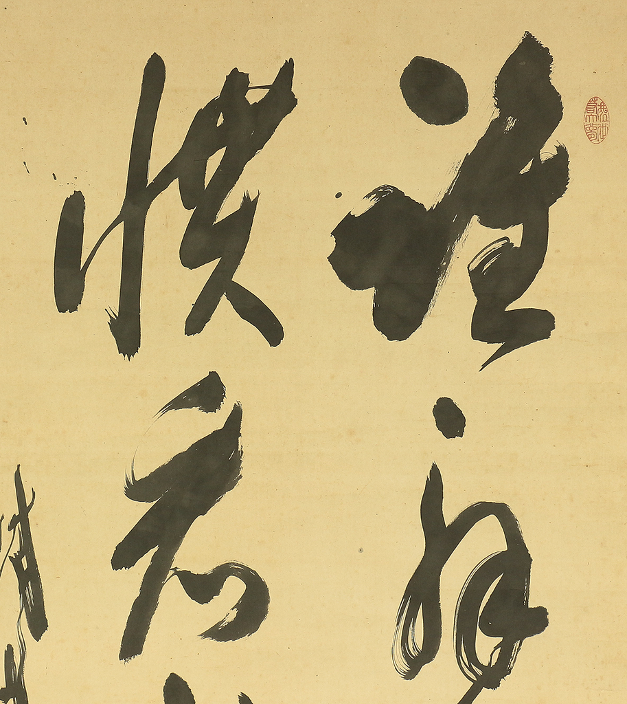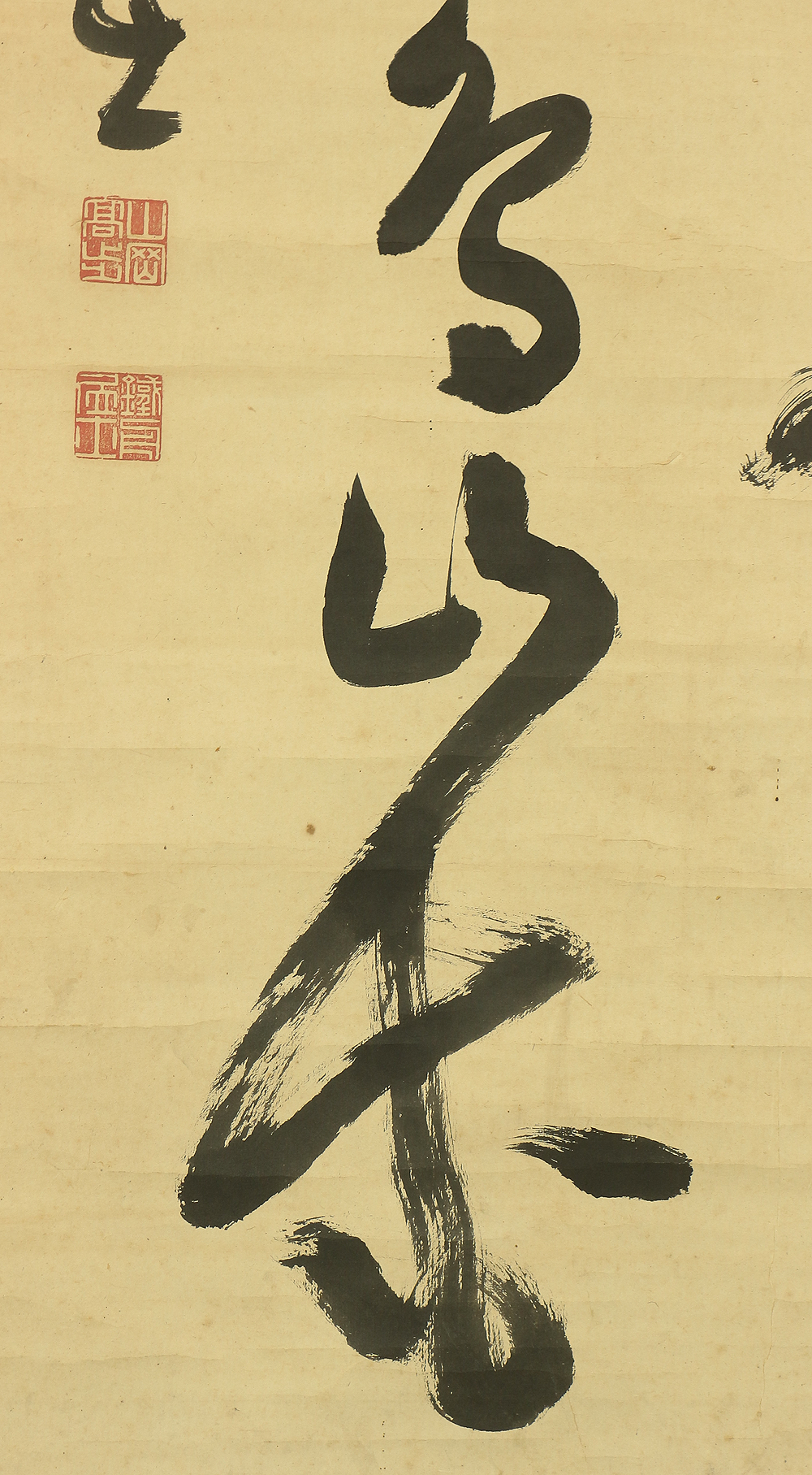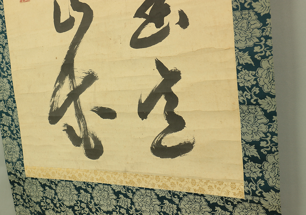—offers a poetic glimpse into the quiet solitude and spiritual detachment of the recluse, a theme deeply resonant with Tesshu’s own practice of swordsmanship, Zen, and calligraphy. The brushwork is bold yet fluid, reflecting his mastery of Mushin (no-mind), where form arises from pure presence rather than conscious control. Signed “Tesshu” (鉄舟) and sealed “Yamaoka Takayuki” (山岡高歩) and “Tesshu Koji” (鉄舟居士), the scroll stands as both a literary and visual testament to his lifelong pursuit of unity between action and awareness. It is not merely a decorative piece, but a distilled expression of Tesshu’s philosophical depth and the aesthetic rigor of late Edo-period calligraphy.