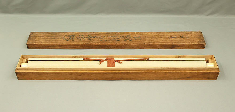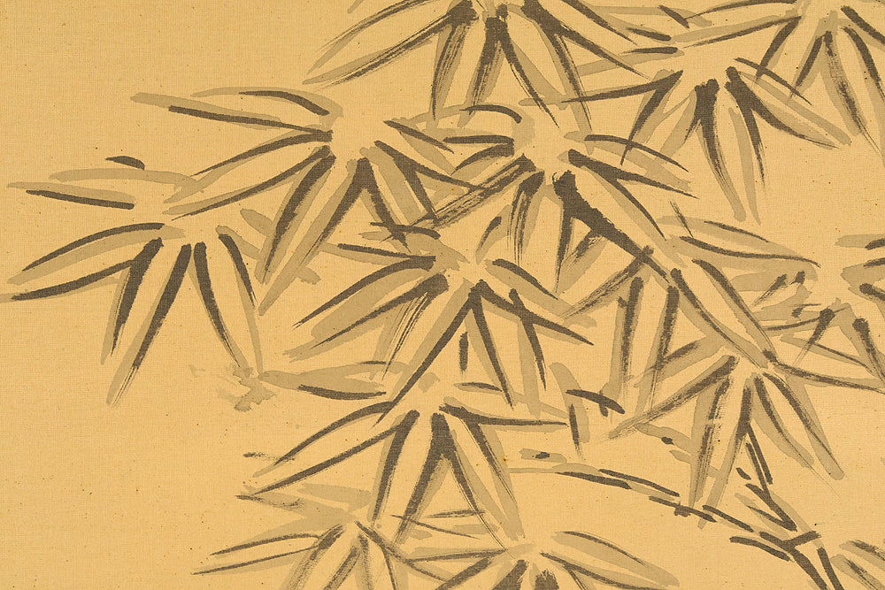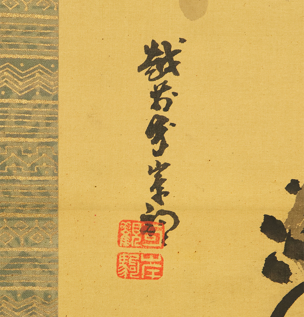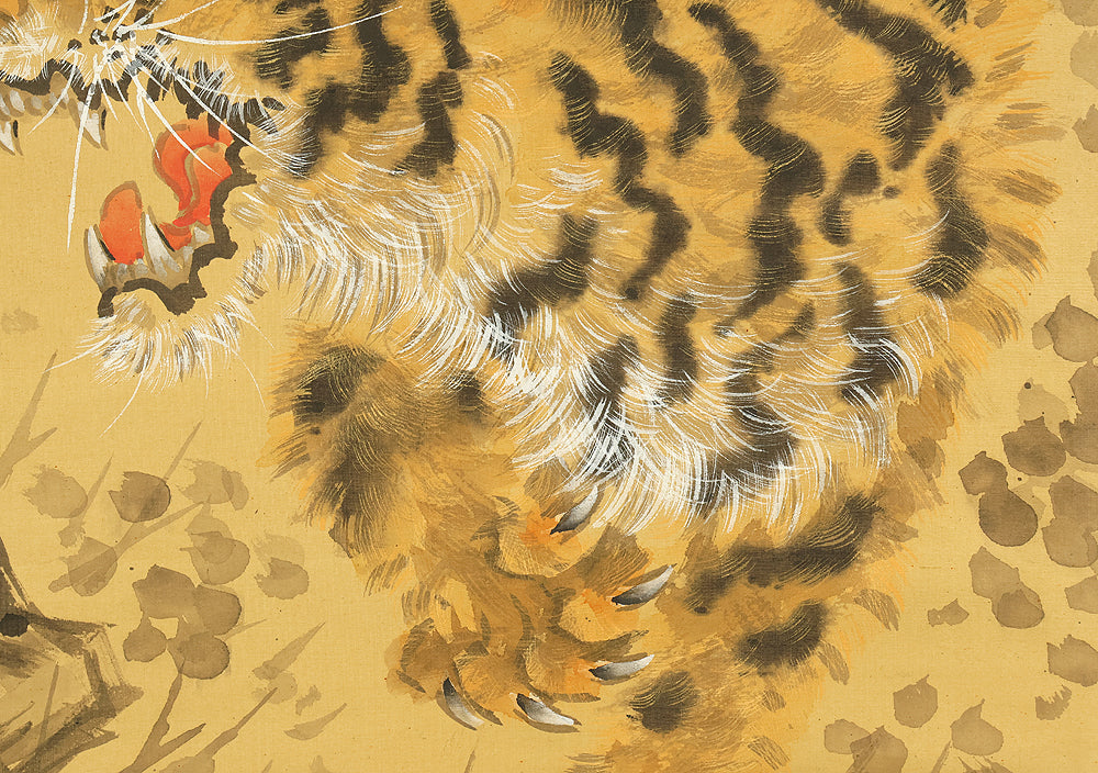 A dynamic and commanding composition by Ganku (岸駒, 1749–1838), this hanging scroll captures a roaring tiger amid bamboo and rocky terrain, rendered with bold, expressive brushwork that conveys both physical power and dramatic presence. The tiger’s open mouth, vivid striping, and tense posture create a sense of immediacy, while the surrounding bamboo adds rhythm and contrast to the scene. Founder of the Kishi school, Ganku was celebrated for his masterful animal paintings—especially tigers—and for blending elements of the Kano, Shin-Nanpin, and Maruyama traditions into a distinctive, lively style. Signed “Echizen no kami Ganku” (越前守岸駒) and sealed “Kakan” (可觀) and “Ganku” (岸駒), the scroll is accompanied by a storage box, offering a powerful example of late Edo-period animal painting and the expressive energy that defines Ganku’s legacy.