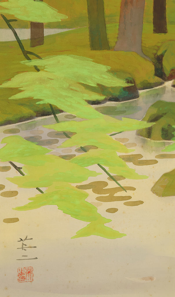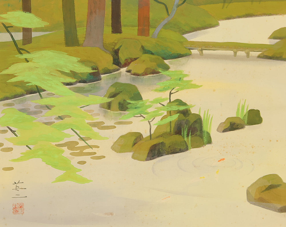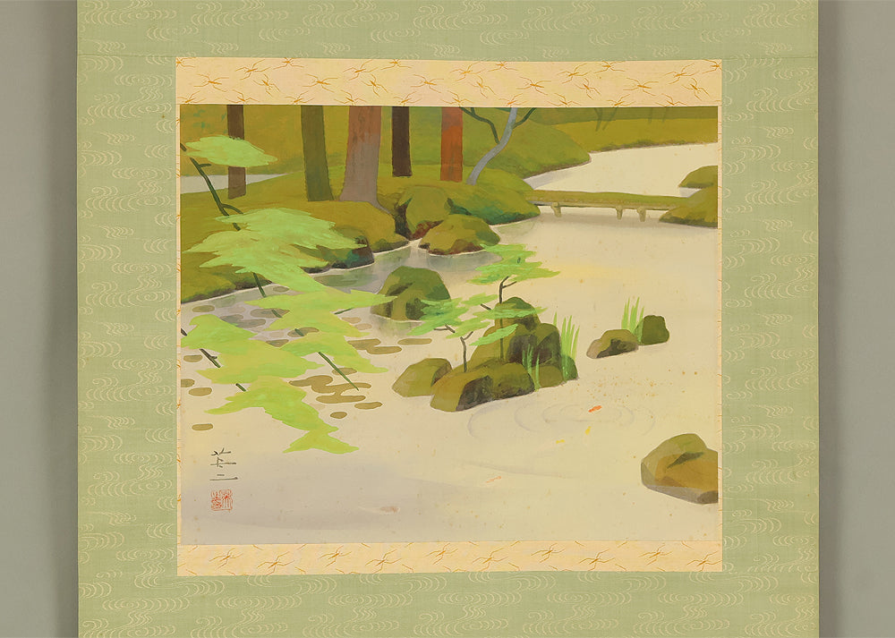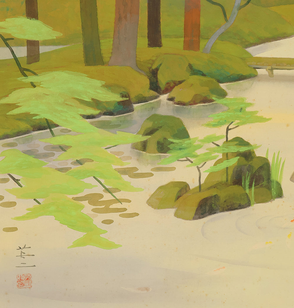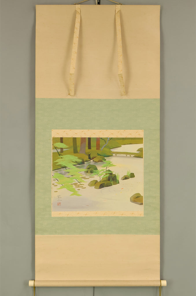 This hanging scroll by Toda Eiji (1910–2009) presents a tranquil Japanese garden scene, where a gently rippling pond is framed by moss-covered rocks, lush foliage, and a wooden bridge nestled in the distance. The composition is rendered with soft, muted tones and delicate brushwork, evoking a sense of seasonal stillness and meditative calm. Toda’s sensitivity to natural rhythm and spatial harmony reflects his training under Ikeda Yoson of the Seitōsha and his long-standing involvement with the Nitten exhibition society. Signed “Eiji” (英二) and sealed “Ei no in” (英之印), the scroll is accompanied by a storage box, offering a refined example of modern Nihonga landscape painting rooted in classical aesthetics and regional sensibility.