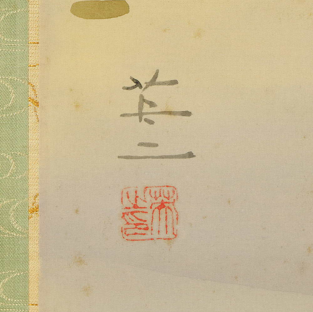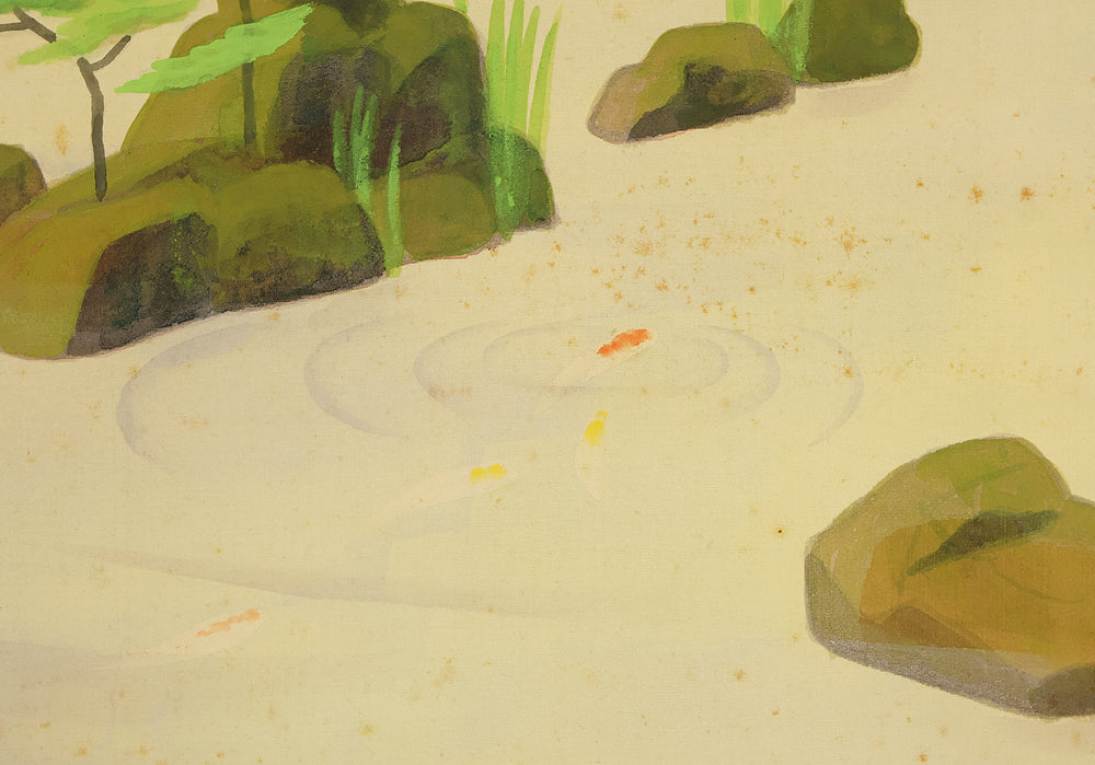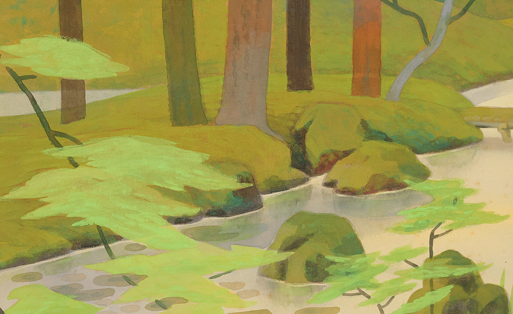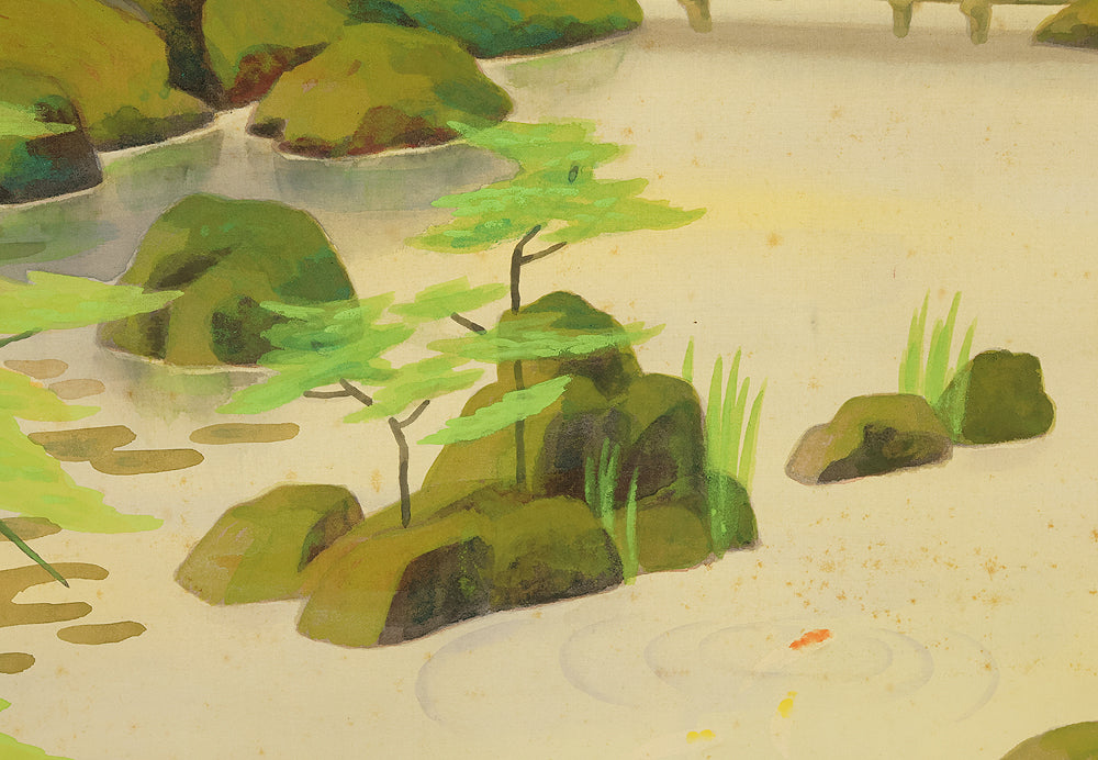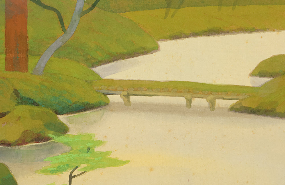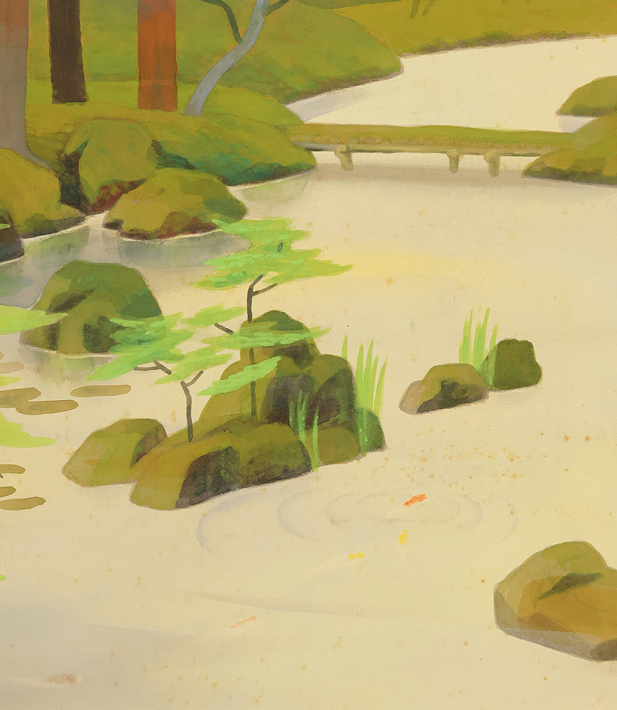 This hanging scroll by Toda Eiji (1910–2009) presents a tranquil Japanese garden scene, where a gently rippling pond is framed by moss-covered rocks, lush foliage, and a wooden bridge nestled in the distance. The composition is rendered with soft, muted tones and delicate brushwork, evoking a sense of seasonal stillness and meditative calm. Toda’s sensitivity to natural rhythm and spatial harmony reflects his training under Ikeda Yoson of the Seitōsha and his long-standing involvement with the Nitten exhibition society. Signed “Eiji” (英二) and sealed “Ei no in” (英之印), the scroll is accompanied by a storage box, offering a refined example of modern Nihonga landscape painting rooted in classical aesthetics and regional sensibility.