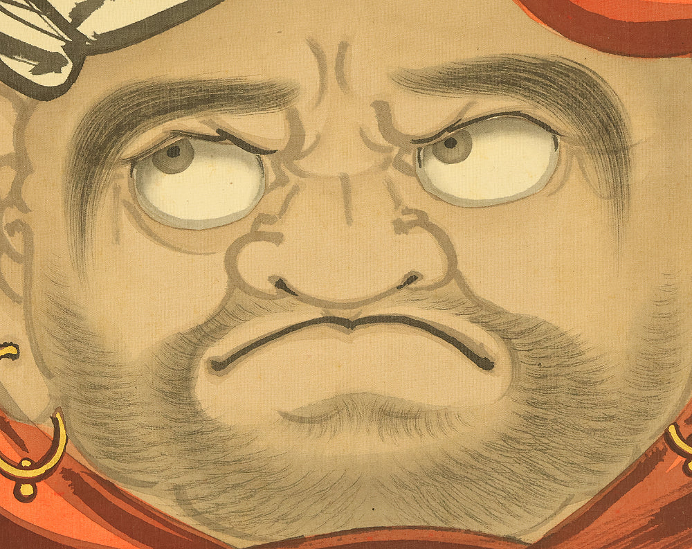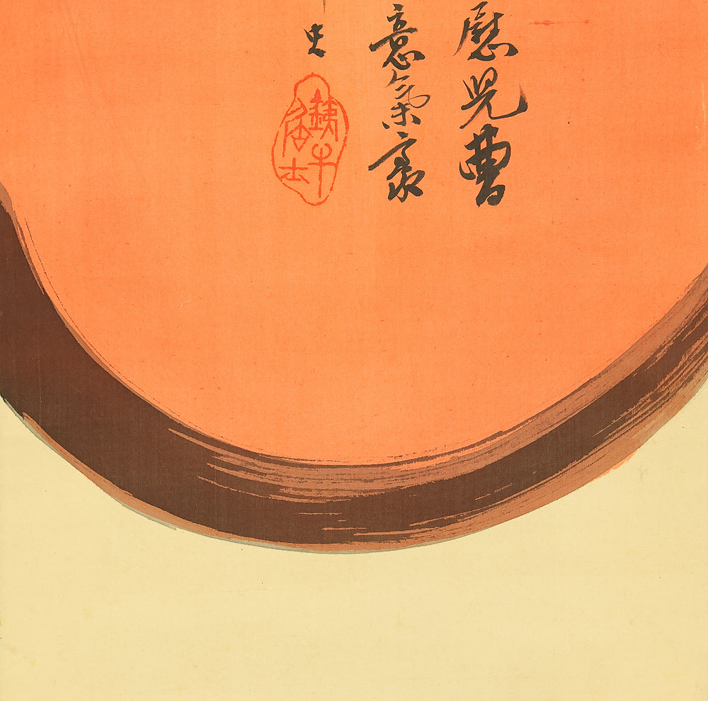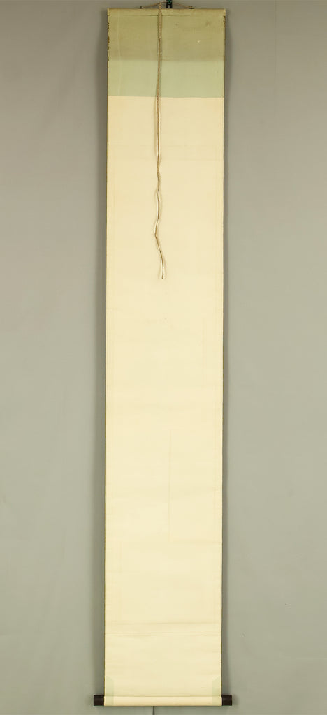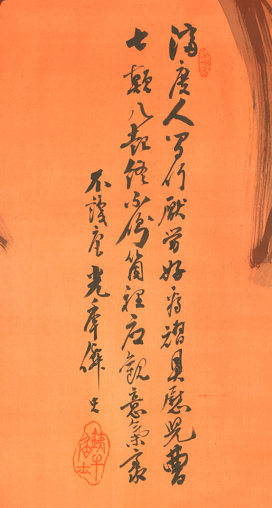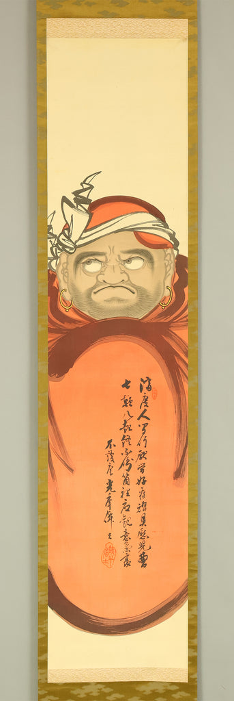 Japanese hanging scroll depicting a powerful red Bodhidharma (Daruma), a symbolic figure of Zen Buddhism representing perseverance, awakening, and unwavering determination. The bold facial expression and intense gaze convey spiritual strength, while the vivid red robe enhances the iconic presence of Daruma as a talisman of resilience and good fortune. The work is painted by Kimura Konen (born 1877), an artist active from the Meiji through Taisho and early Showa periods, who studied under Suzuki Shonen and mastered the Shijo school in Kyoto. The scroll bears the artist’s signature “Konen senshi” and seals including “Tetsugyu koji,” confirming authorship. Executed with confident brushwork and balanced composition, this scroll is well suited for display in a tokonoma or contemplative space, offering both visual impact and deep symbolic meaning rooted in Japanese Zen tradition.