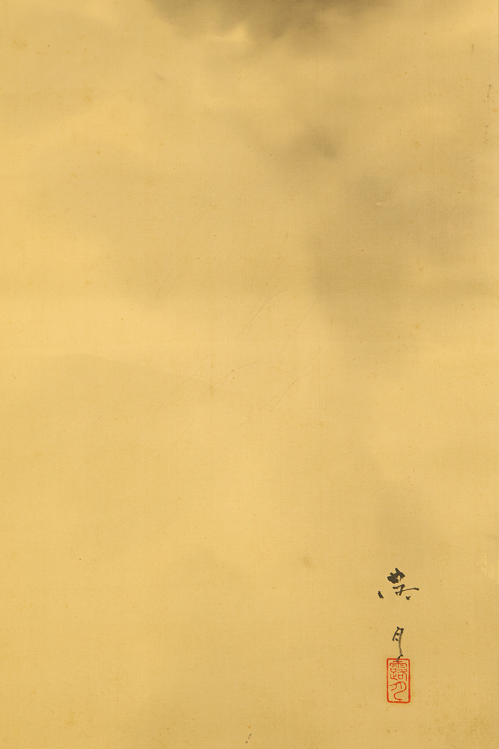 A restrained yet powerful atmosphere defines this ink painting of Mount Fuji by Murata Rogetsu, where the mountain rises through drifting clouds with a clarity that feels both monumental and serene. The artist’s brushwork moves between soft, atmospheric washes and firm, deliberate strokes that shape the iconic peak, allowing the composition to breathe through its generous use of space. The sea of clouds below adds a sense of quiet elevation, as though the viewer were standing at the edge of dawn. Signed and sealed “Rogetsu” (露月), the work reflects a painter deeply attuned to the expressive possibilities of monochrome ink. In an interior, the scroll introduces a calm vertical presence—the kind of steady, grounding image that subtly sharpens the room’s atmosphere, giving it a sense of clarity and quiet strength.