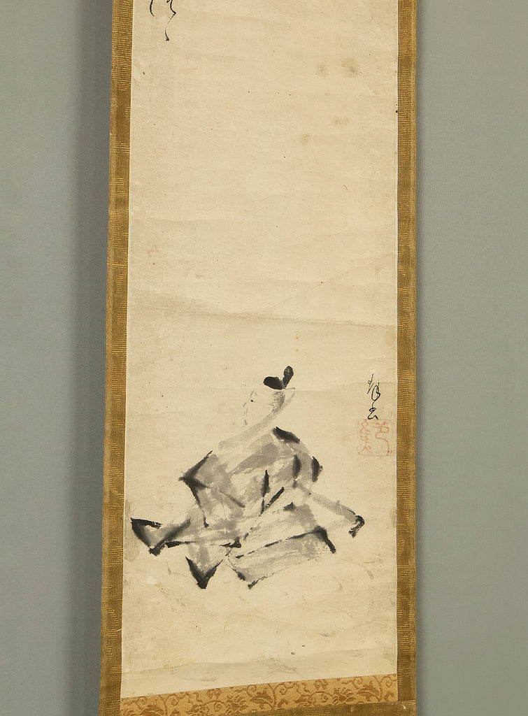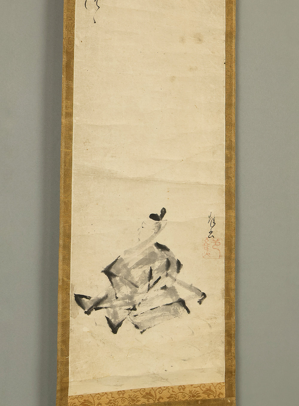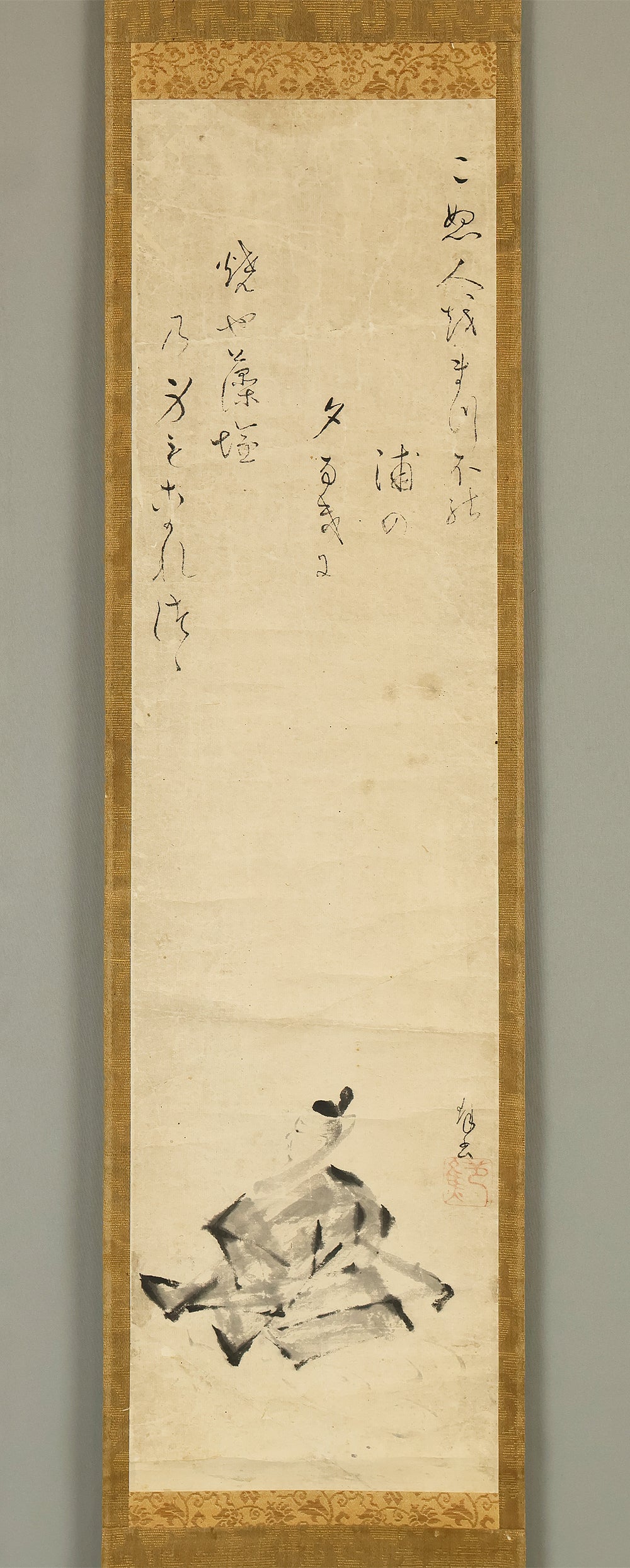 a verse expressing longing so intense it mirrors seaweed burning for salt along the quiet shores of Matsuhō. Rendered below the calligraphy, the ink portrait of Sadaie is executed with controlled, expressive brushwork that evokes the dignified restraint of classical Japanese painting. The scroll bears the seal “Bashō” (芭蕉), aligning the work with the cultural reverence surrounding Japan’s most influential haikai poet. Mounted in an elegant brocade and accompanied by its original box, the piece embodies the harmony of poetry, portraiture, and calligraphic artistry that defines high‑level Edo‑period aesthetics.