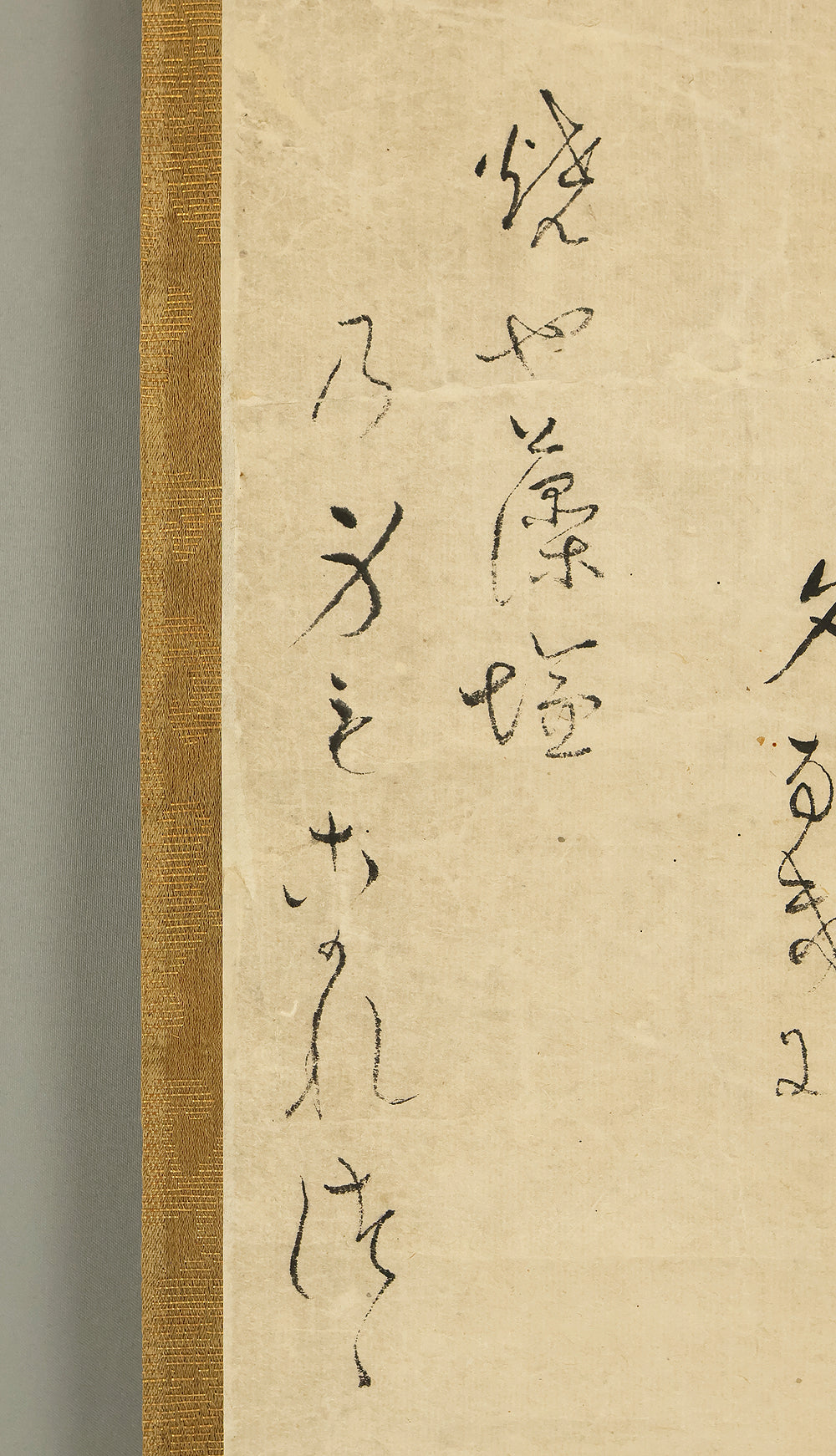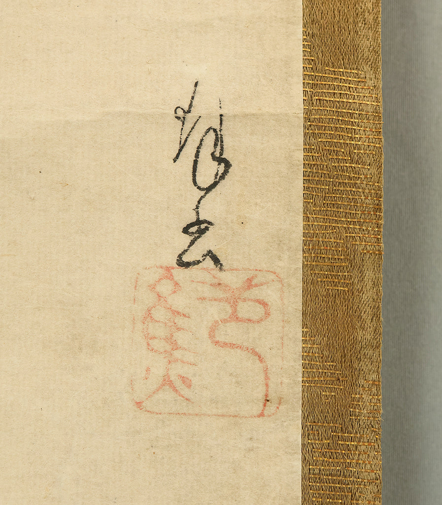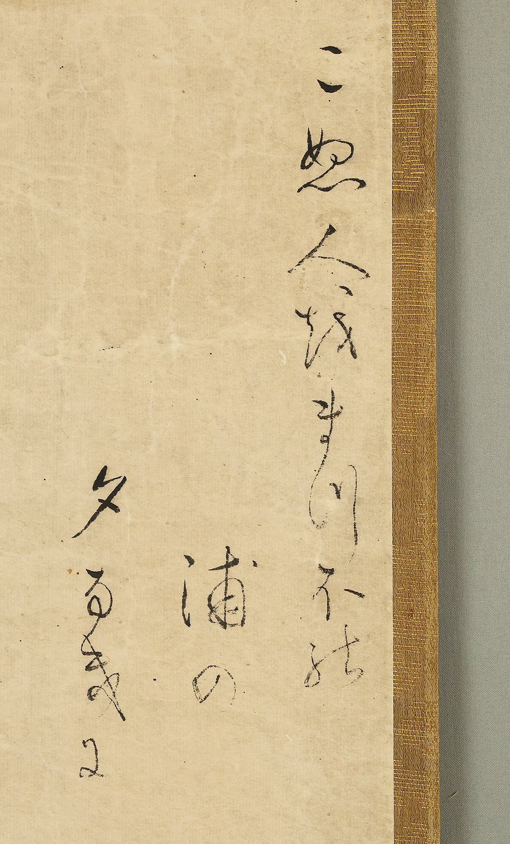 a verse expressing longing so intense it mirrors seaweed burning for salt along the quiet shores of Matsuhō. Rendered below the calligraphy, the ink portrait of Sadaie is executed with controlled, expressive brushwork that evokes the dignified restraint of classical Japanese painting. The scroll bears the seal “Bashō” (芭蕉), aligning the work with the cultural reverence surrounding Japan’s most influential haikai poet. Mounted in an elegant brocade and accompanied by its original box, the piece embodies the harmony of poetry, portraiture, and calligraphic artistry that defines high‑level Edo‑period aesthetics.
