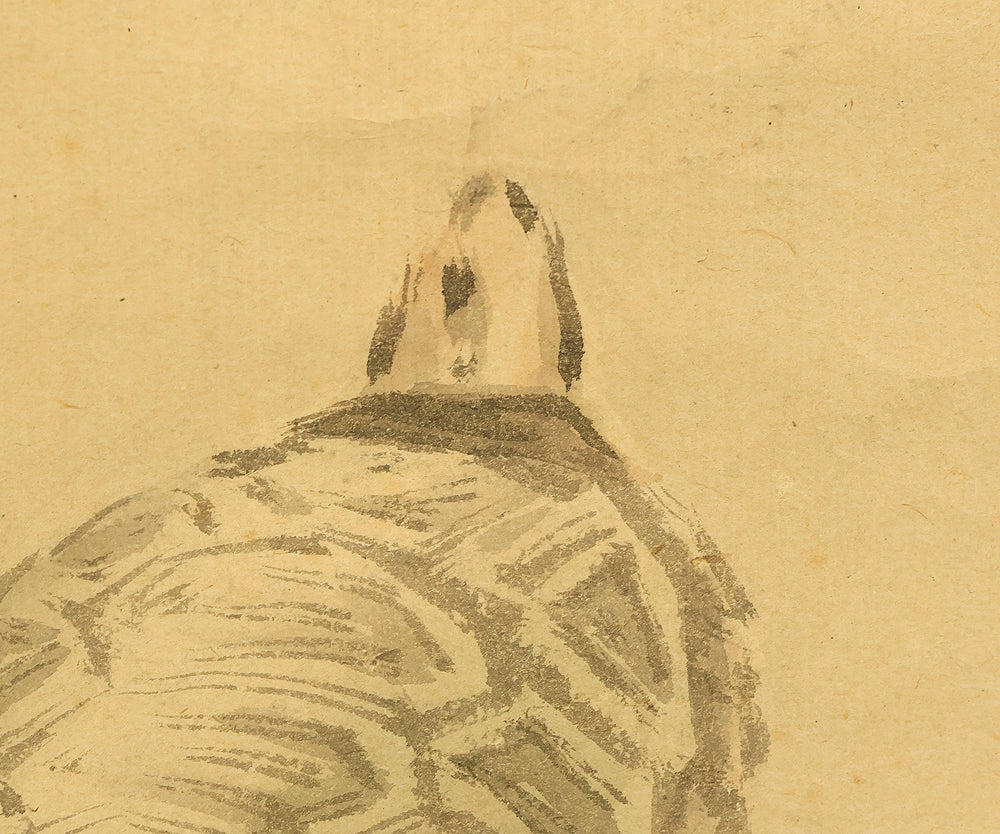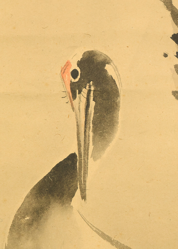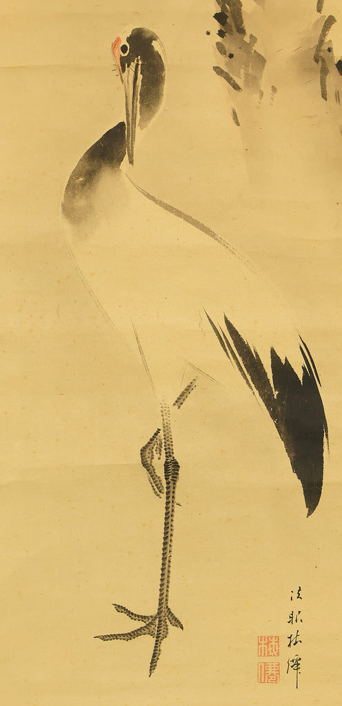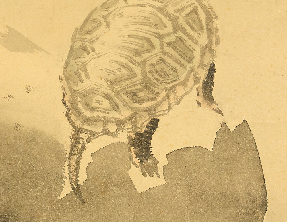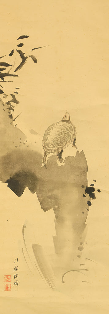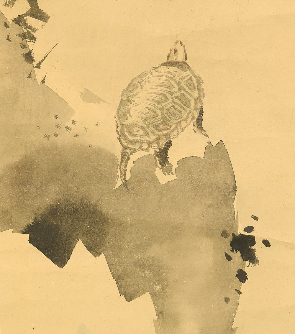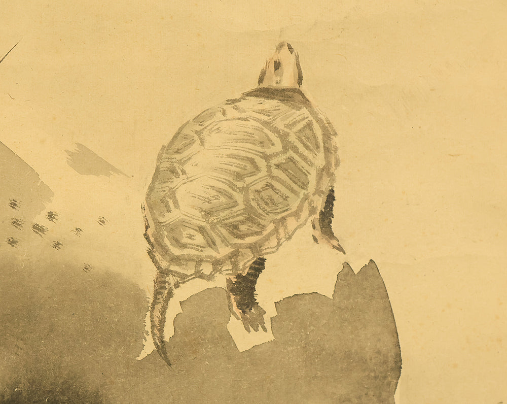 This pair of Japanese hanging scrolls, signed “Hōgen Baisen” (法眼梅僊) and sealed “Baisen” (梅僊), presents a refined and auspicious composition featuring a crane and a turtle—symbols of longevity and harmony—set among pine trees and seasonal foliage. The left scroll depicts a turtle resting on a rocky surface, while the right shows a crane standing gracefully among bamboo, both rendered in delicate ink with subtle tonal variation. The brushwork is elegant and restrained, evoking a quiet dignity in line with classical Japanese aesthetics. The honorific title “Hōgen” indicates the artist’s elevated status, and the overall composition reflects a mature sensibility rooted in the traditions of bird-and-flower painting. The scrolls are mounted in fine brocade and offer a balanced, contemplative presence suitable for formal display.