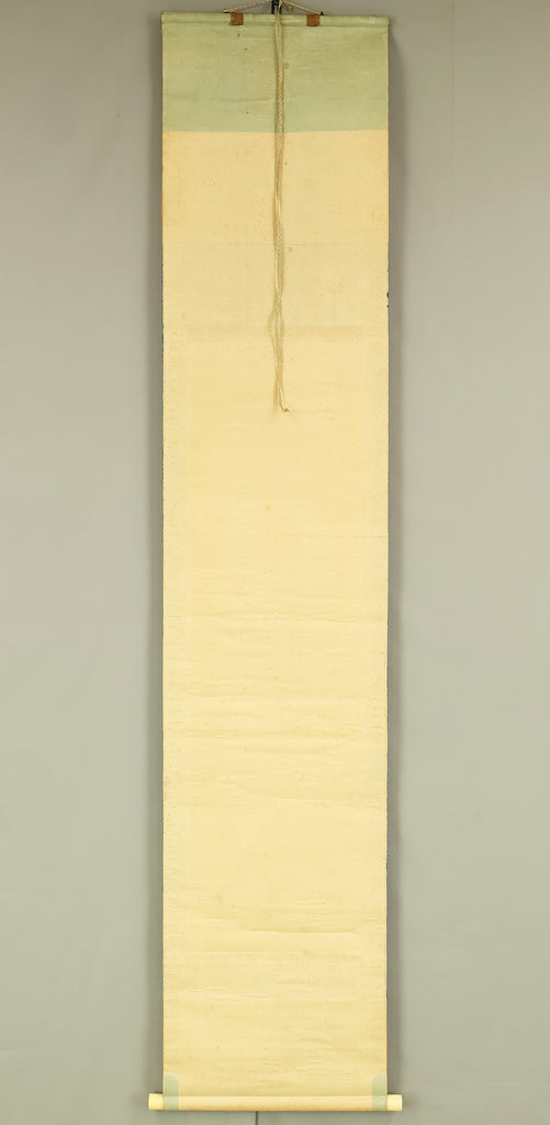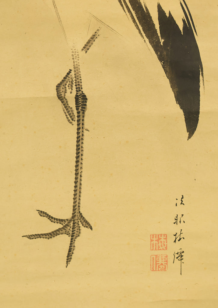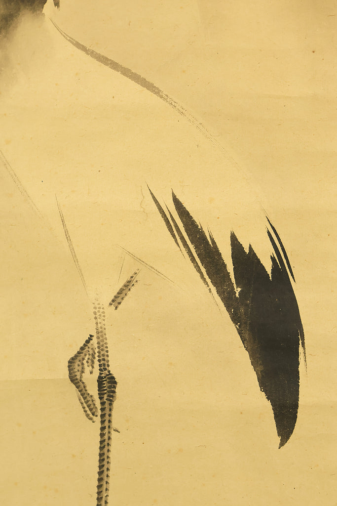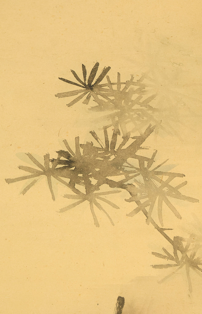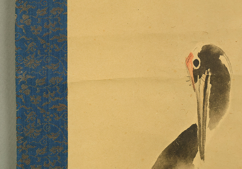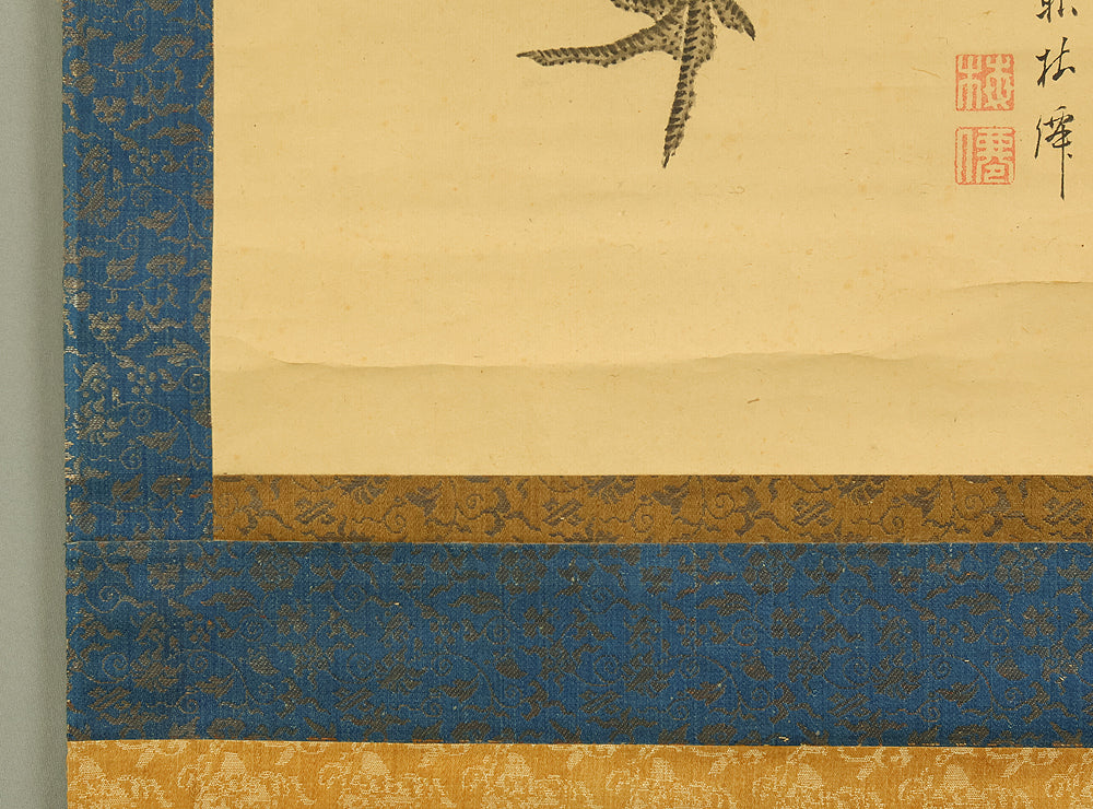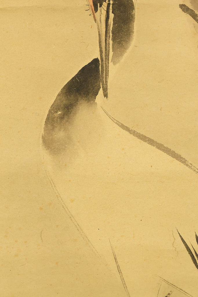 This pair of Japanese hanging scrolls, signed “Hōgen Baisen” (法眼梅僊) and sealed “Baisen” (梅僊), presents a refined and auspicious composition featuring a crane and a turtle—symbols of longevity and harmony—set among pine trees and seasonal foliage. The left scroll depicts a turtle resting on a rocky surface, while the right shows a crane standing gracefully among bamboo, both rendered in delicate ink with subtle tonal variation. The brushwork is elegant and restrained, evoking a quiet dignity in line with classical Japanese aesthetics. The honorific title “Hōgen” indicates the artist’s elevated status, and the overall composition reflects a mature sensibility rooted in the traditions of bird-and-flower painting. The scrolls are mounted in fine brocade and offer a balanced, contemplative presence suitable for formal display.