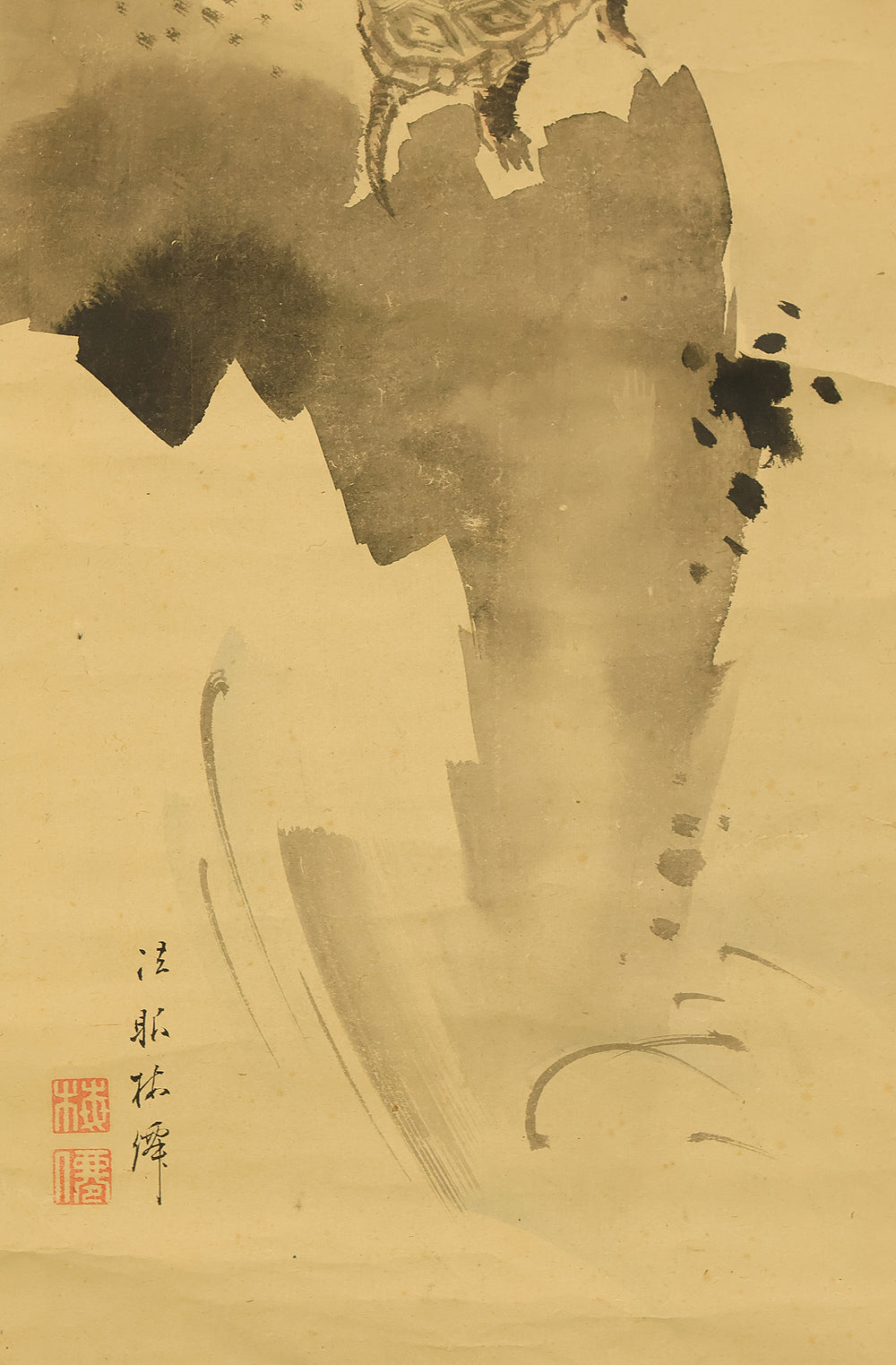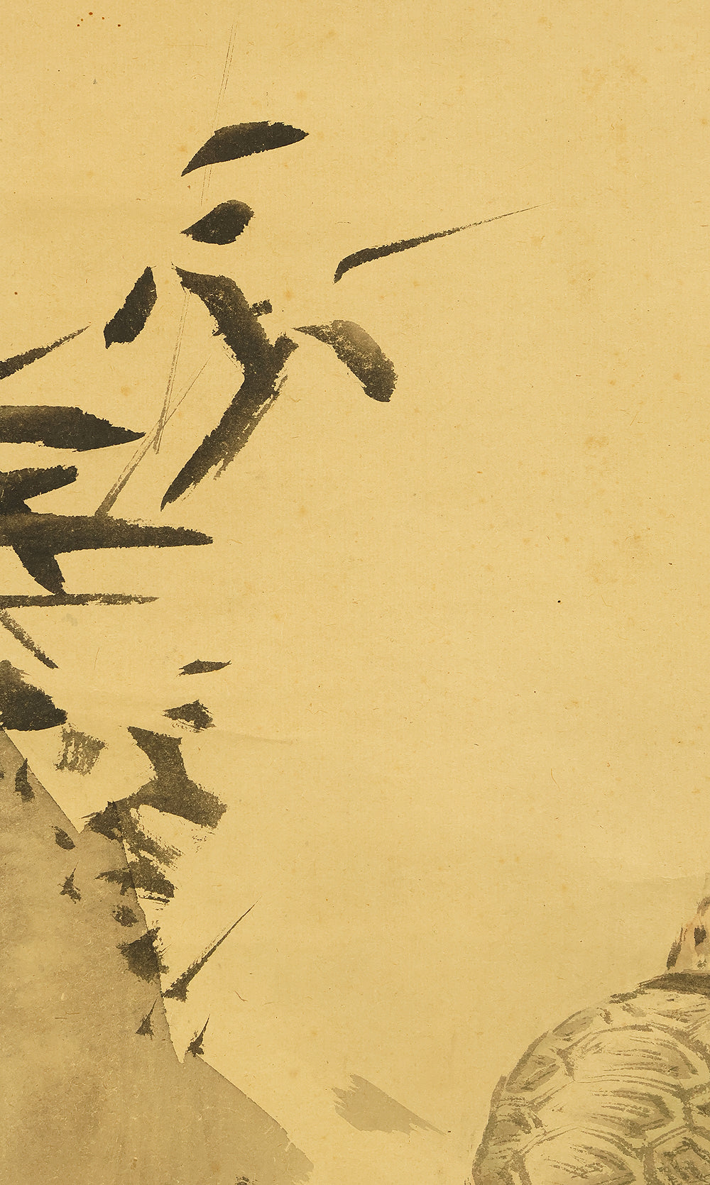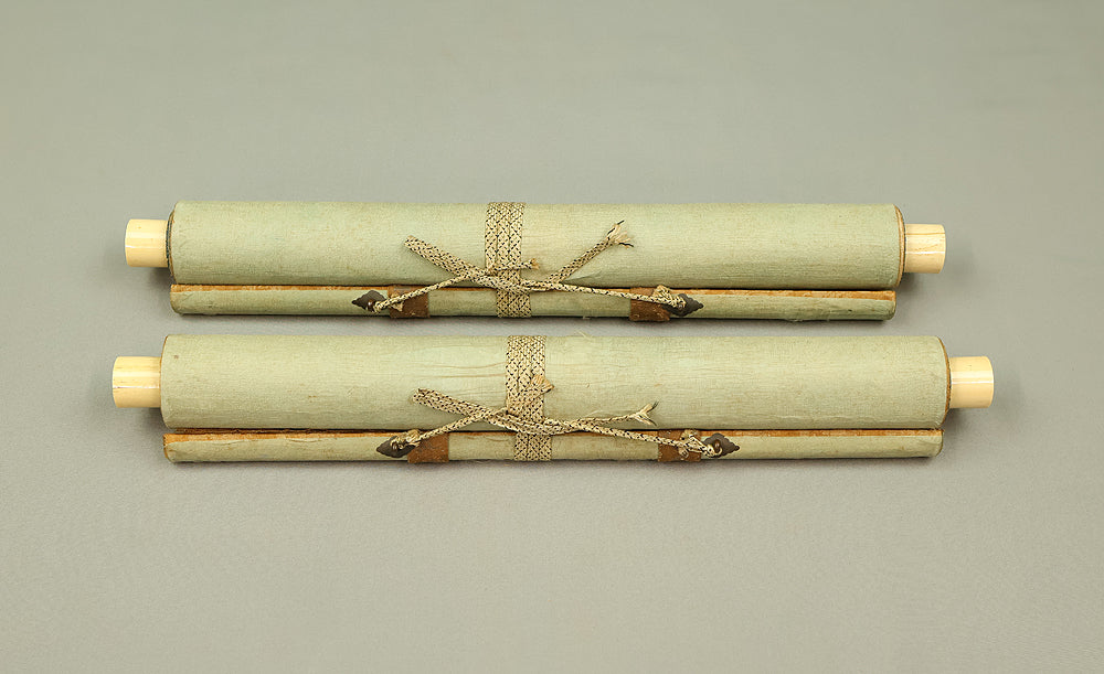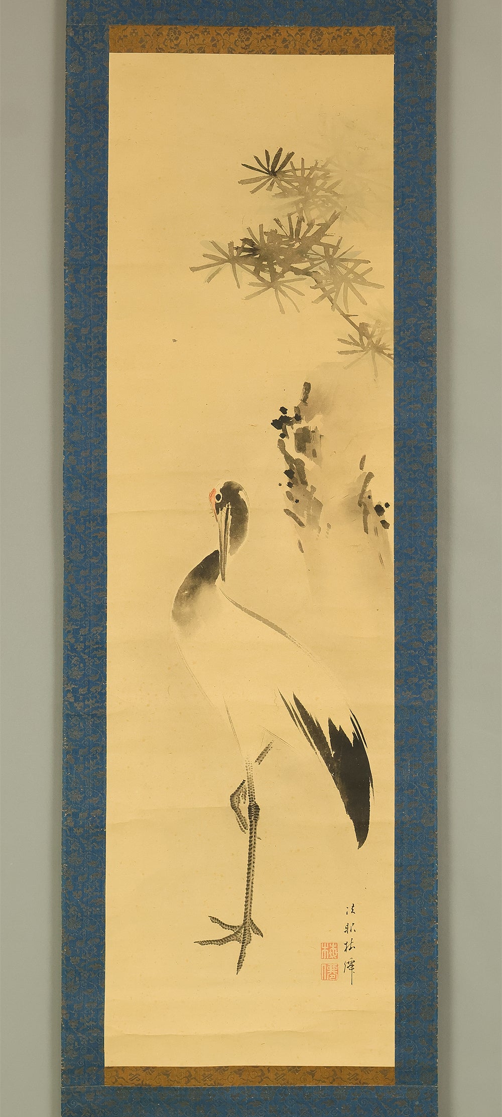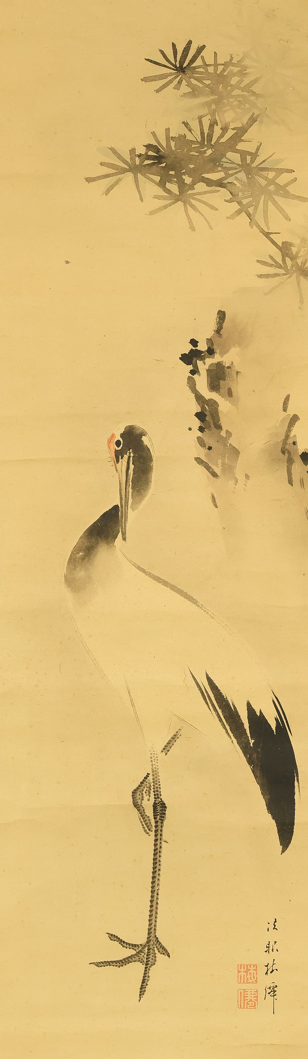 This pair of Japanese hanging scrolls, signed “Hōgen Baisen” (法眼梅僊) and sealed “Baisen” (梅僊), presents a refined and auspicious composition featuring a crane and a turtle—symbols of longevity and harmony—set among pine trees and seasonal foliage. The left scroll depicts a turtle resting on a rocky surface, while the right shows a crane standing gracefully among bamboo, both rendered in delicate ink with subtle tonal variation. The brushwork is elegant and restrained, evoking a quiet dignity in line with classical Japanese aesthetics. The honorific title “Hōgen” indicates the artist’s elevated status, and the overall composition reflects a mature sensibility rooted in the traditions of bird-and-flower painting. The scrolls are mounted in fine brocade and offer a balanced, contemplative presence suitable for formal display.