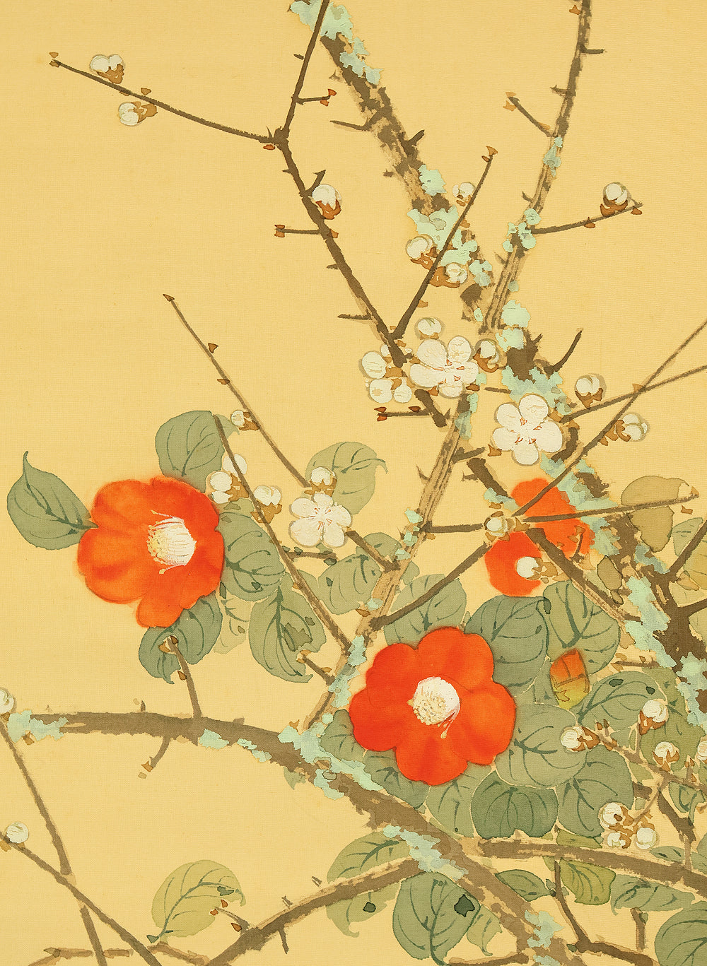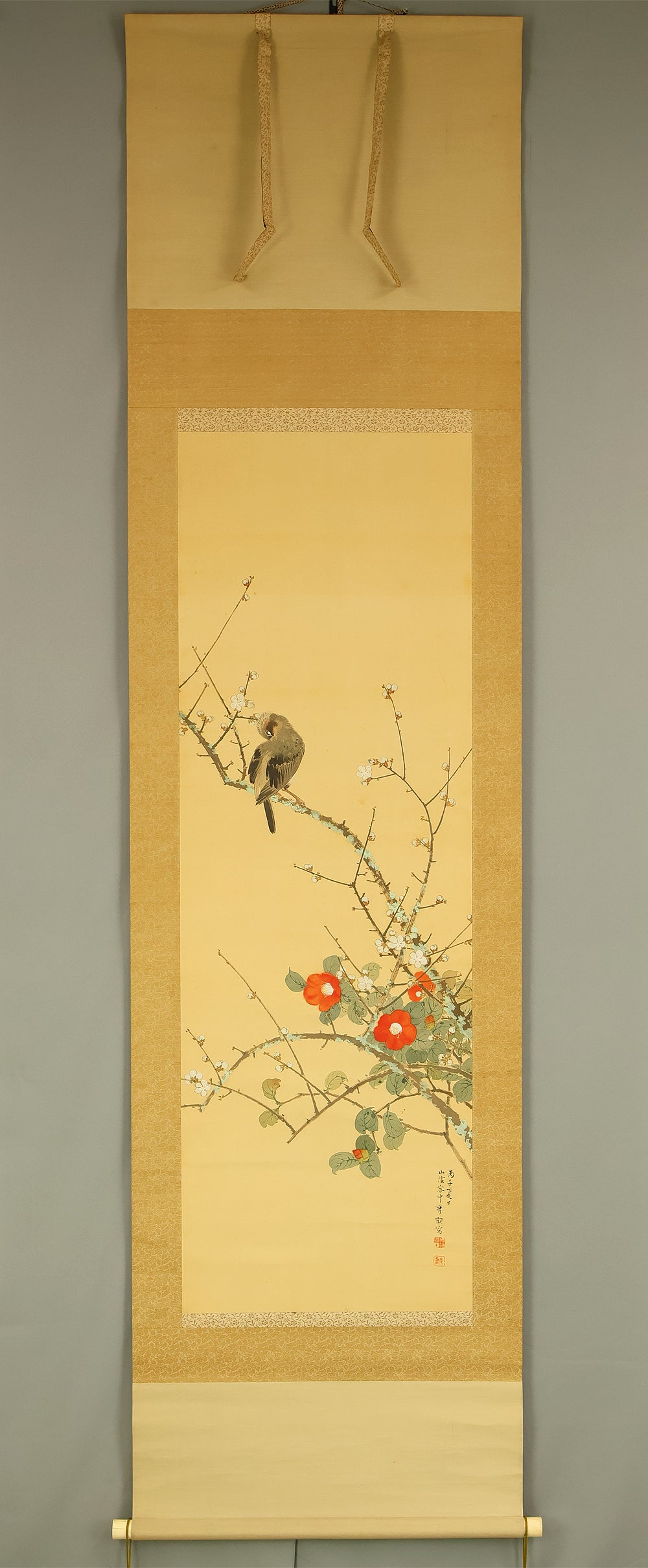 池上秀畝 Ikegami Shuho (1874-1944) Japanese antique art kakejiku kakemono wall hanging scroll / White Plum Blossoms, Crimson Camellias, and Mountain Bird with Original Box (Tomobako) RE243
