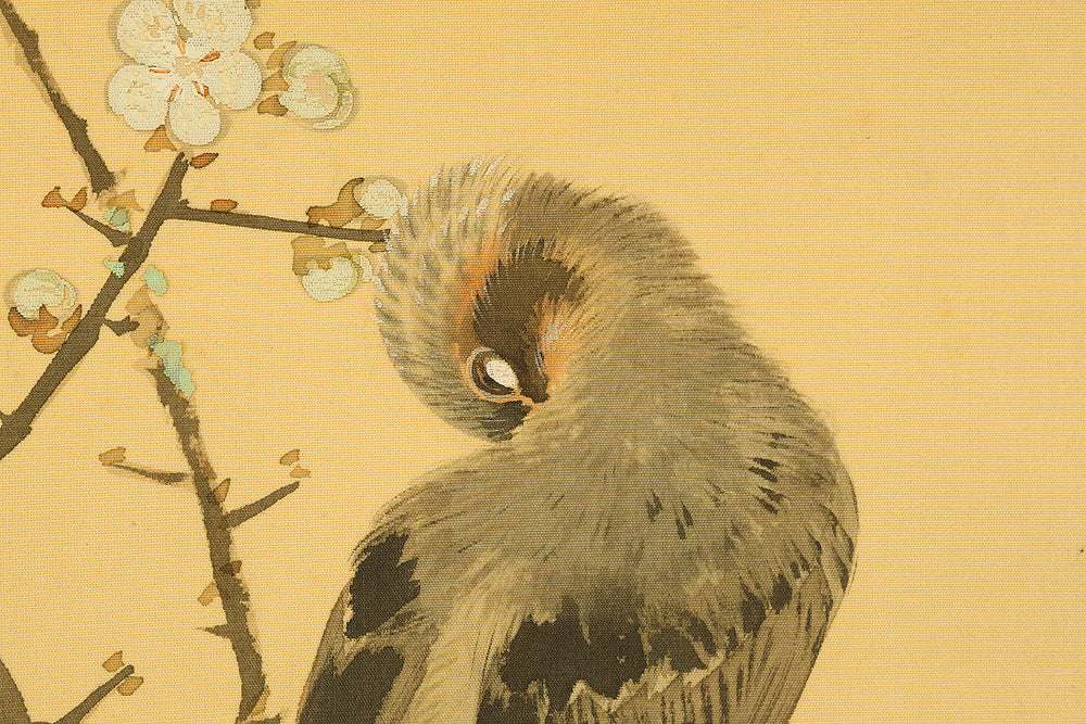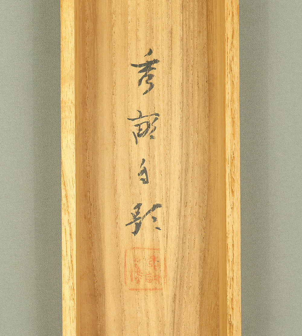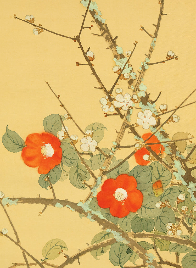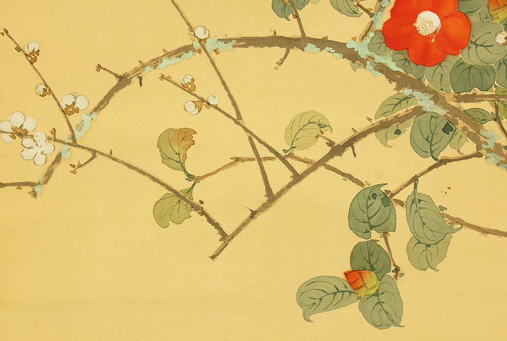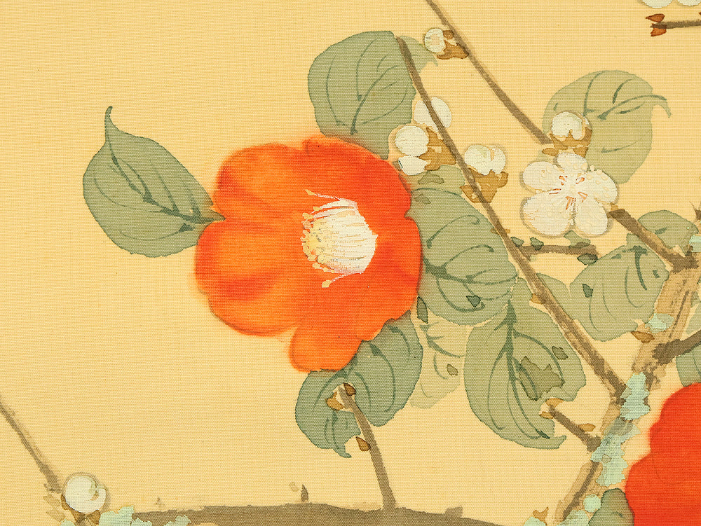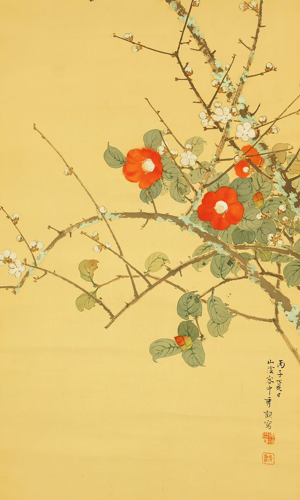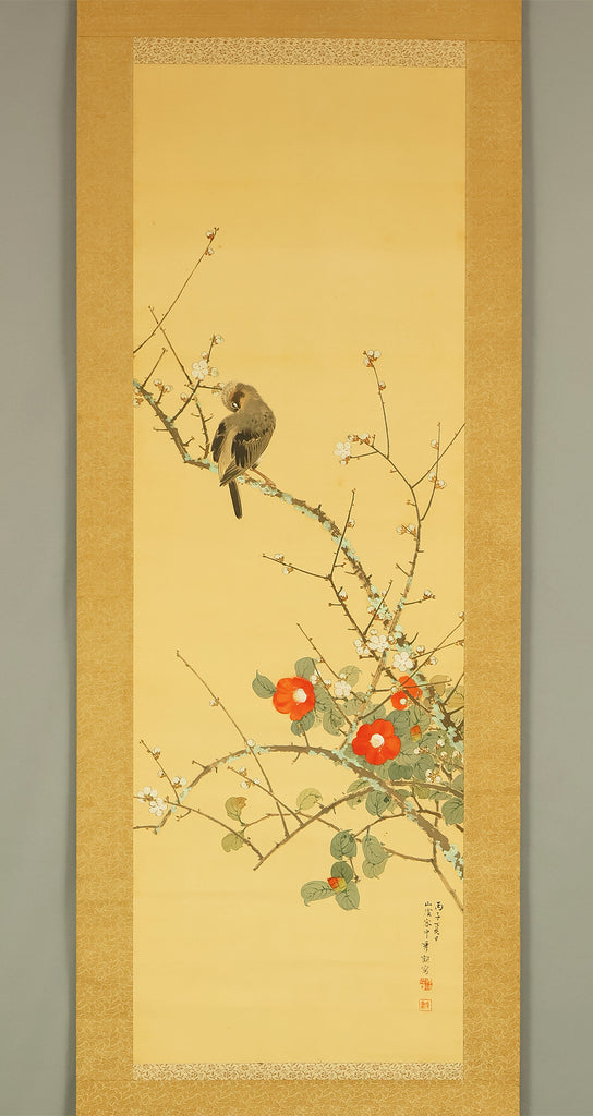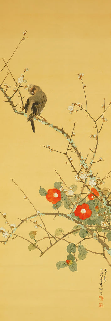 This elegant hanging scroll by Ikegami Shuho (1874–1944), dated Summer 1936 (丙子夏日), presents a refined composition of white plum blossoms, crimson camellias, and a mountain bird perched quietly among the branches. The contrast between the delicate white and vivid red flowers evokes seasonal transition and poetic harmony, while the solitary bird adds a sense of stillness and introspection. Shuho, a distinguished painter of the Meiji and early Showa periods, trained under Araki Kanpo and gained acclaim for his mastery in Sansui (landscape) and kachōga (flower-and-bird) painting. His brushwork blends literati sensitivity with naturalistic detail, capturing both the vitality and quietude of the scene. The scroll bears his signature “Shuho” (秀畝) and seal “Fushindoshu” (傅神洞主), affirming its authenticity. Housed in its original box (tomobako), this work exemplifies the lyrical elegance and seasonal nuance central to classical Japanese aesthetics.