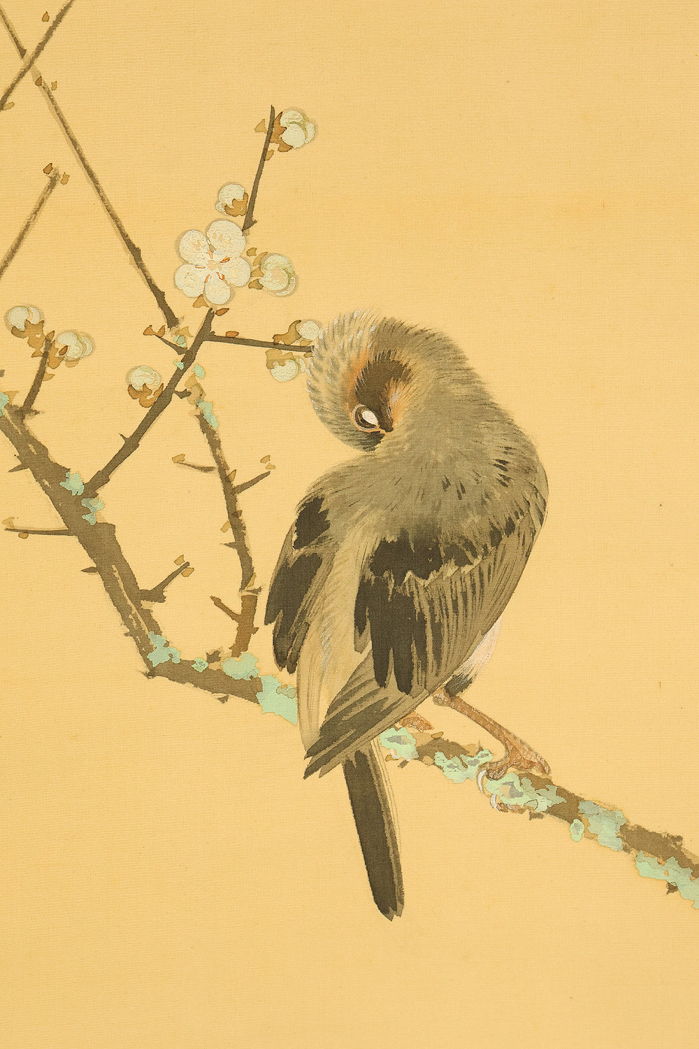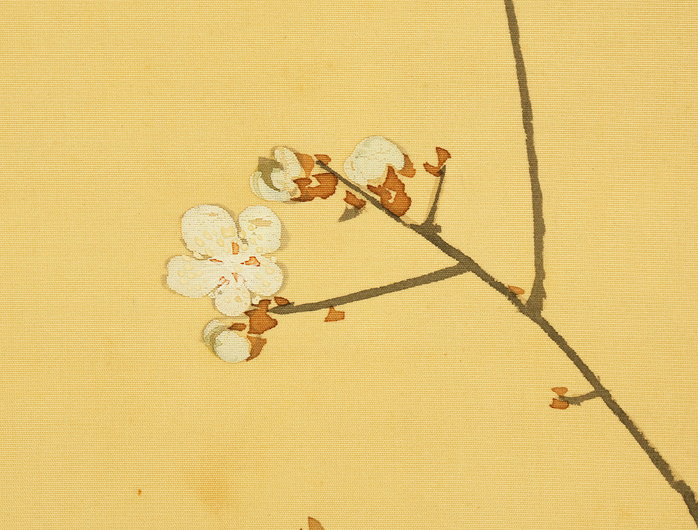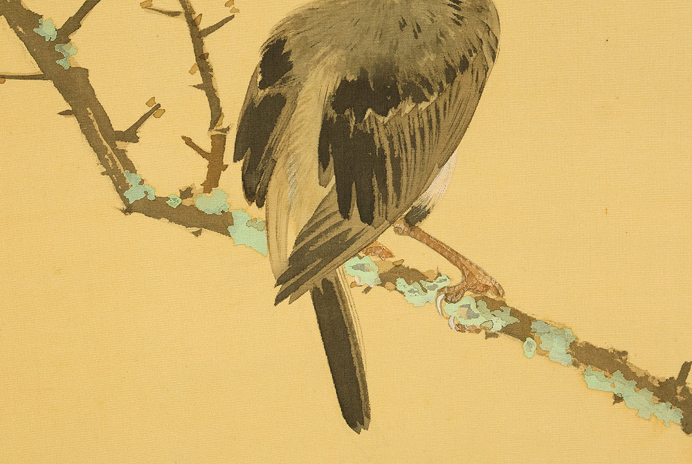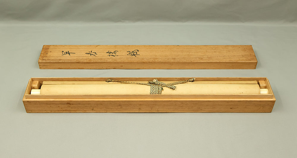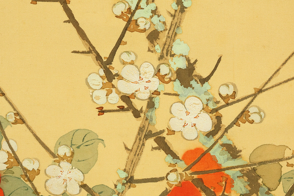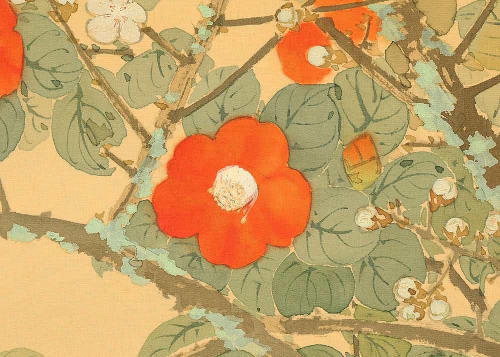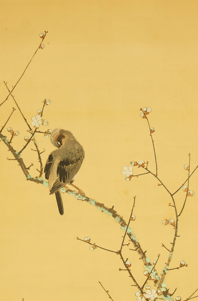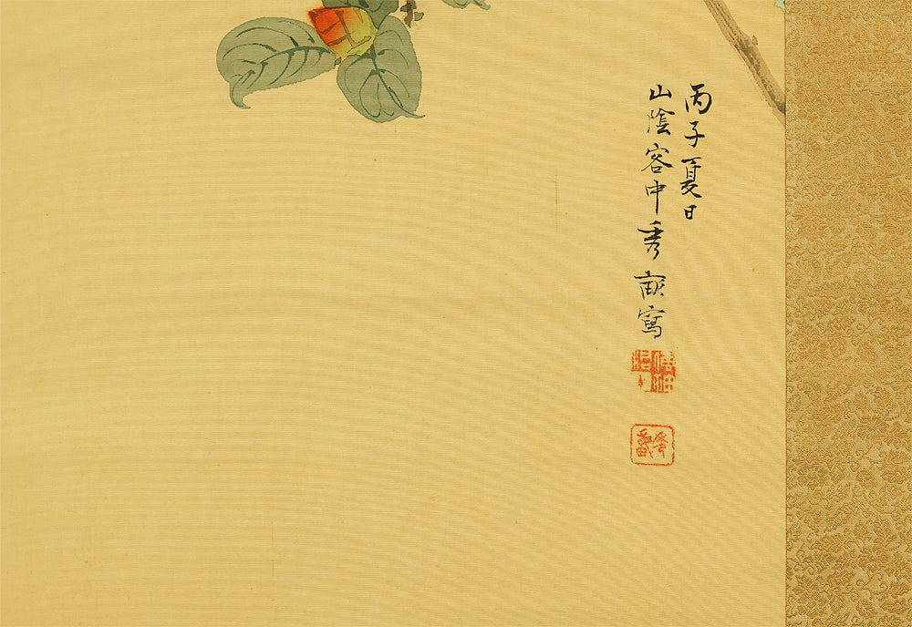 This elegant hanging scroll by Ikegami Shuho (1874–1944), dated Summer 1936 (丙子夏日), presents a refined composition of white plum blossoms, crimson camellias, and a mountain bird perched quietly among the branches. The contrast between the delicate white and vivid red flowers evokes seasonal transition and poetic harmony, while the solitary bird adds a sense of stillness and introspection. Shuho, a distinguished painter of the Meiji and early Showa periods, trained under Araki Kanpo and gained acclaim for his mastery in Sansui (landscape) and kachōga (flower-and-bird) painting. His brushwork blends literati sensitivity with naturalistic detail, capturing both the vitality and quietude of the scene. The scroll bears his signature “Shuho” (秀畝) and seal “Fushindoshu” (傅神洞主), affirming its authenticity. Housed in its original box (tomobako), this work exemplifies the lyrical elegance and seasonal nuance central to classical Japanese aesthetics.