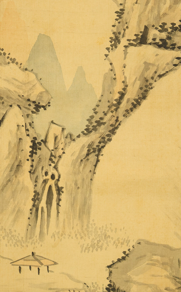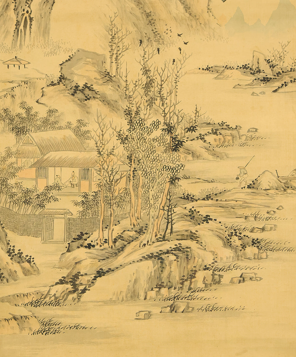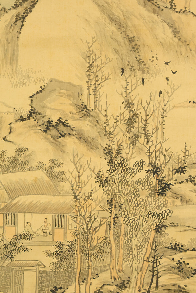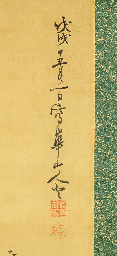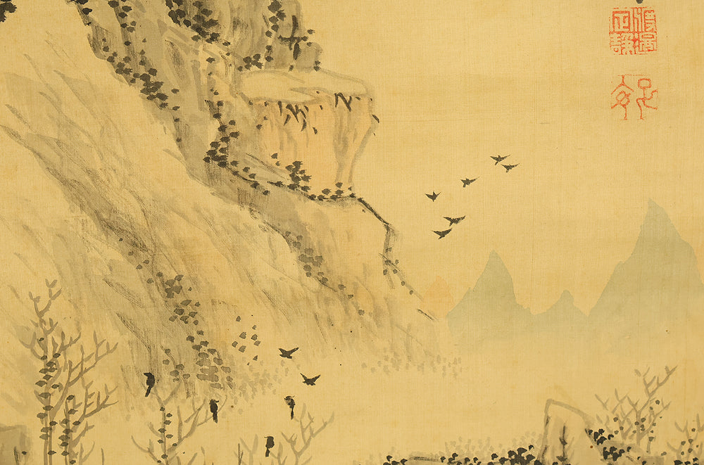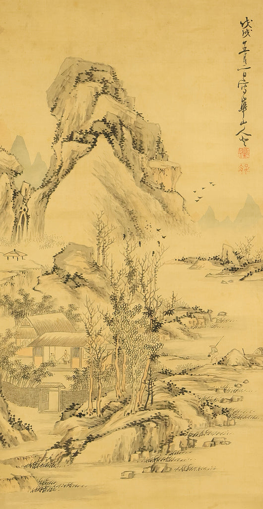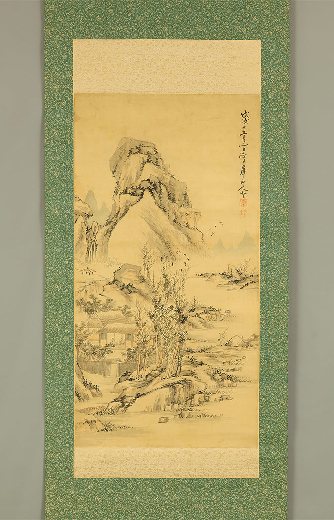 This evocative hanging scroll by Watanabe Kazan (1793–1841), dated May 1838 (戊戌五月), presents a contemplative sansui (landscape) scene titled “Autumn Vertically Rising Mountain and Hermitage”. The composition features a steep, towering peak rendered with dynamic brushwork, rising sharply into the mist—symbolizing solitude, resilience, and the vertical aspiration of the scholar’s spirit. Nestled within the terrain, a quiet hermitage suggests retreat, reflection, and harmony with nature. Kazan, a samurai-class painter and scholar, was known for blending Japanese literati aesthetics with Western realism, creating works that resonate with both philosophical depth and technical precision. His signature “Kazan” (崋山) and seals “Watanabe Teisei” (渡邉定静) and “Shian” (子安) affirm the scroll’s authenticity. This piece is accompanied by an appraisal box by Watanabe Kaseki (1852–1930), adding historical provenance and scholarly recognition. The scroll stands as a testament to Kazan’s unique artistic vision and his enduring legacy in Japanese art and intellectual history.