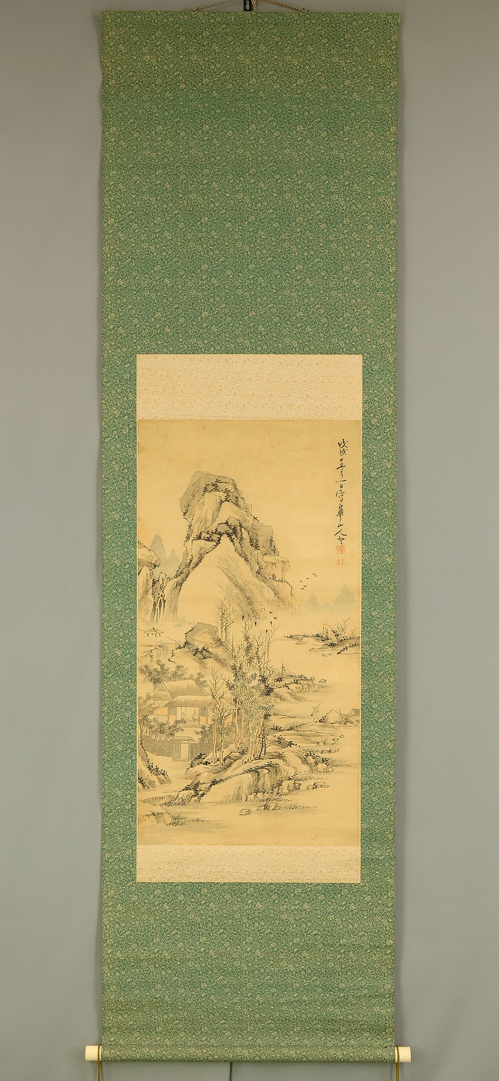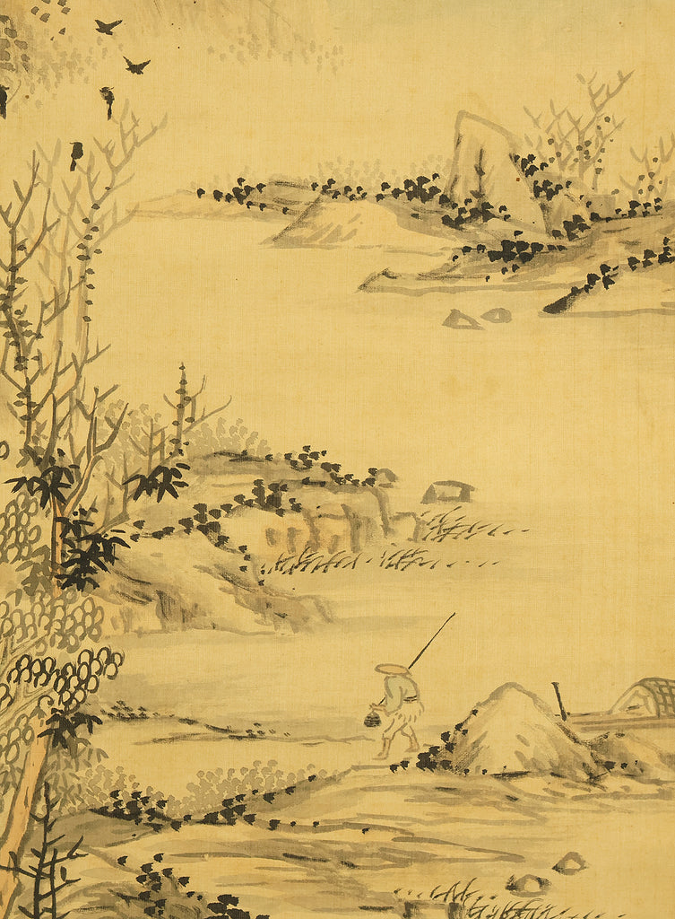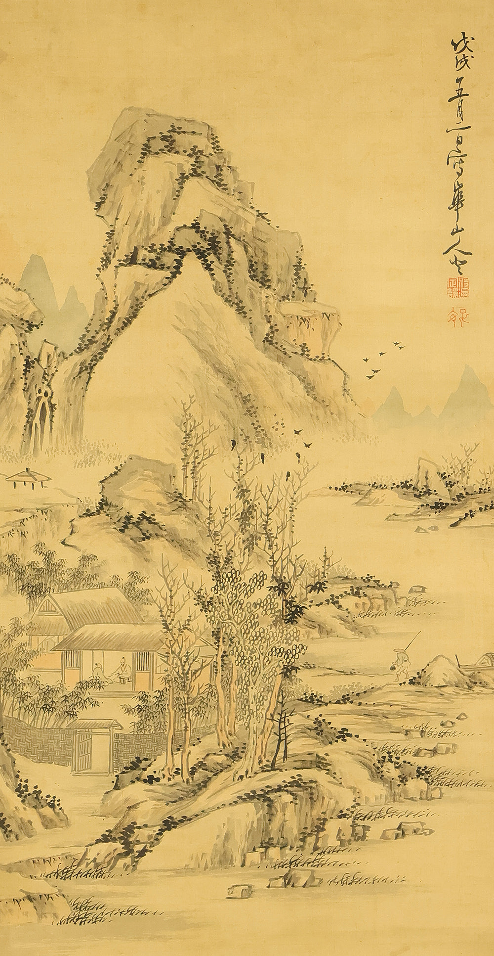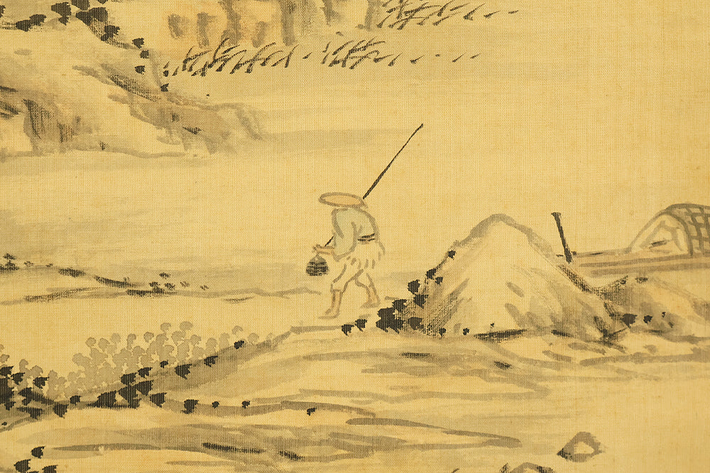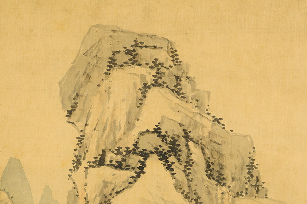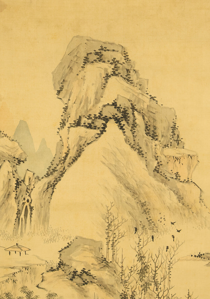 This evocative hanging scroll by Watanabe Kazan (1793–1841), dated May 1838 (戊戌五月), presents a contemplative sansui (landscape) scene titled “Autumn Vertically Rising Mountain and Hermitage”. The composition features a steep, towering peak rendered with dynamic brushwork, rising sharply into the mist—symbolizing solitude, resilience, and the vertical aspiration of the scholar’s spirit. Nestled within the terrain, a quiet hermitage suggests retreat, reflection, and harmony with nature. Kazan, a samurai-class painter and scholar, was known for blending Japanese literati aesthetics with Western realism, creating works that resonate with both philosophical depth and technical precision. His signature “Kazan” (崋山) and seals “Watanabe Teisei” (渡邉定静) and “Shian” (子安) affirm the scroll’s authenticity. This piece is accompanied by an appraisal box by Watanabe Kaseki (1852–1930), adding historical provenance and scholarly recognition. The scroll stands as a testament to Kazan’s unique artistic vision and his enduring legacy in Japanese art and intellectual history.