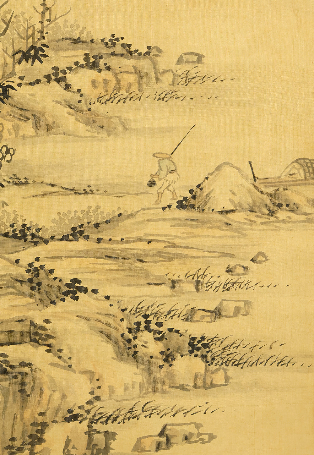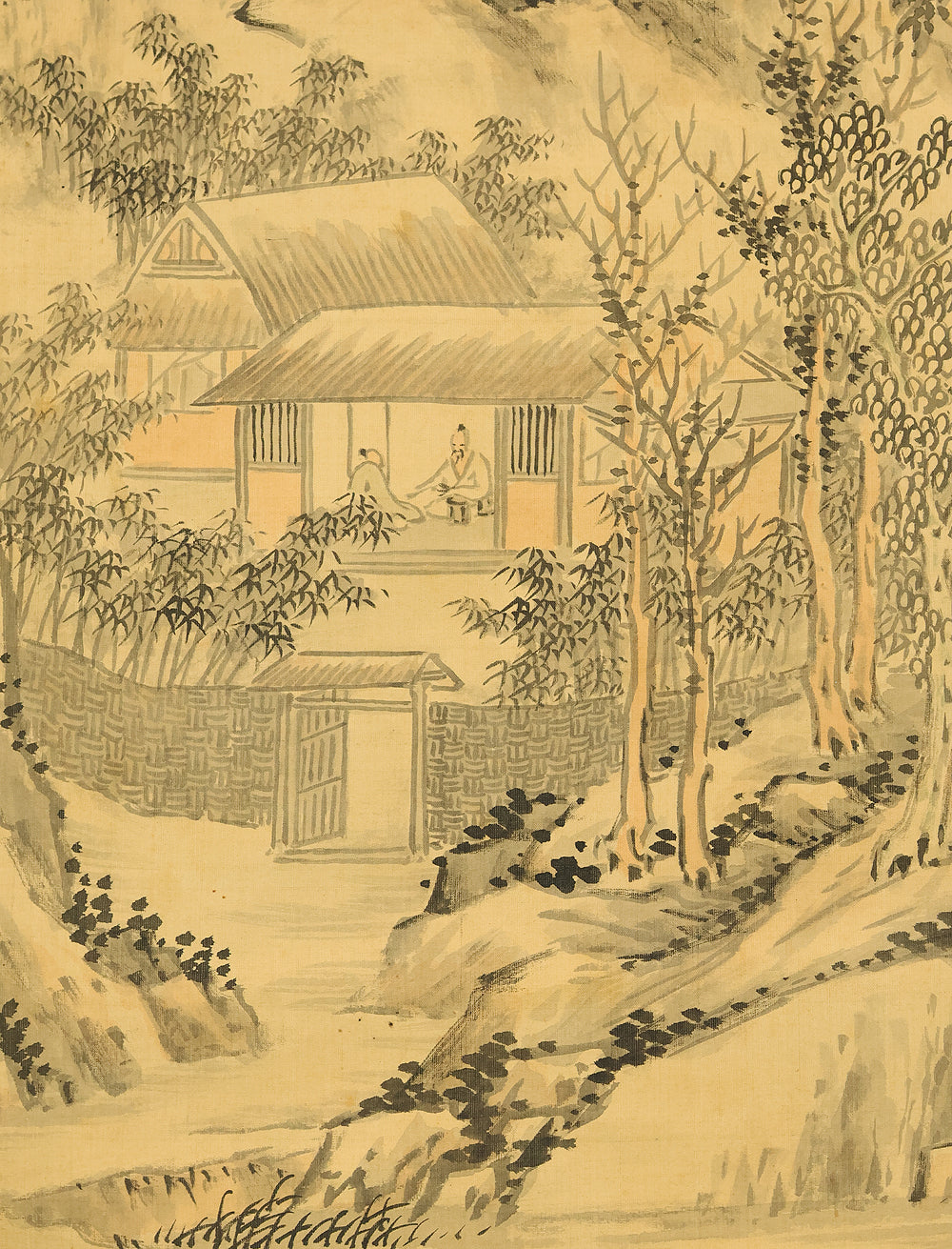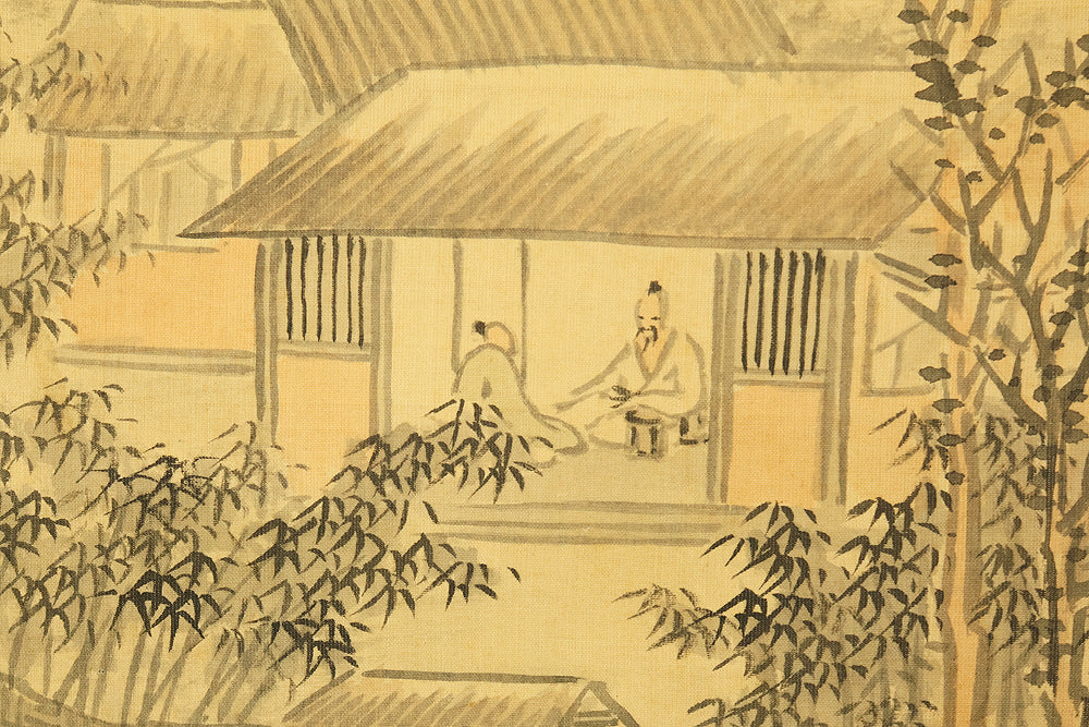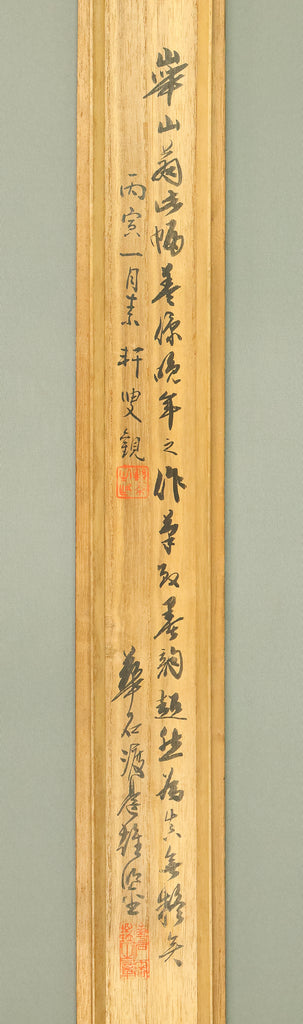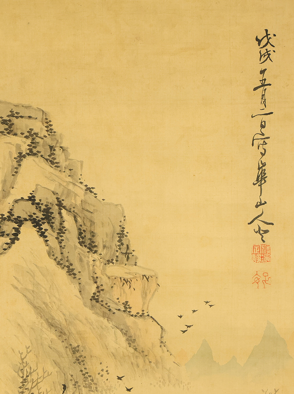This evocative hanging scroll by Watanabe Kazan (1793–1841), dated May 1838 (戊戌五月), presents a contemplative sansui (landscape) scene titled “Autumn Vertically Rising Mountain and Hermitage”. The composition features a steep, towering peak rendered with dynamic brushwork, rising sharply into the mist—symbolizing solitude, resilience, and the vertical aspiration of the scholar’s spirit. Nestled within the terrain, a quiet hermitage suggests retreat, reflection, and harmony with nature. Kazan, a samurai-class painter and scholar, was known for blending Japanese literati aesthetics with Western realism, creating works that resonate with both philosophical depth and technical precision. His signature “Kazan” (崋山) and seals “Watanabe Teisei” (渡邉定静) and “Shian” (子安) affirm the scroll’s authenticity. This piece is accompanied by an appraisal box by Watanabe Kaseki (1852–1930), adding historical provenance and scholarly recognition. The scroll stands as a testament to Kazan’s unique artistic vision and his enduring legacy in Japanese art and intellectual history.