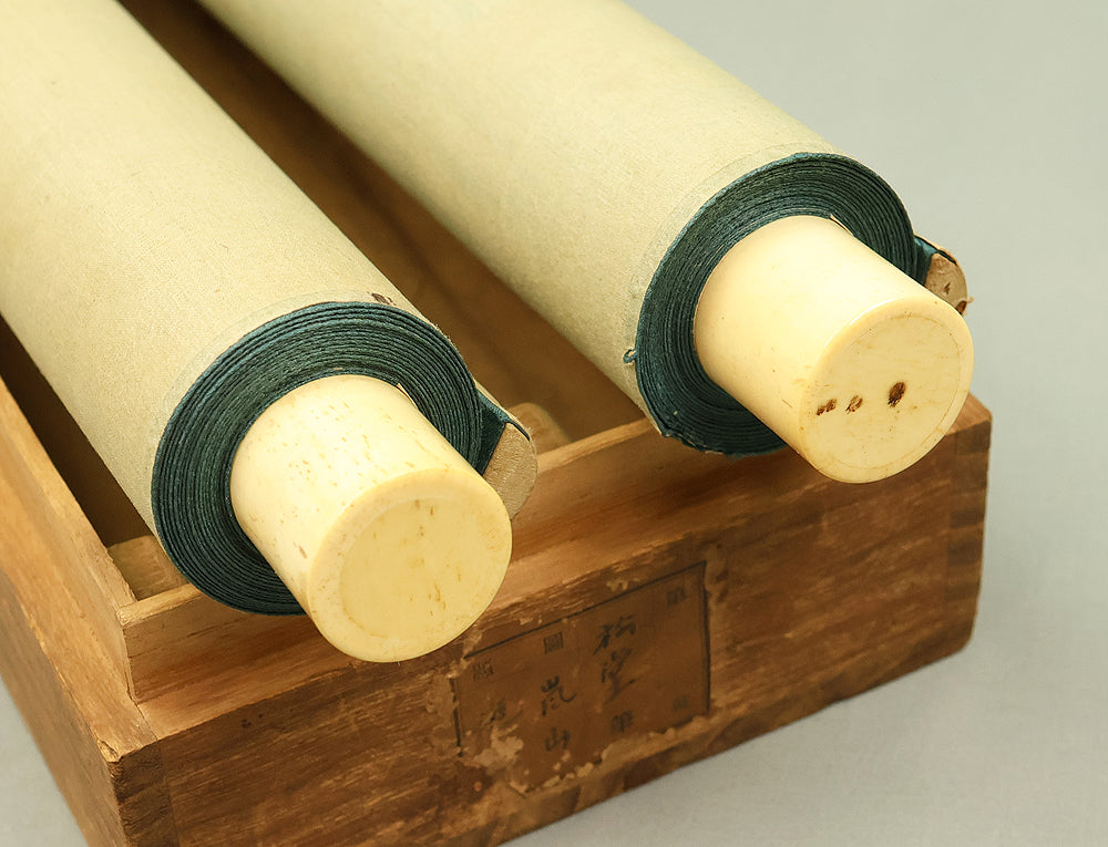 The pair of scrolls by Yukawa Shodō (1868–1955) unfolds like two seasons in conversation—spring’s gentle brightness set against the quiet depth of autumn. Trained first under Mitani Sadahiro and later under Suzuki Shōnen at the center of the Kyoto art world, Shodō developed a style that blends narrative warmth with the refined clarity of modern Kyoto painting. In the spring scene, figures gather by the water beneath blooming trees, their boat resting at the shore as mist softens the distant mountains. The autumn counterpart shifts to richer tones: red foliage, a cascading waterfall, and two figures seated on a cliffside, absorbed in calm exchange. Both works carry Shodō’s characteristic balance of atmosphere and detail, signed “Shodō hitsu” (松堂筆) with seals including “Yukawa Ai” (湯川愛) and “Rakuju” (楽壽). Displayed together, the pair creates a gentle rhythm in the room—an ebb and flow between renewal and reflection—giving the space a sense of movement across the year, as if the viewer were quietly passing through the landscapes themselves. The set comes with its box and has been carefully preserved.