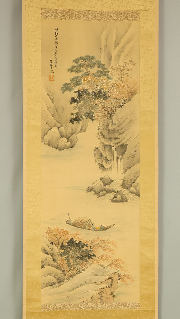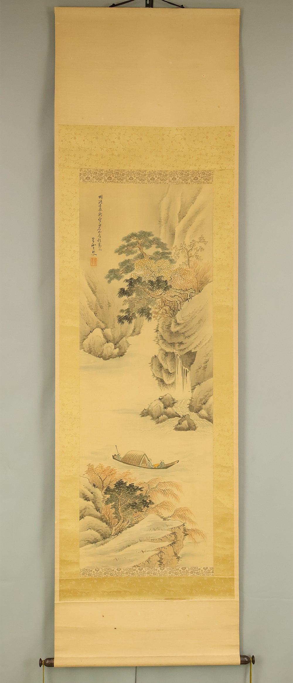 田崎草雲 Tazaki Soun (1815-1898) Japanese art kakejiku kakemono wall hanging scroll / 赤壁山水 Red Cliff Landscape - Boating and Cliff with Box RE241