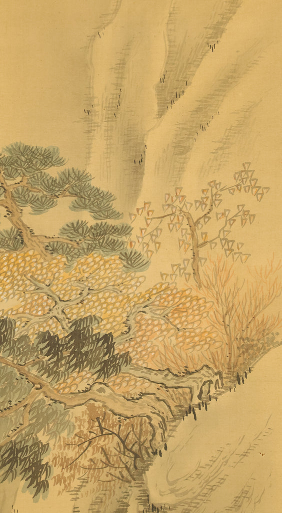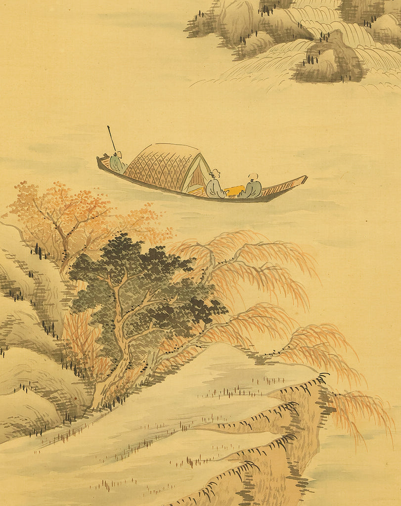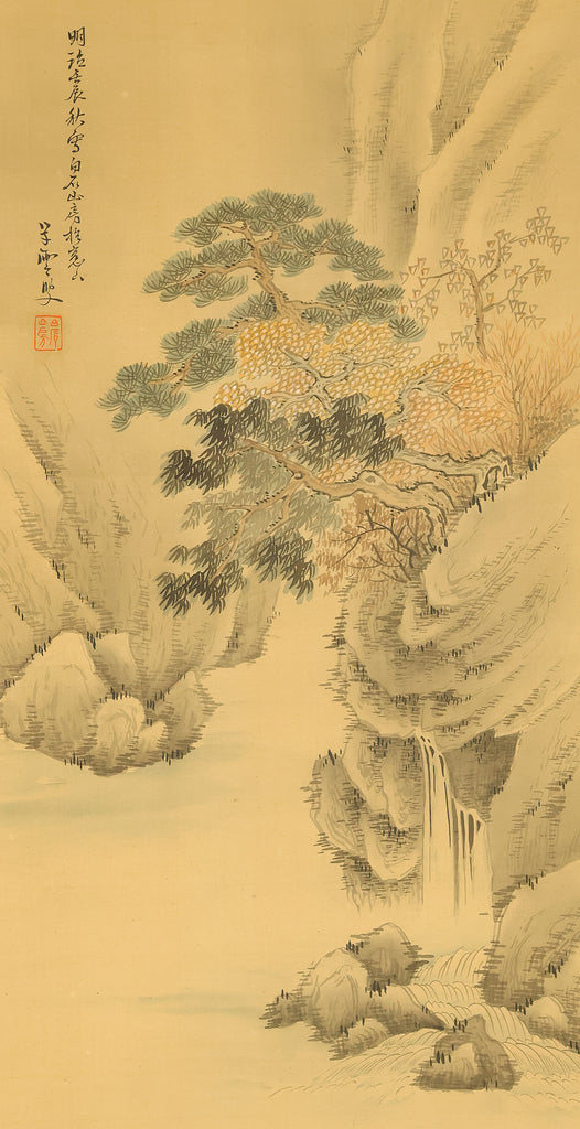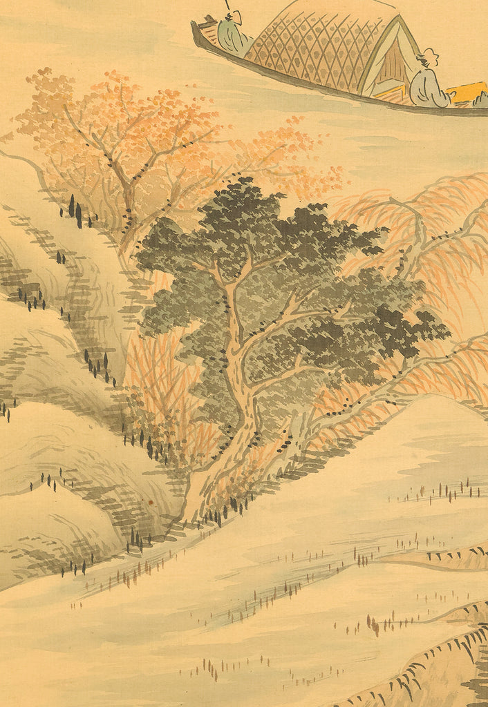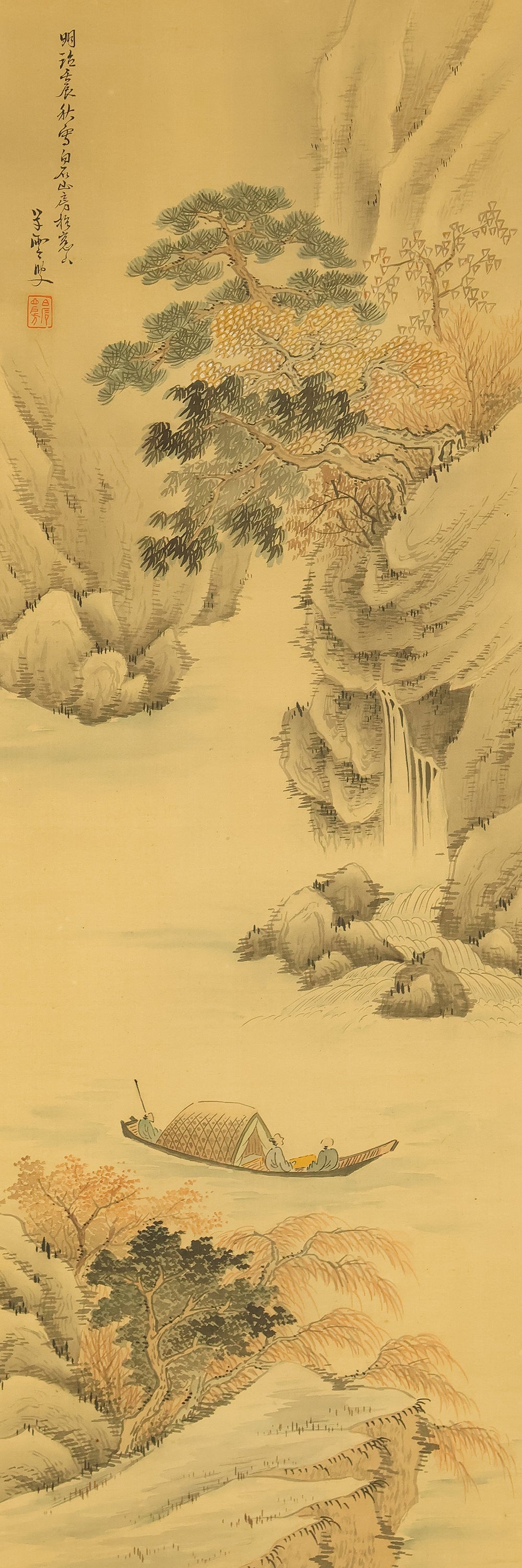 This atmospheric hanging scroll by Tazaki Soun (1815–1898), dated Autumn 1892 (明治壬辰秋日), depicts the classical theme of Red Cliff Landscape (赤壁山水)—a subject inspired by Su Shi’s celebrated Ode to the Red Cliff. The scene shows a small boat gliding along a quiet river beneath towering cliffs and autumn foliage, evoking the poetic mood of reflection, impermanence, and harmony with nature that defines the Red Cliff tradition. Soft brushwork and gentle ink tones create a sense of depth and calm, capturing the literati ideal of finding philosophical insight within the landscape. Lightly echoing Soun’s background as a leading nanga painter of the Meiji period, the scroll bears the signature “Soun sō” (草雲叟) and seal “Hakuseki Sanbō” (白石山房). Accompanied by a box, the work stands as a serene and contemplative interpretation of one of East Asia’s most enduring poetic landscapes.