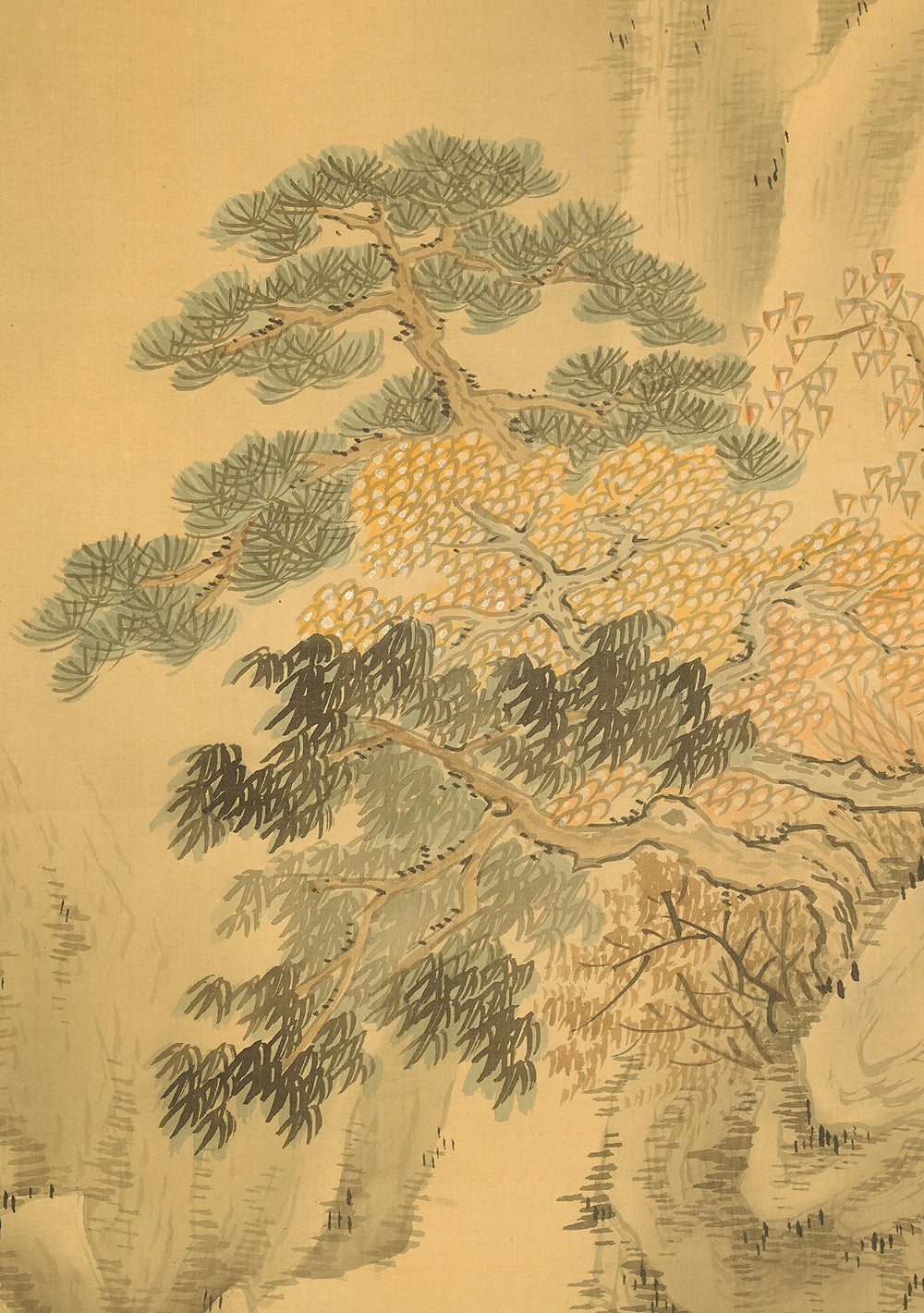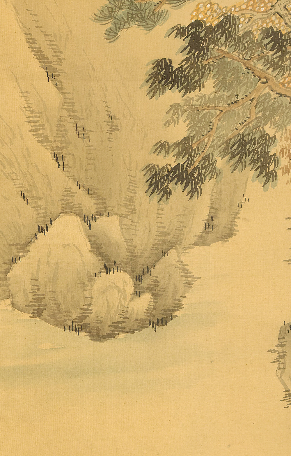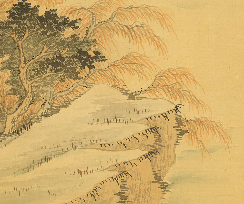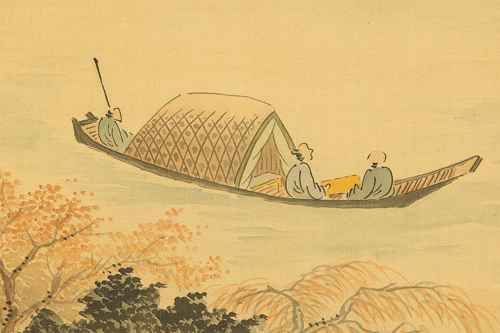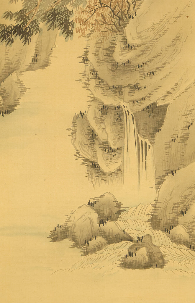 This atmospheric hanging scroll by Tazaki Soun (1815–1898), dated Autumn 1892 (明治壬辰秋日), depicts the classical theme of Red Cliff Landscape (赤壁山水)—a subject inspired by Su Shi’s celebrated Ode to the Red Cliff. The scene shows a small boat gliding along a quiet river beneath towering cliffs and autumn foliage, evoking the poetic mood of reflection, impermanence, and harmony with nature that defines the Red Cliff tradition. Soft brushwork and gentle ink tones create a sense of depth and calm, capturing the literati ideal of finding philosophical insight within the landscape. Lightly echoing Soun’s background as a leading nanga painter of the Meiji period, the scroll bears the signature “Soun sō” (草雲叟) and seal “Hakuseki Sanbō” (白石山房). Accompanied by a box, the work stands as a serene and contemplative interpretation of one of East Asia’s most enduring poetic landscapes.