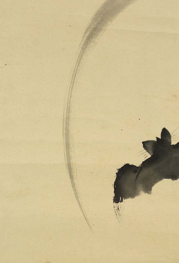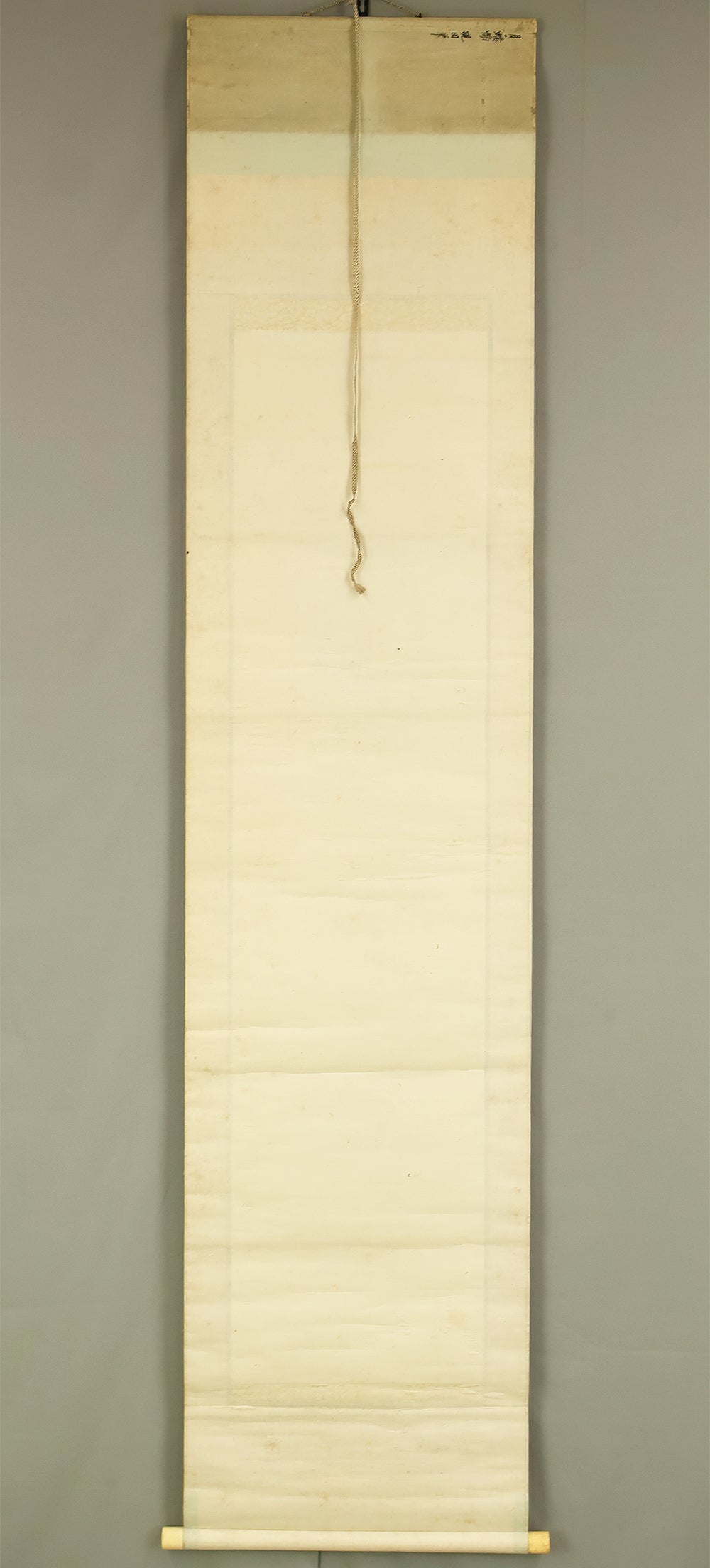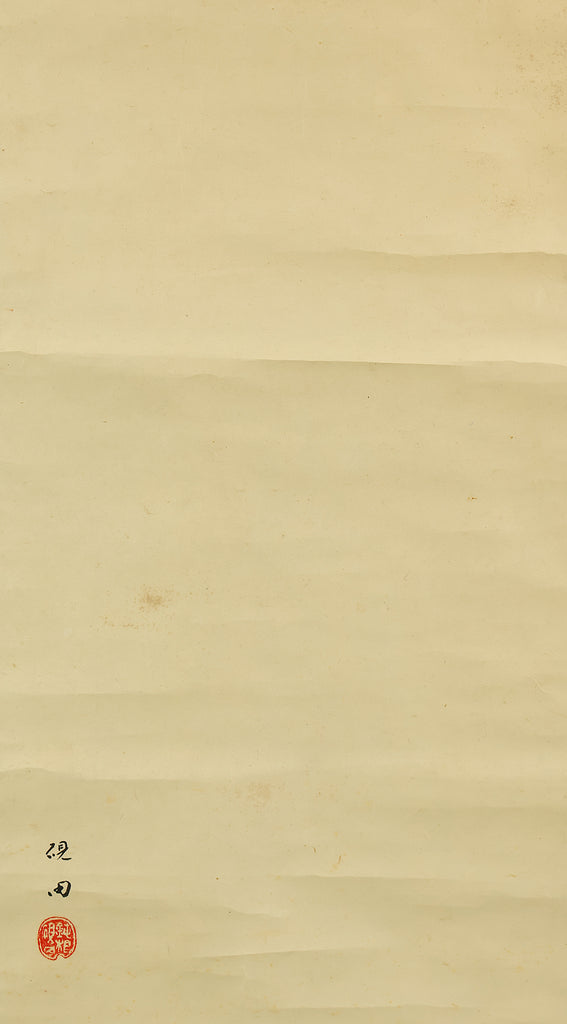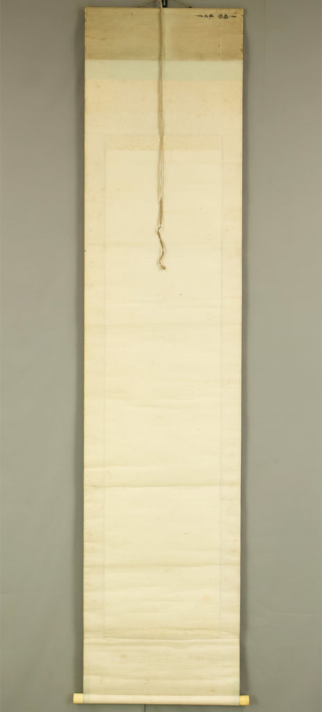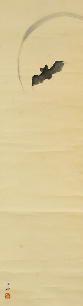 This minimalist hanging scroll by Kenden (硯田), signed and sealed “Donso Kenden” (鈍相硯田), presents a striking composition titled “Moon and Bat”. Executed in expressive ink brushwork, the solitary bat in flight beneath a pale, crescent-like arc evokes a quiet nocturnal moment—imbued with both motion and stillness. The sparse use of ink and ample negative space reflect the aesthetic principles of Zen painting, where suggestion and atmosphere take precedence over detail. The bat, often a symbol of good fortune in East Asian art, paired with the moon’s gentle presence, creates a scene that is both auspicious and contemplative. Kenden’s brushwork is confident yet restrained, allowing the viewer to feel the rhythm of flight and the hush of night. Mounted as a traditional kakejiku (hanging scroll) and accompanied by its original box, this piece offers a refined balance of symbolism, simplicity, and poetic mood—ideal for collectors drawn to the quiet power of ink painting.