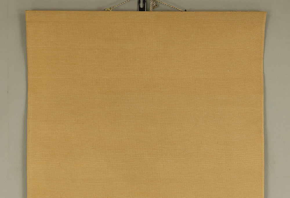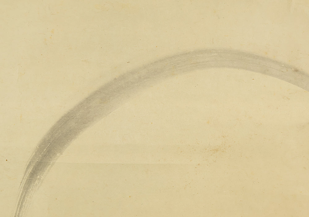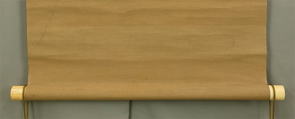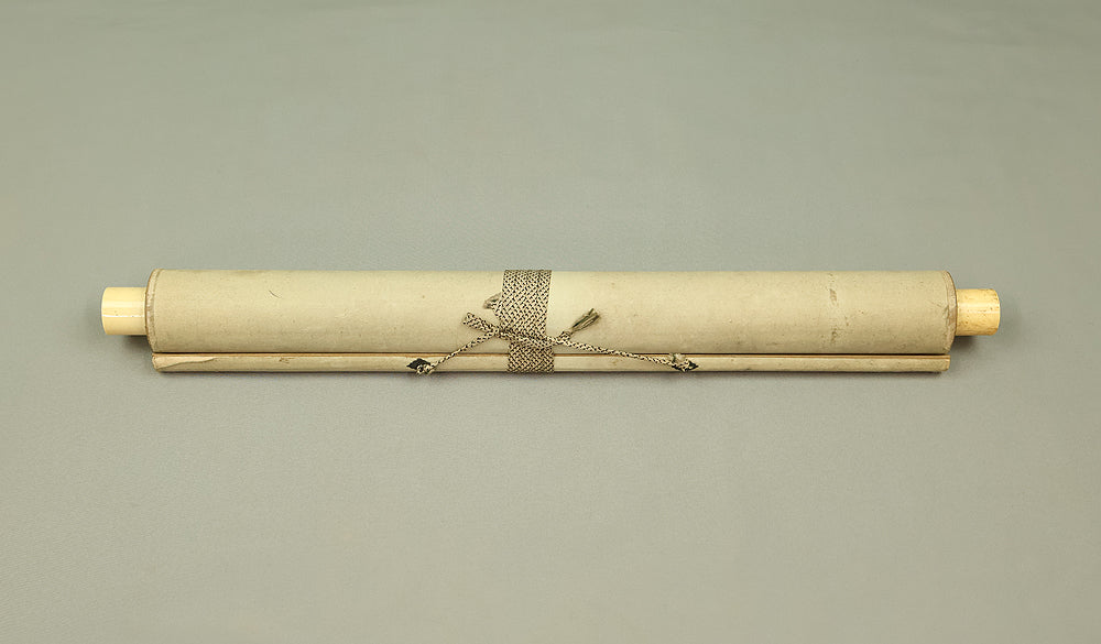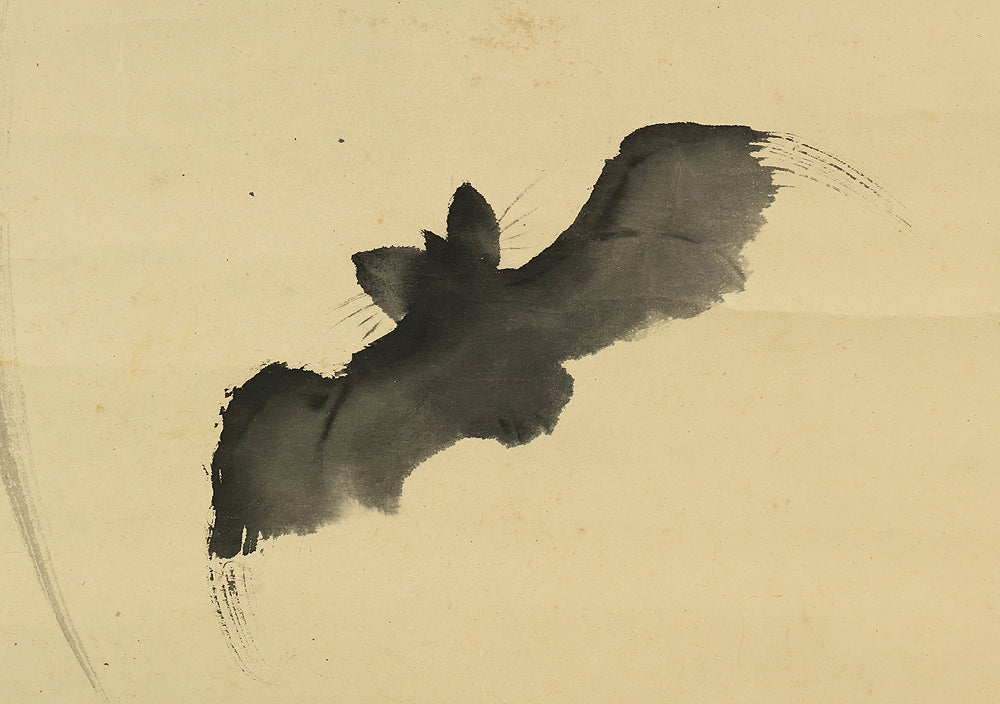 This minimalist hanging scroll by Kenden (硯田), signed and sealed “Donso Kenden” (鈍相硯田), presents a striking composition titled “Moon and Bat”. Executed in expressive ink brushwork, the solitary bat in flight beneath a pale, crescent-like arc evokes a quiet nocturnal moment—imbued with both motion and stillness. The sparse use of ink and ample negative space reflect the aesthetic principles of Zen painting, where suggestion and atmosphere take precedence over detail. The bat, often a symbol of good fortune in East Asian art, paired with the moon’s gentle presence, creates a scene that is both auspicious and contemplative. Kenden’s brushwork is confident yet restrained, allowing the viewer to feel the rhythm of flight and the hush of night. Mounted as a traditional kakejiku (hanging scroll) and accompanied by its original box, this piece offers a refined balance of symbolism, simplicity, and poetic mood—ideal for collectors drawn to the quiet power of ink painting.