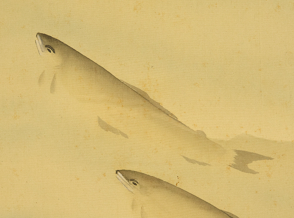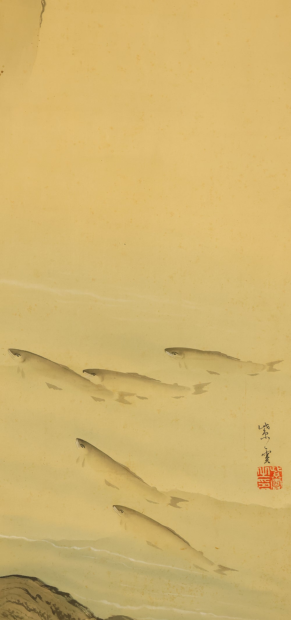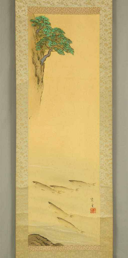 紫雲 Shiun Japanese art kakejiku kakemono wall hanging scroll / Ayu Sweetfish Swimming under Rock RE334