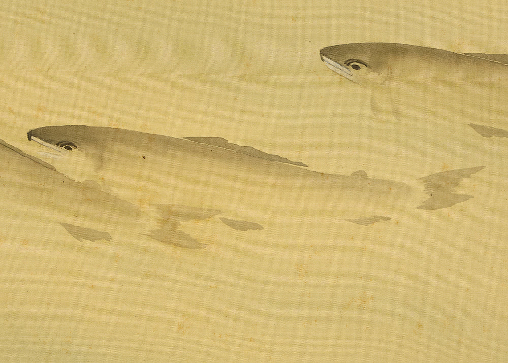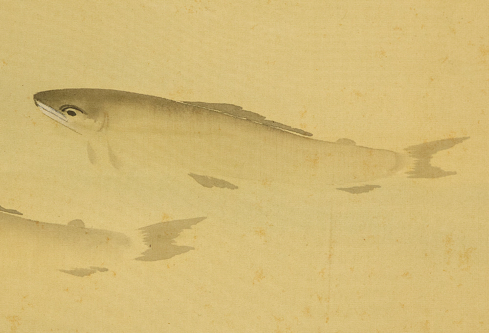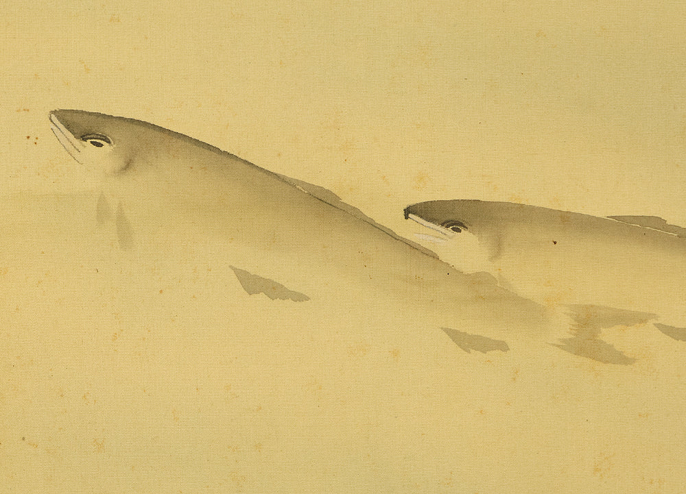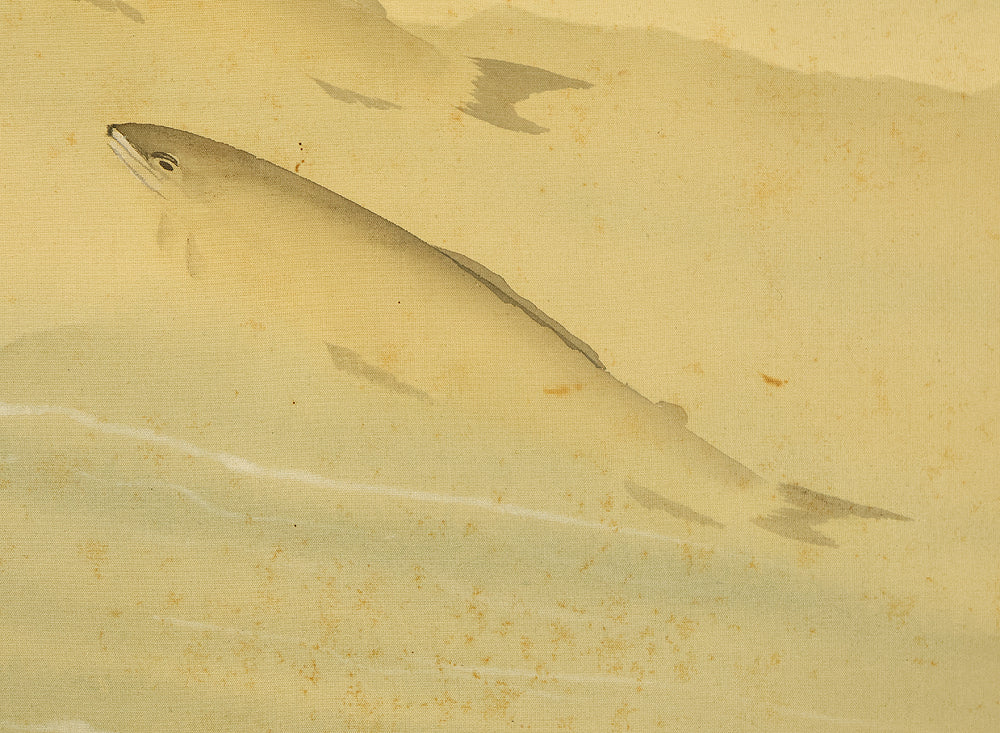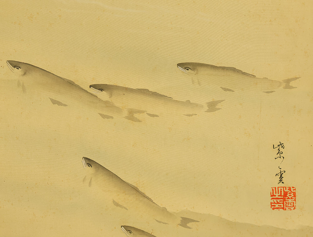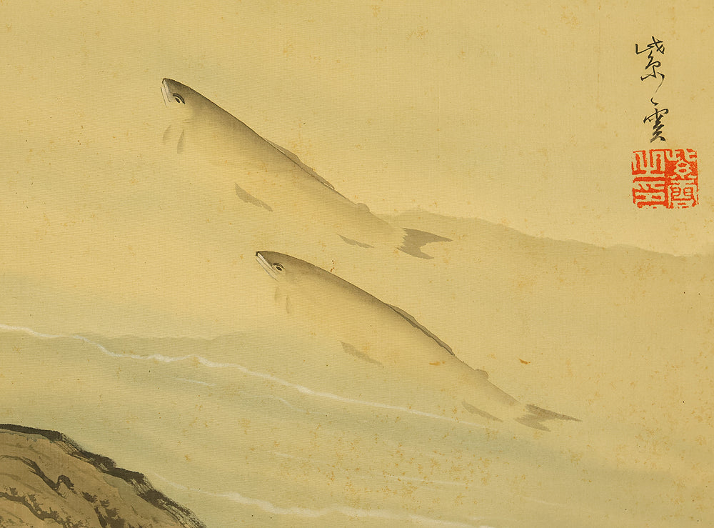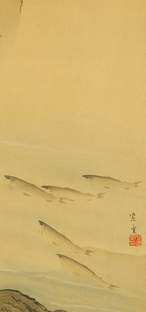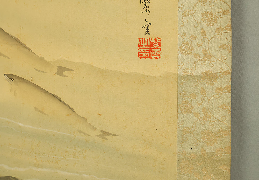 This Japanese hanging scroll features a graceful ink painting of ayu (sweetfish) swimming upstream beneath a rocky overhang, rendered with delicate brushwork and rhythmic flow. The composition captures the natural elegance and quiet determination of the fish, a motif often associated with perseverance and seasonal vitality in Japanese art. Signed “Shiun” (紫雲) and sealed “Shiun no in” (紫雲之印), the work reflects the artist’s refined sensibility and mastery of suiboku (ink wash) technique, emphasizing movement, harmony, and the serene beauty of nature.