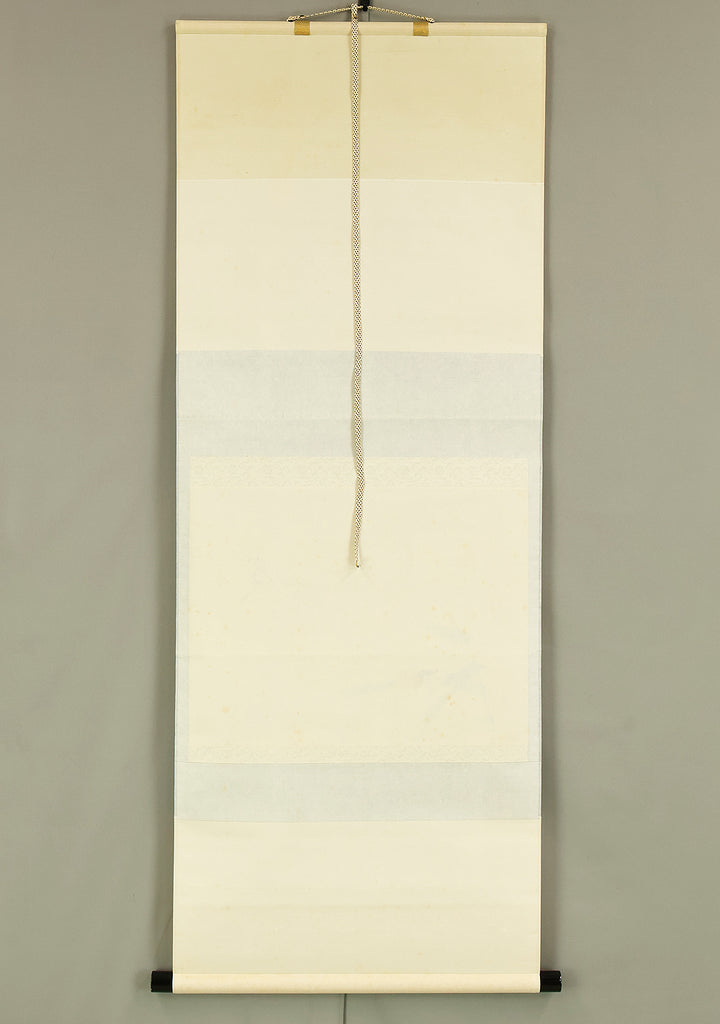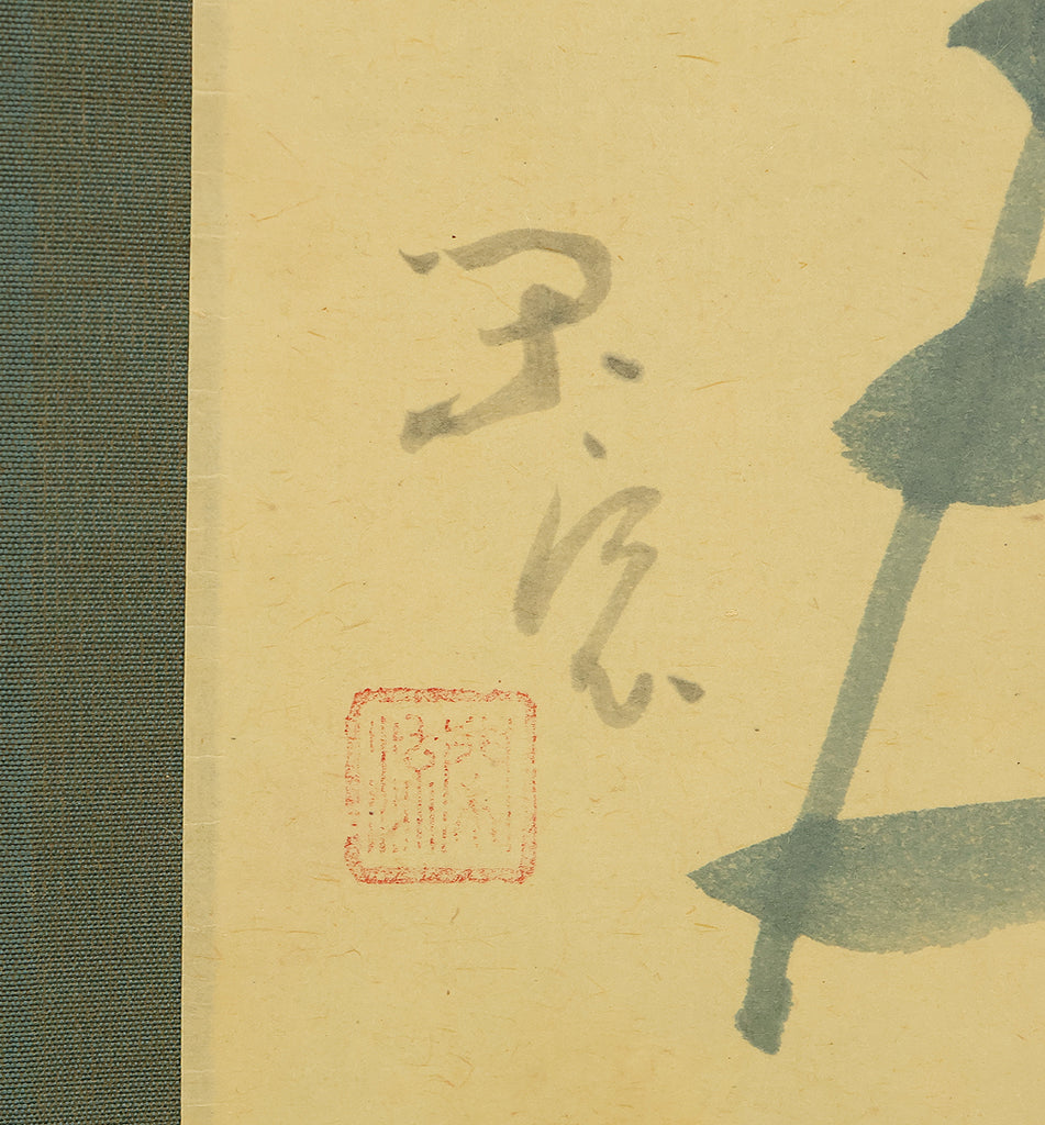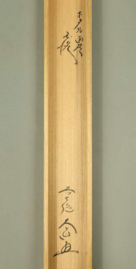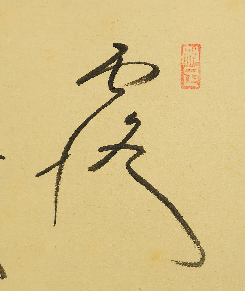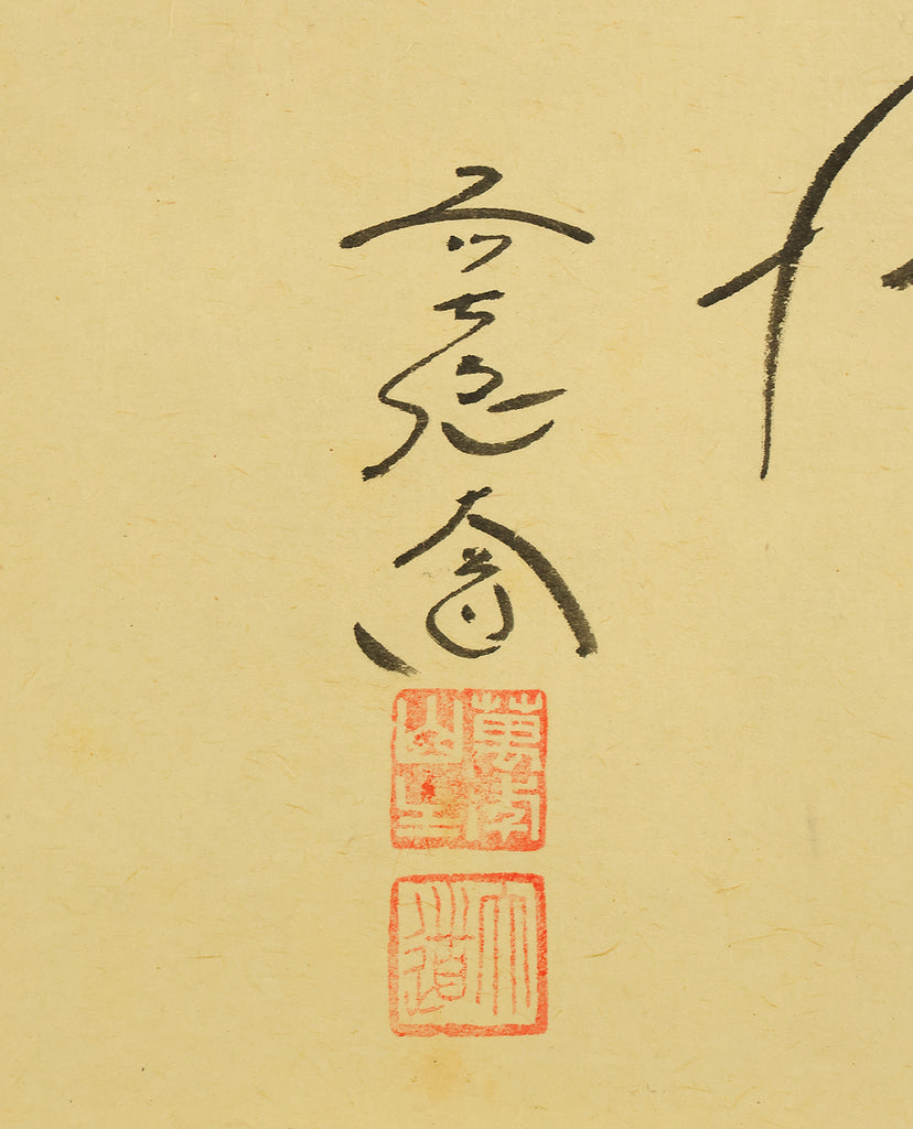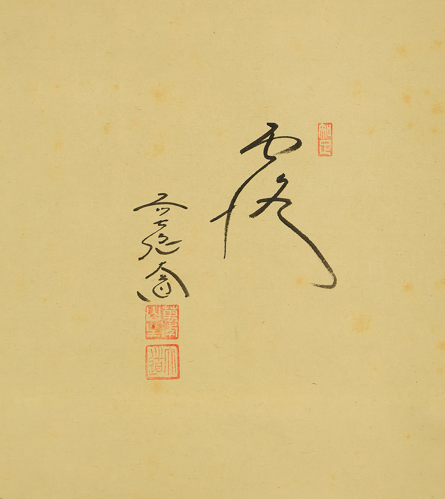 This Zen hanging scroll by Nishigaki Daido (西垣大道, b.1942)—chief priest of Gokurakuzen-ji, Daitoku-ji—features the evocative inscription “露” (Tsuyu, Dew), paired with a delicate depiction of a firefly, symbolizing fleeting brilliance and quiet revelation. In Zen thought, Tsuyu represents the emergence of truth from the unseen, much like dew forming from vapor—an analogy for the Buddha-nature manifesting in the most ordinary moments and actions. Signed “Zen Daitoku Daido” (前大徳 大道) and sealed “Mannen sanshu” (萬年山主) and “Daido” (大道), the scroll is accompanied by its original box (tomobako), affirming its authenticity and reverent preservation. This piece embodies the contemplative clarity and poetic subtlety of modern Rinzai Zen calligraphy, offering a quiet yet profound focal point for meditation, tea practice, or interior display.